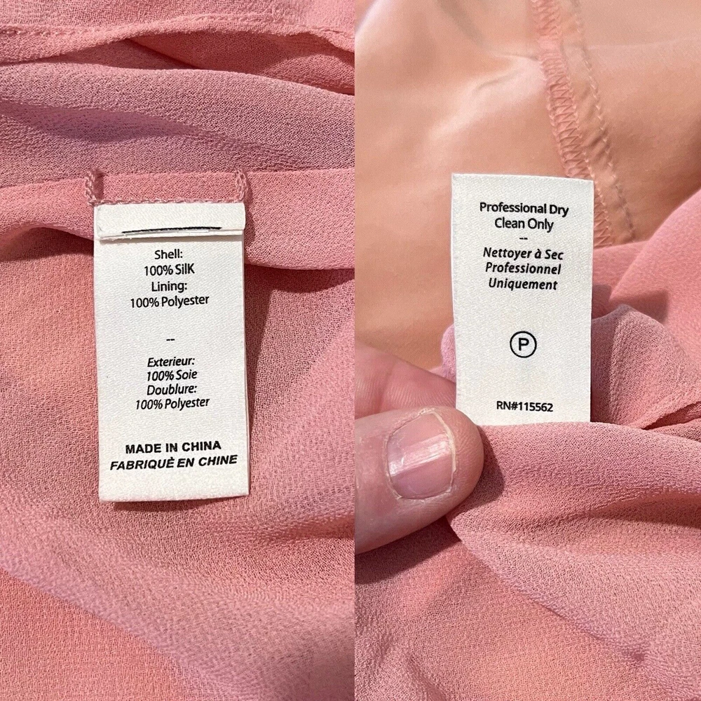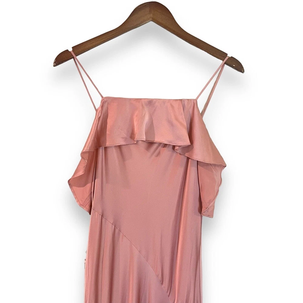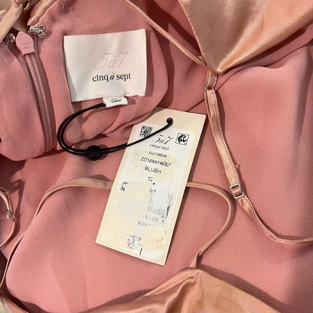 Cinq à Sept Blush Pink Elly Ruffle 100% Silk Maxi Slip Dress Size 12. New with tags but there are a couple small spots in the folds of ruffle on the front that should come out once dry cleaned. I only noticed them while taking photos. Please see last photo. Original retail price $595. * Lined * Ruffled asymmetrical hemline * Back zip closure * 100% silk * Dry clean only Chest: 18” flat across underarms Waist: 15” flat across Length: 56” shoulder to longest part of hem Ships from a smoke free home.
