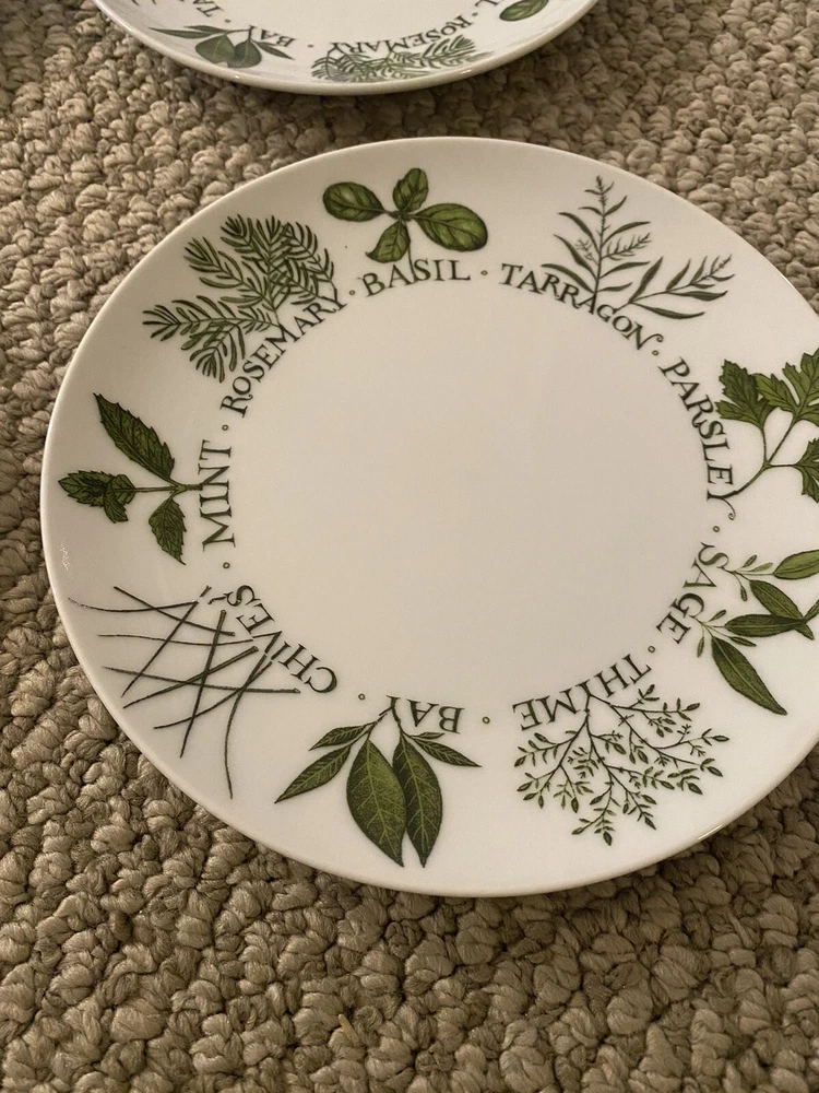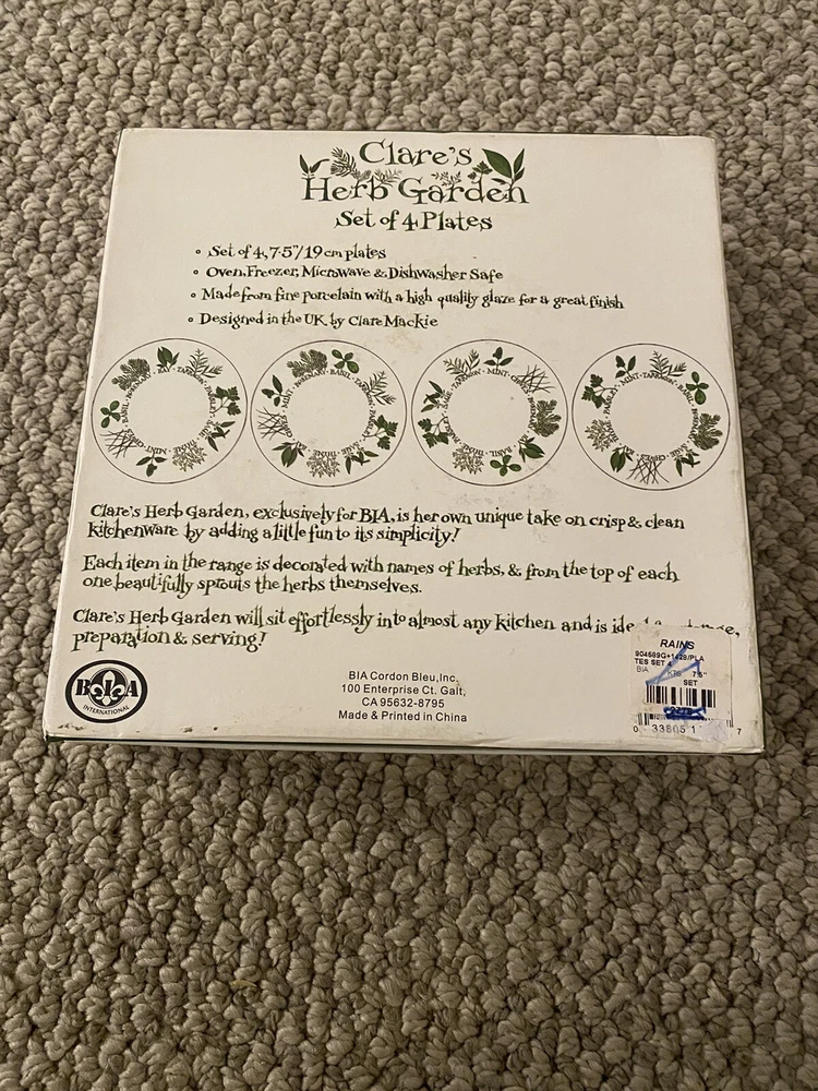 Absolutely lovely set of 4 appetizer or salad plates with herb design, never used in original box. Perfect condition. Great to use if you are putting out a charcuterie board!