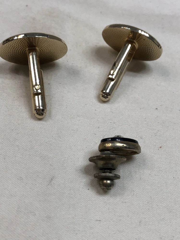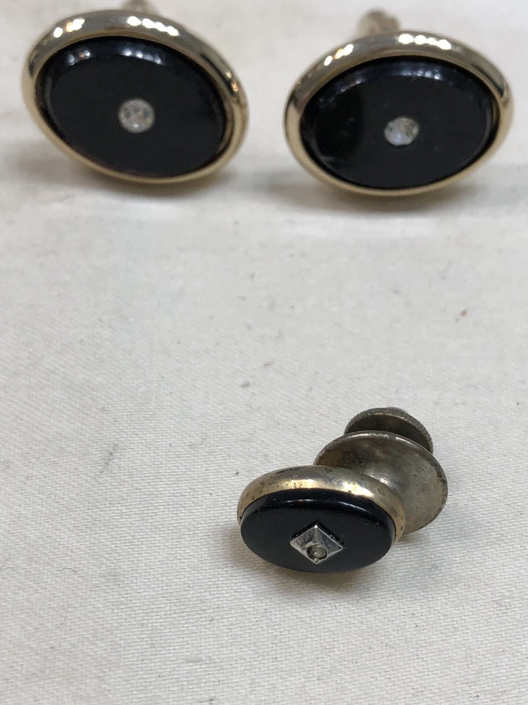 These preowned cuff links are classic ovals w/sparkling chips of either CZ’s or diamonds. The tie tack can be used as a lapel pin.