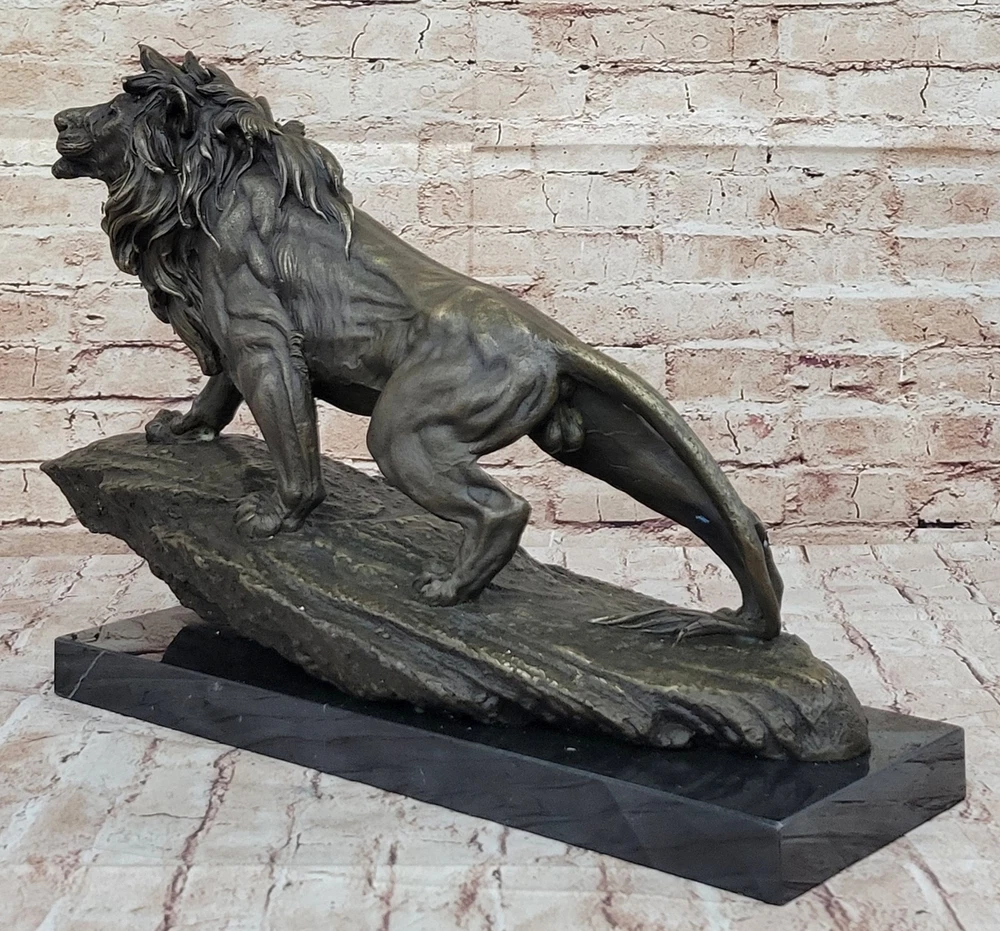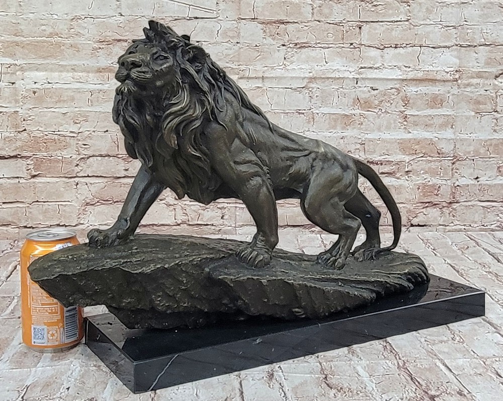Classic Pure Bronze Copper Africa Lion Statue Evil Foo Dog Lion Sculpture Gift Classic Pure Bronze Copper Africa Lion Statue Evil Foo Dog Lion Sculpture Gift Condition : This sculpture is in perfect condition. Bronze Dimensions with Marble Base: Height 14" X Width 22" Marble Dimensions:18" X 6" Height without base:13" Weight:35 LBS Inventory:27YRD67814572 Behold the majestic presence of the regal lion in all its splendor, immortalized in this breathtaking bronze sculpture. As the golden sun dips below the horizon, casting its ethereal glow, the lion ascends a cliff with an air of undeniable authority. Its magnificent mane ripples in the plains winds, a testament to its untamed strength and dominance. With a commanding gaze, the lion surveys its kingdom, a realm teeming with life and vitality. This sculpture captures not only the lion's physical prowess but also its symbolic significance—a representation of courage, power, dignity, and the unwavering spirit of royalty. Crafted with meticulous attention to detail, this handmade bronze sculpture is a true testament to the artistry of the lost-wax casting method. The intricate textures of the lion's fur, the intensity of its expression, and the sense of motion as it climbs the cliff are all masterfully rendered. A rich brown patina finish both protects and enhances the sculpture's timeless beauty, ensuring its endurance for generations to come. Resting upon a dignified black marble base, this artwork bears the signature of the esteemed artist Barye, a mark of quality and exceptional craftsmanship. Invite the regal essence of the lion into your space with this remarkable bronze sculpture. Whether displayed in a home, office, or gallery, it serves as a profound reminder of the lion's enduring symbolism and its role as a guardian of power and wisdom. As a focal point of admiration and contemplation, this sculpture encapsulates the very essence of majesty and strength. Extra Large Wild African Lion on Prowl Wildlife Safari Bronze Sculpture by Barye www.bronzhaus.com Video will open in a new window Using the eBay App? Paste link into a browser window: [isdntekvideo] Shipping Terms : Most of our items are shipped via USPS (United States Postal Service) mail or UPS. Most orders are shipped within 24-48 hours of purchase. Please be aware that not all items are available for USPS shipping due to size and weight. We do ship to Hawaii, Alaska, Canada, Puerto Rico, APO/AE, and U.S. Virgin Islands, however, an additional charge may be required. Please contact us before making any purchases in these areas. For Non-USA customers, you may be responsible for all duty, tax, brokerage fees that may be due upon delivery (shipping costs cover freight charges only). We also ship internationally. Please refer to the "Shipping and Handling" chart for the rates for each area. Payment : We accept just about any form of payment. PayPal, Master Card, Visa or American Express credit cards. Money orders, cashiers checks, and even personal or business checks. For governmental institutions, we will also accept a purchase order. Please understand that for personal or business checks we have to wait for the check to clear (usually 7 days) before shipping. Condition : New Detailed Hand Crafted Hot Cast Bronze Satisfaction Guaranteed. This is Stock Photo, Slight Color Variation!! Listing and template services provided by inkFrog