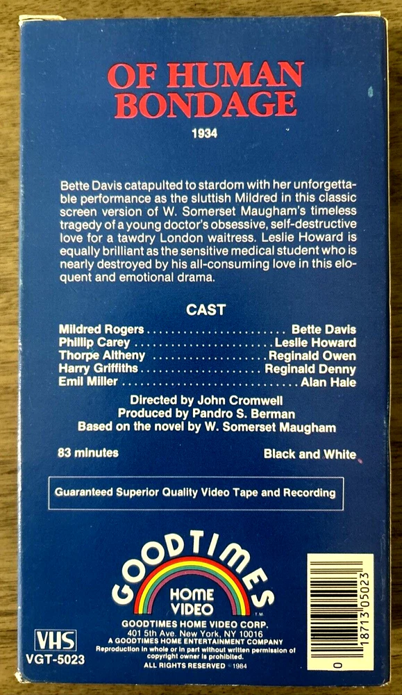 Former Rental:Nogtin13:0018713050236Actor:Kim Novak, Laurence Harvey, Robert MorleyGenre:DramaMovie/TV Title:Of Human BondageLeading Role:Leslie Howard, Bette Davis, Kay Johnson, Frances Dee, Alan HaleRating:NRUPC:0018713050236Special Features:Black & WhiteSignal Standard:NTSCDirector:John CromwellSub-Genre:Classical
