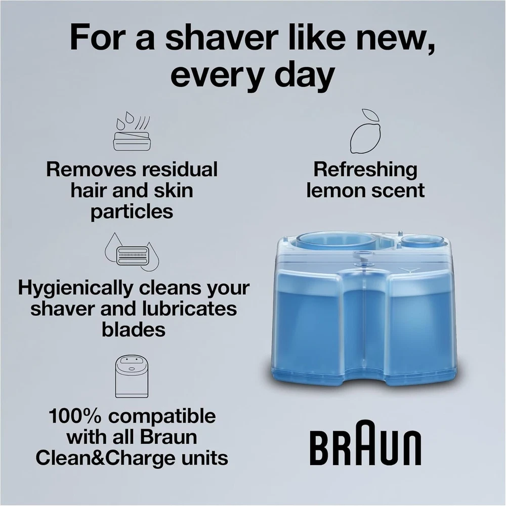 Clean & Renew Refill Cartridges CCR, Replacement Shaver Cleaner Solution for Clean&Charge Cleaning System, Pack of 3 Description: CLEANS 10X MORE EFFECTIVELY THANWATER. The Alcohol-based cleaning solution removes residual hair & skin particles for a hygienically clean shaver LEMON SCENT: Lemon-fresh formula releases a refreshing scent for a fresher shaving experience PERFORMANCE MAXIMIZING: Advanced lubricants to optimize the blade performance REFILL REPLACEMENT: Replace the refill cartridge every 2 months to experience a shaver like new, every day 100% COMPATIBLE: The Braun Clean & Renew Cartridges work with any Braun Smartcare and Clean&Charge centers BLADE LIFETIME PROTECTION: High-efficiency lubricants to maintain & protect your blade