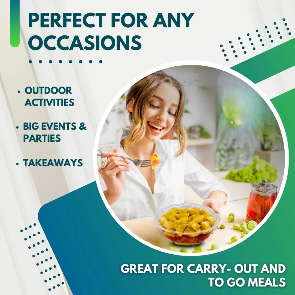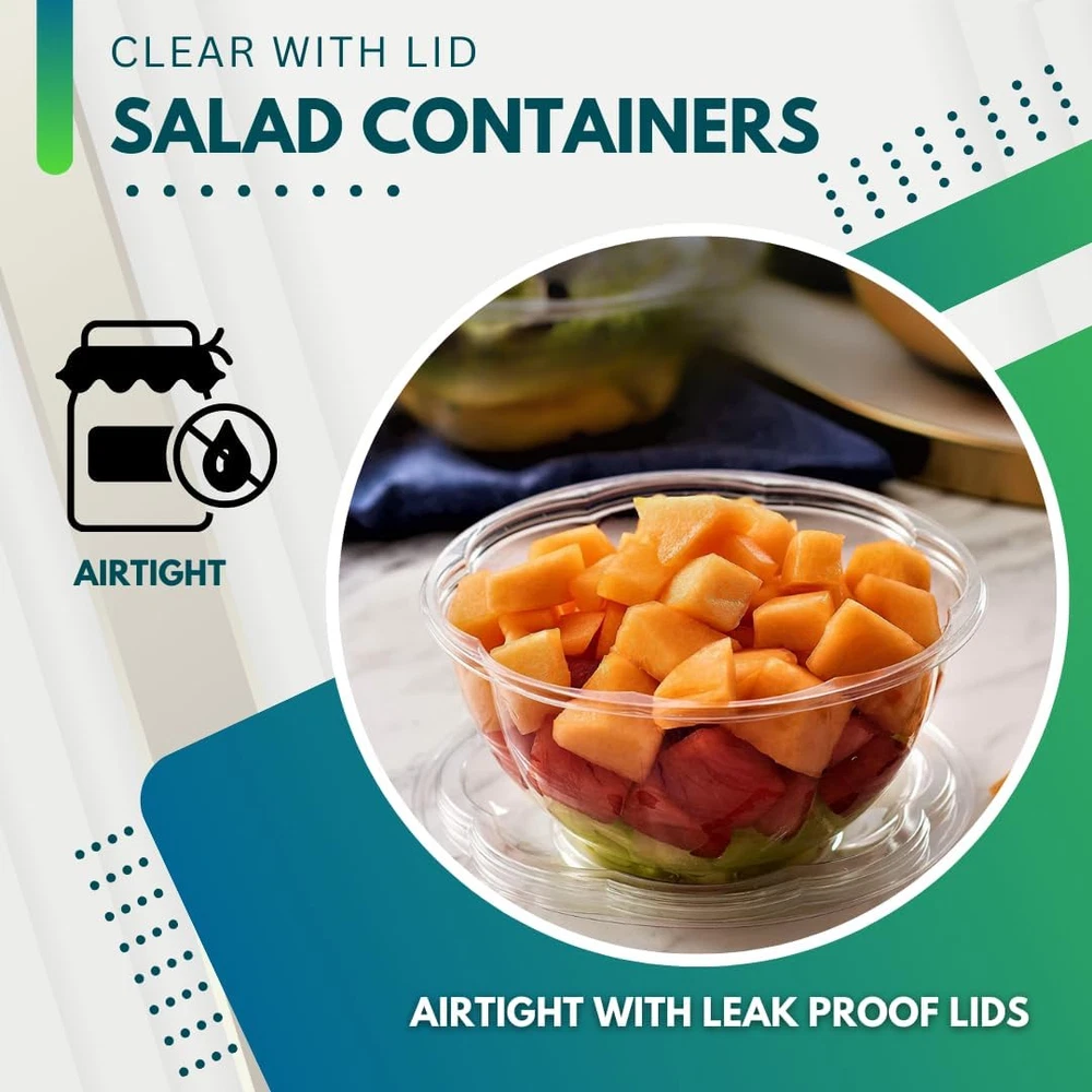 PRACTICAL DESIGN: Our disposable salad bowls with lids are made for your everyday convenience. They're practical, mess-free, and perfect for your busy life, whether it's for quick mornings or outdoor activities. PREMIUM QUALITY: Ideal for families, salad enthusiasts, and those who love to enjoy meals on the go, our clear salad bowls with lids provide top-notch quality at an affordable price. Elevate any gathering with the refined simplicity of our Salad Bowls with Lid – the perfect blend of functionality and sophistication for every occasion. LEAK-PROOF BOWLS WITH LID: Enhance your packed meal experience with our to-go salad bowls. Made with top-notch quality, these bowls have a crystal-clear design that makes your food look great. Leak-proof and ideal for any occasion, they keep your meals mess-free and fresh, even if you eat them hours later. PREMIUM QUALITY VALUE PACK: Introducing our Clear Salad Bowls with Lids, each set containing [Pack] [Size] disposable clear bowls. With dimensions of 7-inch top diameter, 3.25-inch bottom diameter, and 3.2-inch height, these clear plastic bowls are perfect for a wide range of food. At Green Direct, we're committed to offering durable, reusable products that cater to everyone's tastes and needs. Our products are thoughtfully designed to ensure maximum satisfaction, and we stand behind them with a 100% customer satisfaction guarantee! Product Description Crystal Clear Bowls The Green Direct Salad Bowl Set features crystal clear bowls, allowing you to showcase the vibrant colors and freshness of your salads and fruits. Food Safe & User Friendly Made using a portion of recycled plastic. No liner or coating is present on these bowls. Perfect For Meal Prep Lunch and daily meals are simple to prepare with our stackable bowl. Durable Bowl and Airtight Lid The Green Direct Salad Bowl Set is constructed with high-quality materials, ensuring durability and long-lasting performance. Product Description Add to Cart Add to Cart Add to Cart Add to Cart Add to Cart Customer Reviews 4.4 out of 5 stars 840 4.4 out of 5 stars 840 4.4 out of 5 stars 840 4.4 out of 5 stars 840 4.4 out of 5 stars 840 Price $23.99 $ 23 . 99 $24.99 $ 24 . 99 $25.99 $ 25 . 99 $30.99 $ 30 . 99 $17.99 $ 17 . 99 Bowl Size 18 oz 24 oz 32 oz 48 oz 64 oz Made with High-Quality Plastic ✔ ✔ ✔ ✔ ✔ BPA Free ✔ ✔ ✔ ✔ ✔ Color Clear Clear Clear Clear Clear With Lids ✔ ✔ ✔ ✔ ✔ Count 50 50 50 50 10