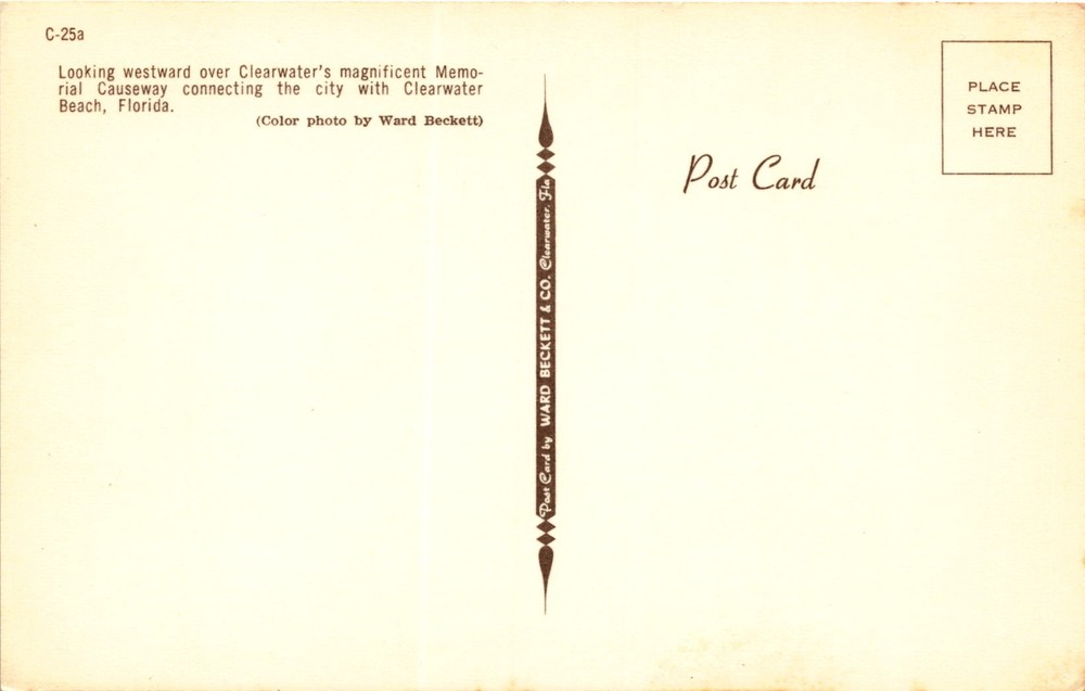 MAKE AN OFFER. THE MORE YOU BUY THE BETTER DEAL I WILL ACCEPT This postcard features a color photo taken by Ward Beckett showing the view looking westward over Clearwater's Memorial Causeway in Florida, connecting the city with Clearwater Beach. The Memorial Causeway is a significant bridge in Clearwater, Florida, providing a vital link between the city and the popular Clearwater Beach.