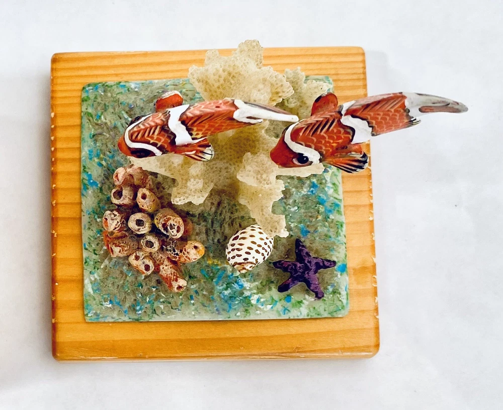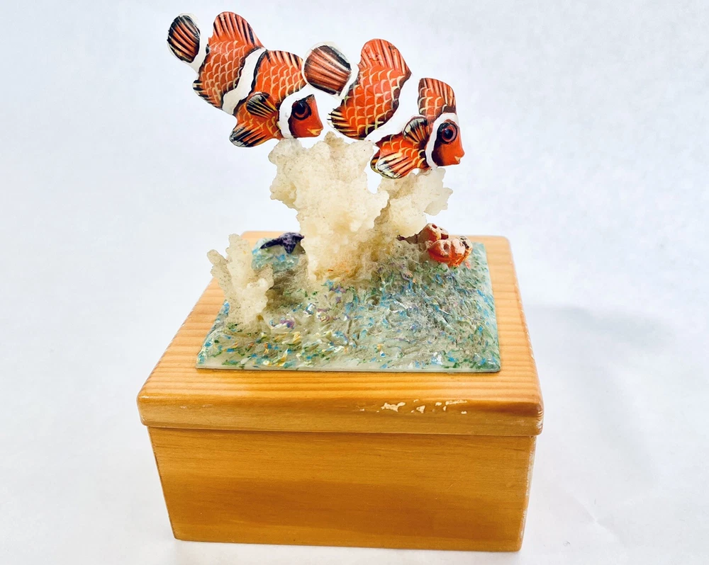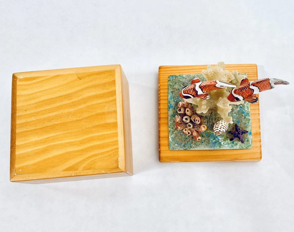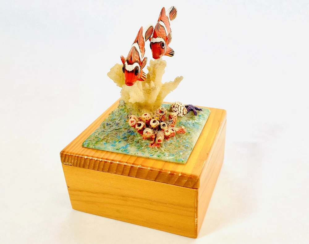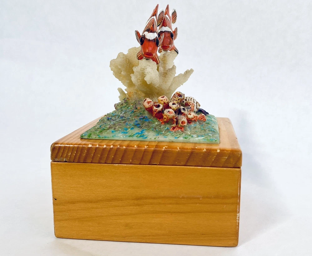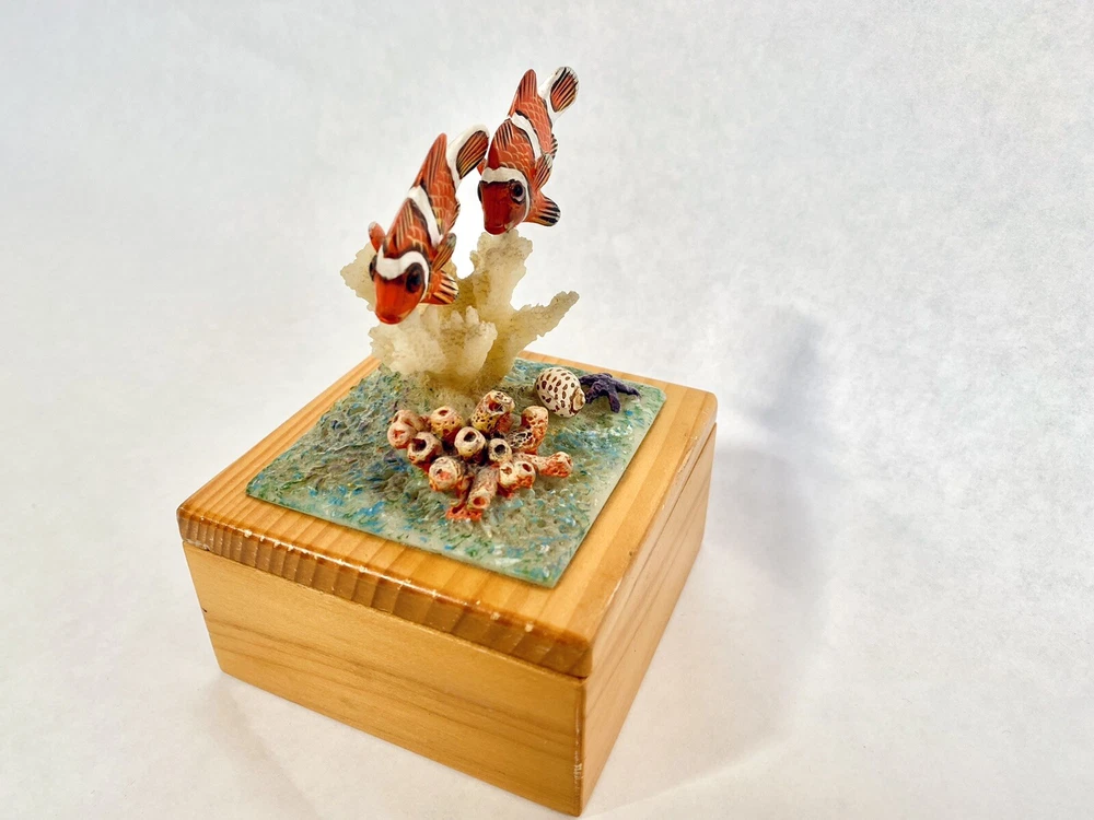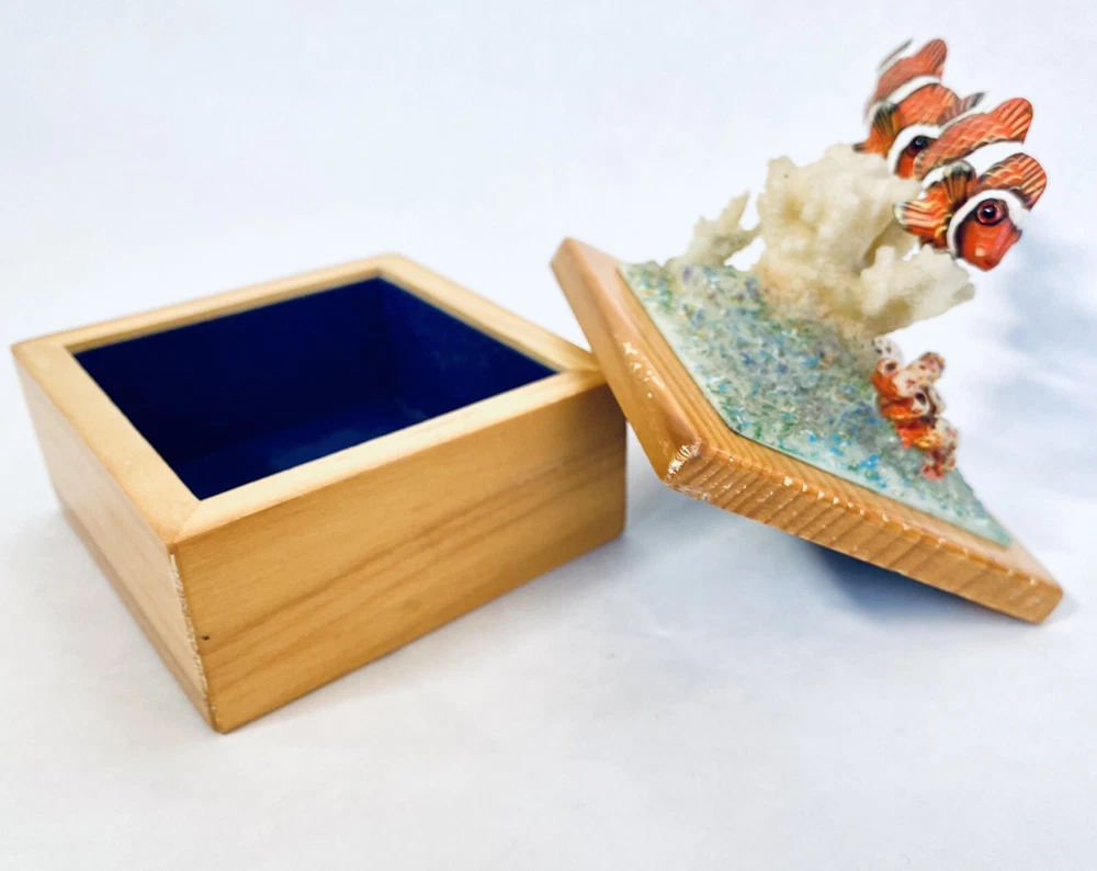 This is a fun, whimsical and colorful hand painted trinket box! It features a scene of a cute Clown Fish that is swimming above a reef cluster. Wood carved and hand painted. This jewelry trinket Box is lined with blue velvet. The box has some vintage expected ware of color along the edge, but nothing that takes away from the beauty of the piece. This trinket box is whimsical and perfectly put together. It is in good preowned condition. 4.5 x 3 x 3
