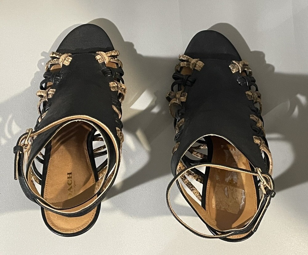 *** there are some sign of imperfection pls refer to pictures, there is sticker left on the right shoes, already removed some and stain at the bottom of the shoes pls refer to pictures** sold as is*** The Coach Jody Python Print Ankle Stiletto is a stylish heel featuring a striking animal print design in black and sand colors. With an open toe and strappy style, these heels are perfect for various occasions like parties, casual outings, and even business events. The ankle strap and adjustable strap provide added comfort and security while the stiletto heel adds a touch of sophistication. Crafted from leather and designed with a unique animal theme, these heels are a fashionable choice for women who want to make a statement with their footwear.