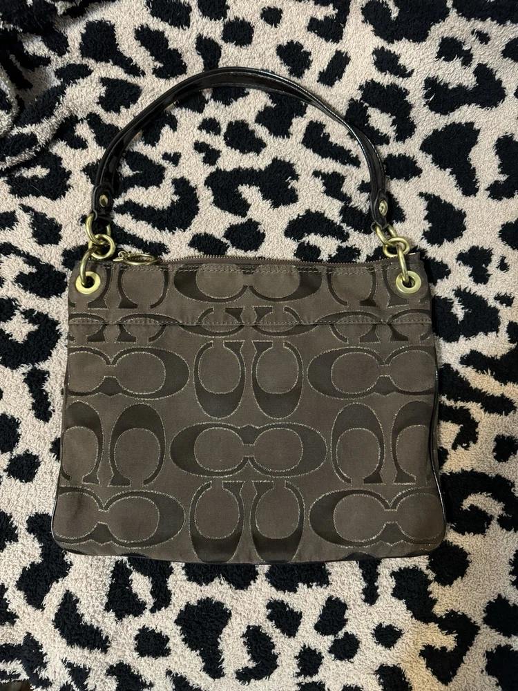 This Coach Poppy crossbody/handbag is a must-have for any fashion-forward woman. The metallic exterior material gives the bag a unique and stylish look, while the black and brown color combination adds a touch of classic elegance. The bag features a zip closure and a thin design, making it perfect for everyday use. With a size of 12 inches in width and 10 inches in height, this medium-sized bag is spacious enough to carry all your essentials. The bag also has a black lining color and features the Coach Poppy logo pattern, adding a designer, Y2K, and punk vibe to the overall look. The strap drop measures 7 and 23 inches, making it convenient to carry on your shoulder or across your body. This Coach Poppy crossbody/handbag is a perfect addition to any collection and is sure to make a statement wherever you go.