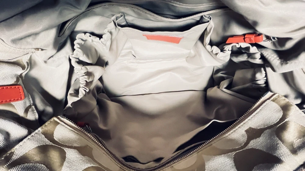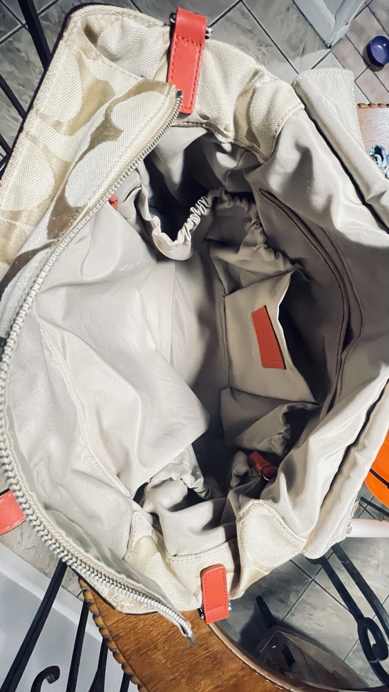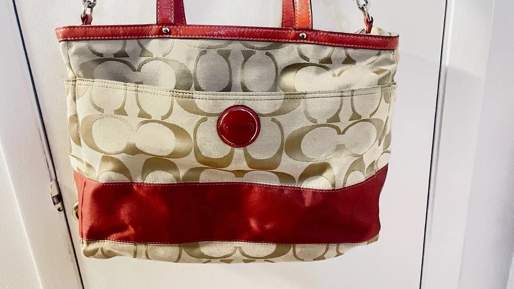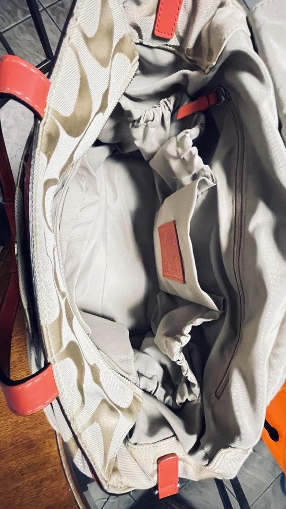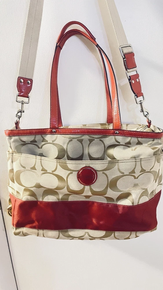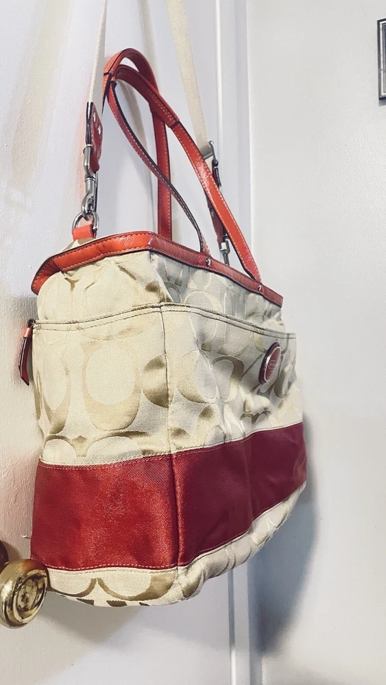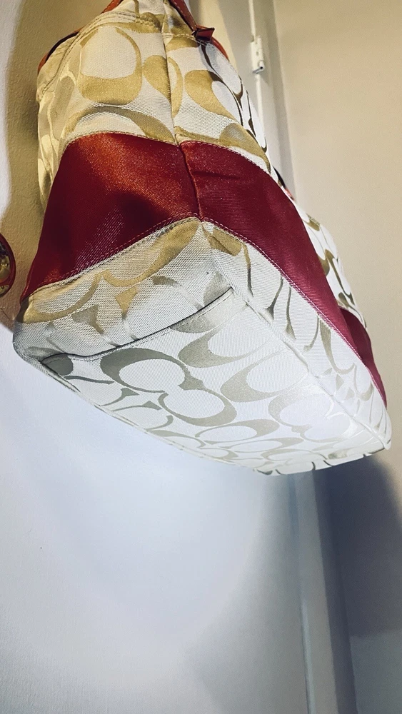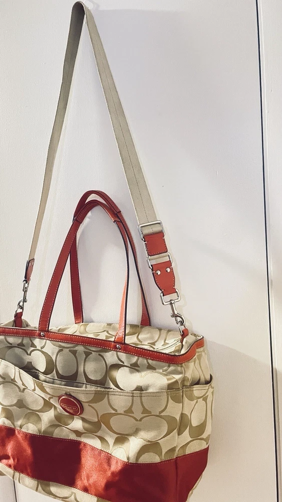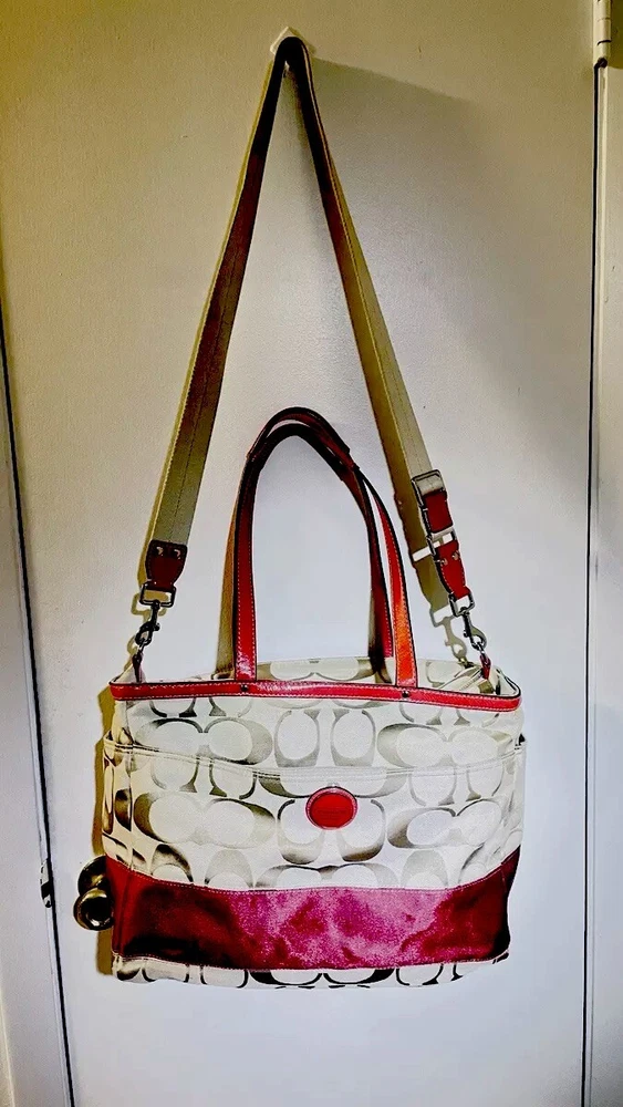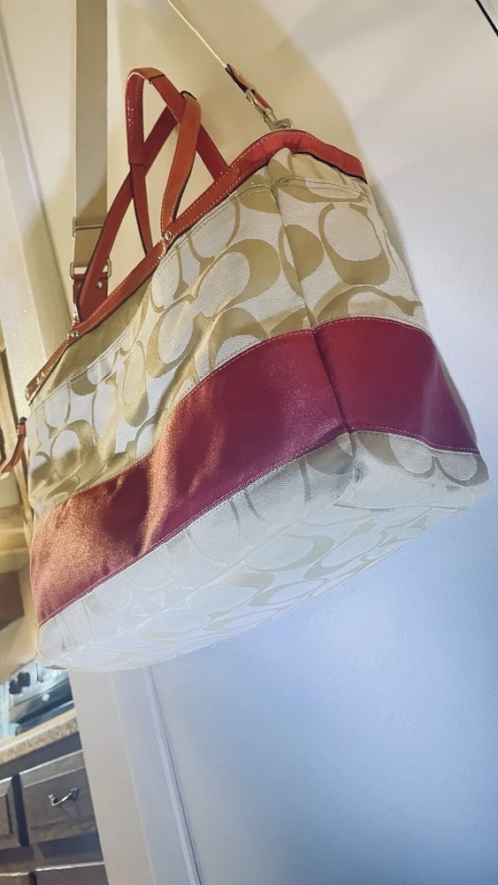Like New and Excellent Condition! Coach Sateen shoulder bag is a stylish and versatile accessory for any woman. With a bright pink exterior and ivory lining, it features a zip closure and double handles with an 8-inch drop. The bag has a large size of 18 inches in width, 12 inches in height, and 6 inches in depth, making it perfect for travel, casual outings, or business meetings. Very clean inside and out. Used one time. No stains rips or tears. The bag also has a vintage feel with a logo pattern and silver and gold hardware. It includes several features such as a bottle pocket, inner pockets, and an adjustable strap. The nylon lining material and satin exterior material ensure durability and elegance. This Coach Sateen shoulder bag is a must-have for any fashion-conscious woman.
