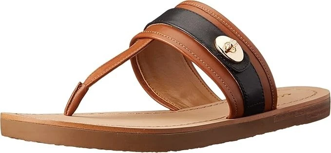 Coach Women's Eileen Sandal, Saddle/Black, 6.5 M US Authentic Guaranteed The Eileen Sandal from COACH blend water-resistance and warm-weather style for a beach-ready go-to. 3/4" heel Rubber sole Leather upper; sole: rubber Wipe clean Imported
