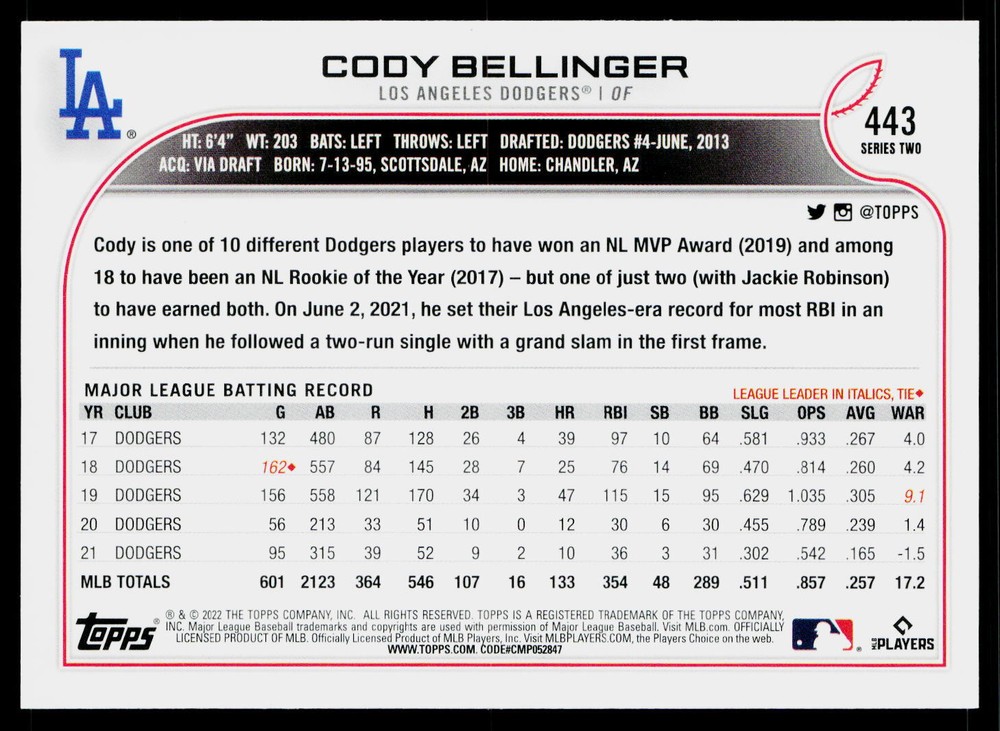 You will receive a , Cody Bellinger 2022 Topps #443 Los Angeles Dodgers Near Mint or Better condition. Please note i am not a professional card grader the condition of raw cards can be very subjective. Please refer to the high quality pictures to determine condition yourself any questions at all please feel free to ask!! we take pride in the quality of cards we sell and ship, all cards will be shipped in a penny sleeve and top loader for added protection. be sure to save us as a seller, as we are growing and listing daily THANK YOU FOR YOUR BUSINESS