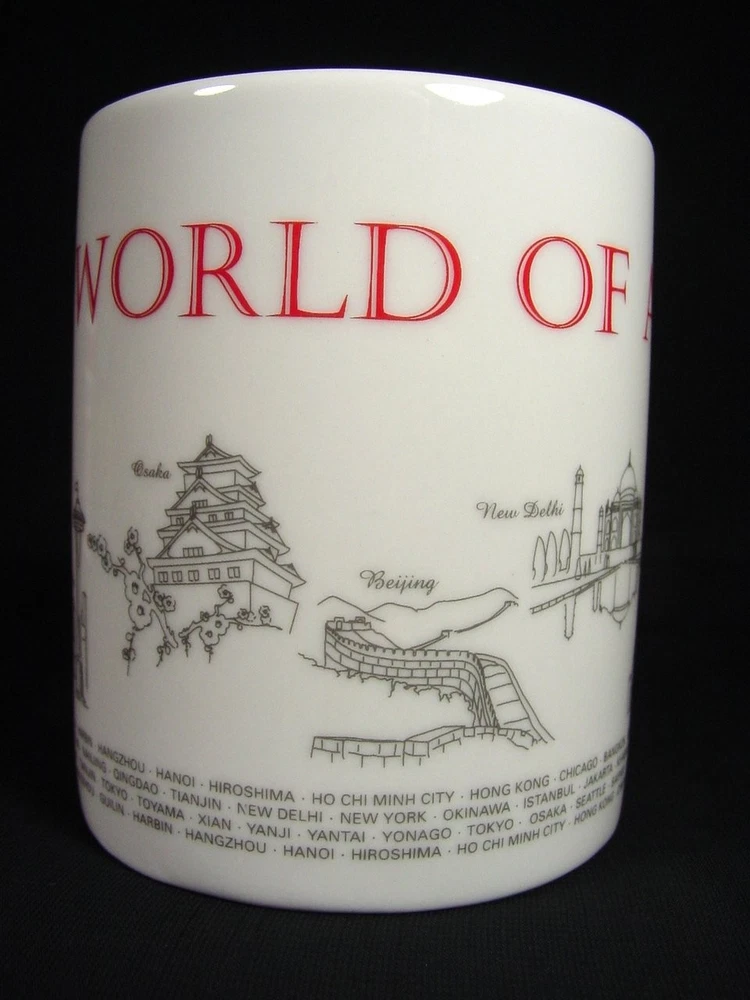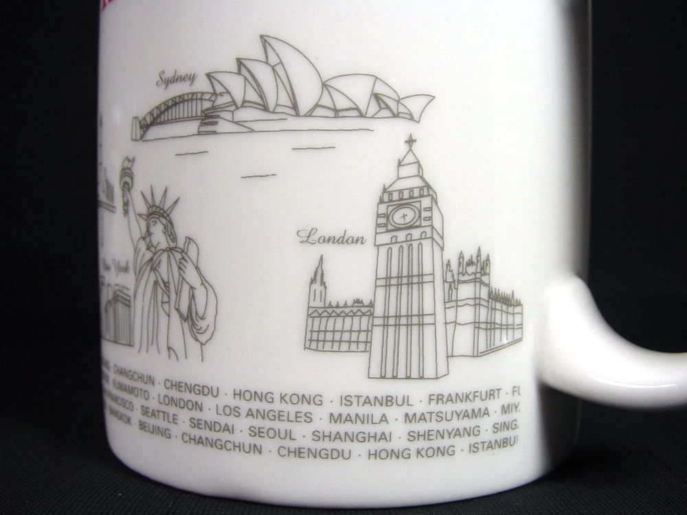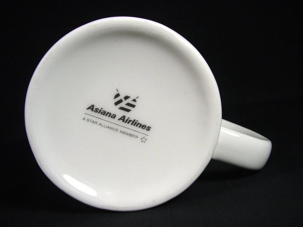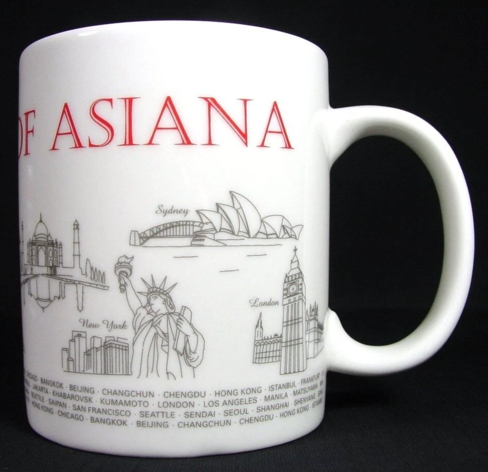 This coffee mug is a must-have for any aviation enthusiast or collector of memorabilia. Featuring the iconic Asiana Airlines branding, this mug celebrates the world's landmarks and cities serviced by the airline. It is perfect for enjoying your morning coffee or as a decorative piece on your shelf. Crafted with precision and attention to detail, this cup is a high-quality addition to your collection. The mug is made from durable materials and features a stylish design that will impress anyone who sees it. Add this Asiana Airlines coffee mug to your collection today and experience the joys of owning a piece of aviation history. Measures 3.87" high by 3.13" in rim diameter.