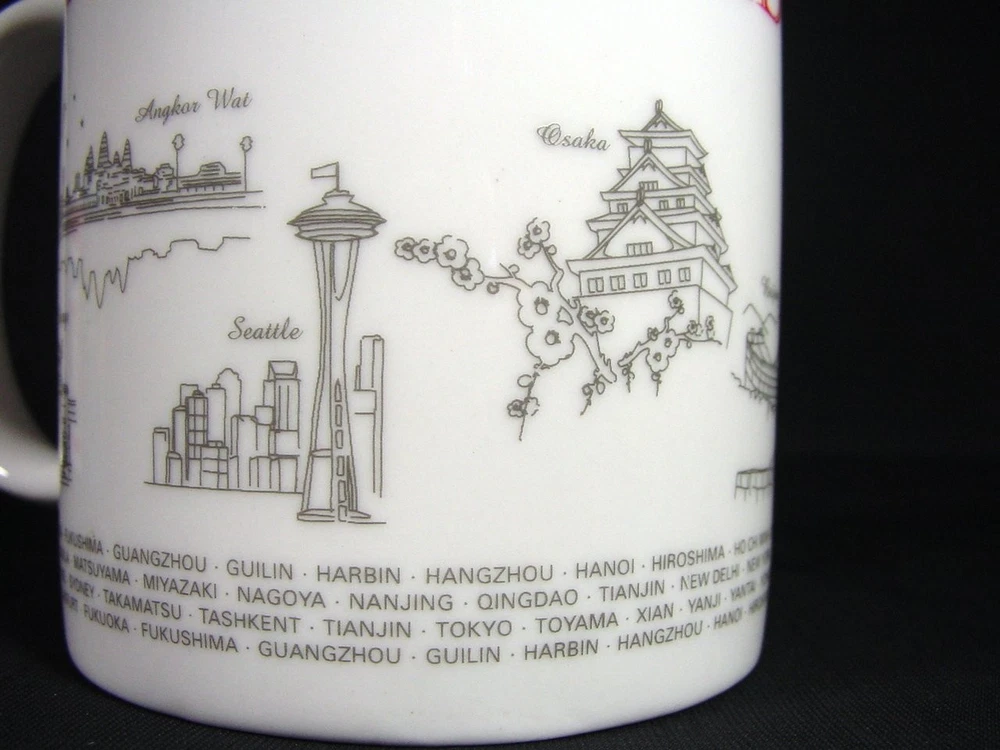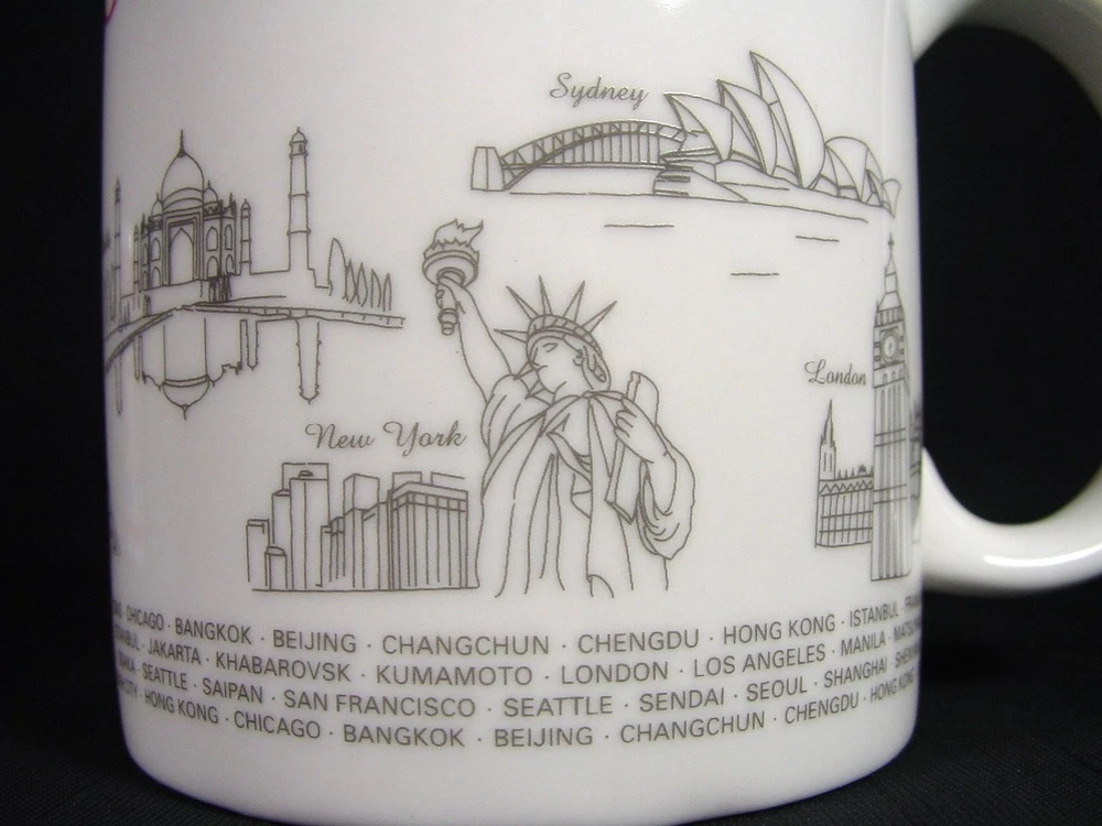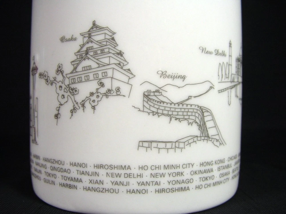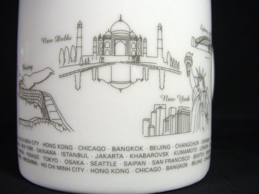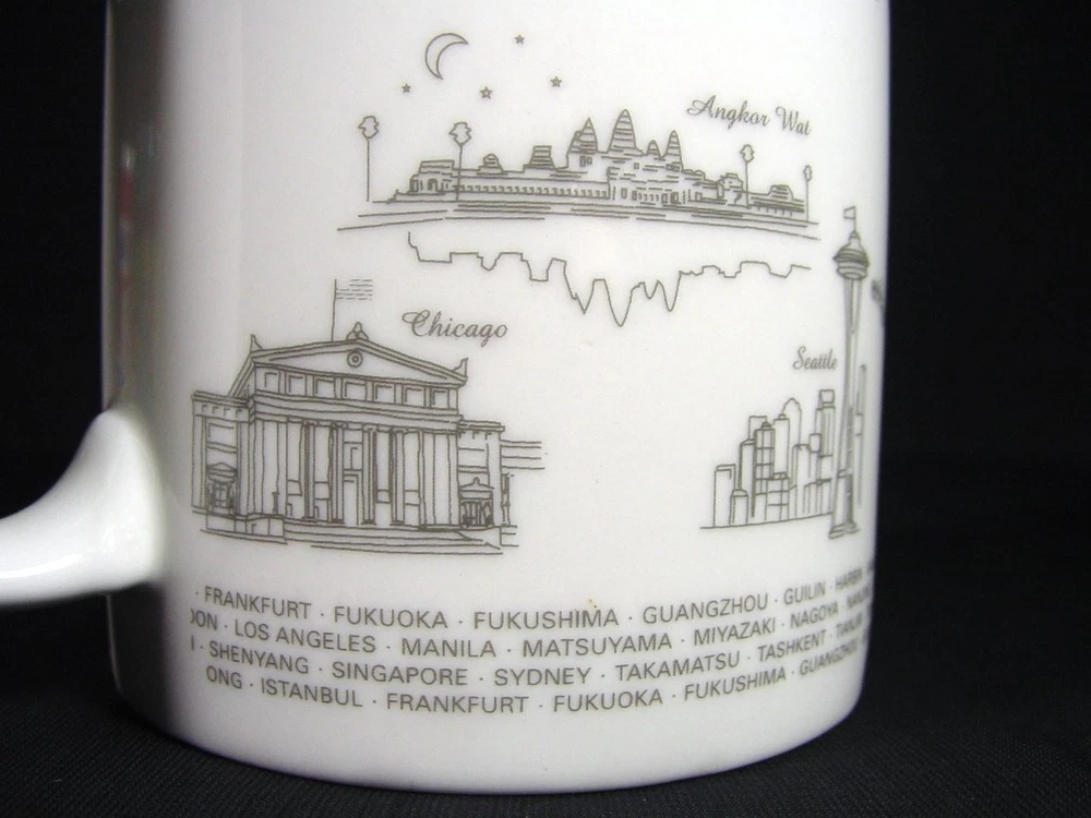 This coffee mug is a must-have for any aviation enthusiast or collector of memorabilia. Featuring the iconic Asiana Airlines branding, this mug celebrates the world's landmarks and cities serviced by the airline. It is perfect for enjoying your morning coffee or as a decorative piece on your shelf. Crafted with precision and attention to detail, this cup is a high-quality addition to your collection. The mug is made from durable materials and features a stylish design that will impress anyone who sees it. Add this Asiana Airlines coffee mug to your collection today and experience the joys of owning a piece of aviation history. Measures 3.87" high by 3.13" in rim diameter.