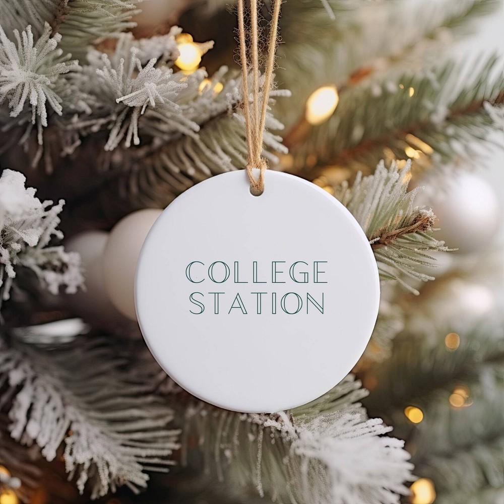 College Station Ornament Christmas Ornament College Station Gift Christmas Gift Christmas Decor College Station Souvenir Material: Ceramic Color: White Shapes: Circle, star, heart and oval Can be printed on both sides Imprint full-color artwork, photos, or logos Hole for hanging string and hanging string included Printed in the USA