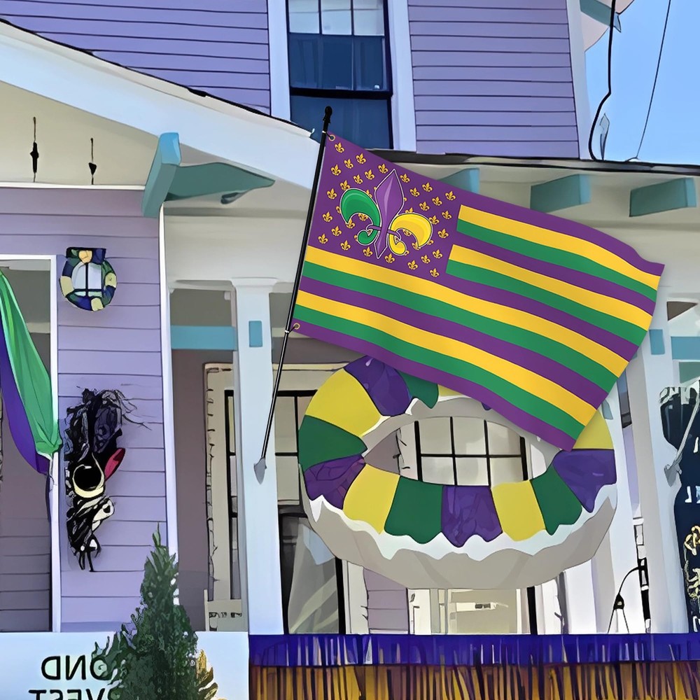 1 Show: Express the joyful atmosphere of masquerade carnival of the with this stunning mardi gras flag With On It with an eye-catching design. Durable: This mardi gras banner decor flag 3x5ft outdoor use polyester flag stands out because of its double-sided mirror printing, strong material and waterproof and UV-resistant coating, long-term use will not cause the flag to fade, and its ability to withstand strong wind and rain. Multi-Functional: Whether you are hanging the mardi gras house flag 3x5 outdoor is double sided on your wall, waving it during a parade, displaying it in your house/yard, or using the mardi gras flag as a unique holiday gift, this masquerade carnival fat tuesday party decor is perfect for anyone occasion. Symbolic And Inspirational: The combination of the mardi gras banner and the American flag creates a powerful visual statement. Also a for mardi gras garden flag is the best choice for outdoor garden decoration on mardi gras party, dance party, party or any other day you want to celebrate American. Easy To Install: With brass grommets, you can set up this mardi gras banner flag for home on any flagpole in seconds, and its vibrant colors stay vibrant for a long time. (Please Note: Flagpole not included).