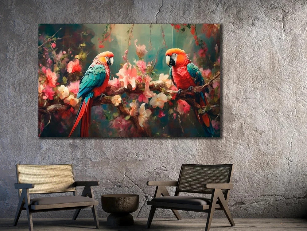 Colorful Art Parrots with Pink Blossom Unframed Canvas Print Australian Wall Art