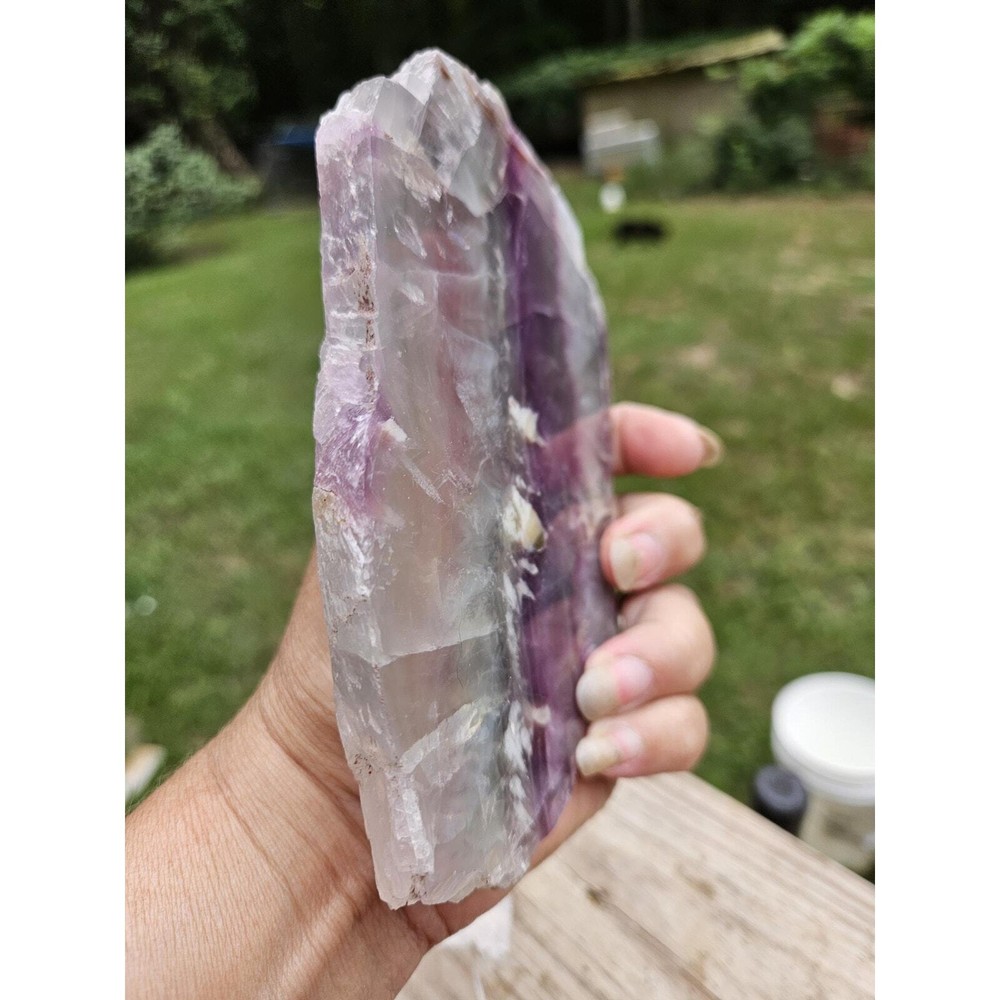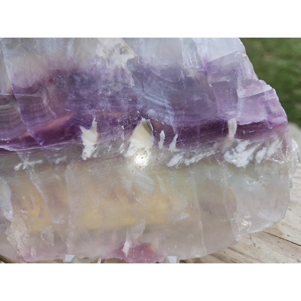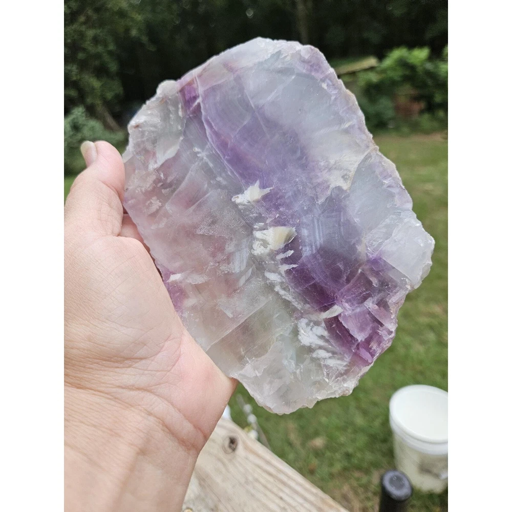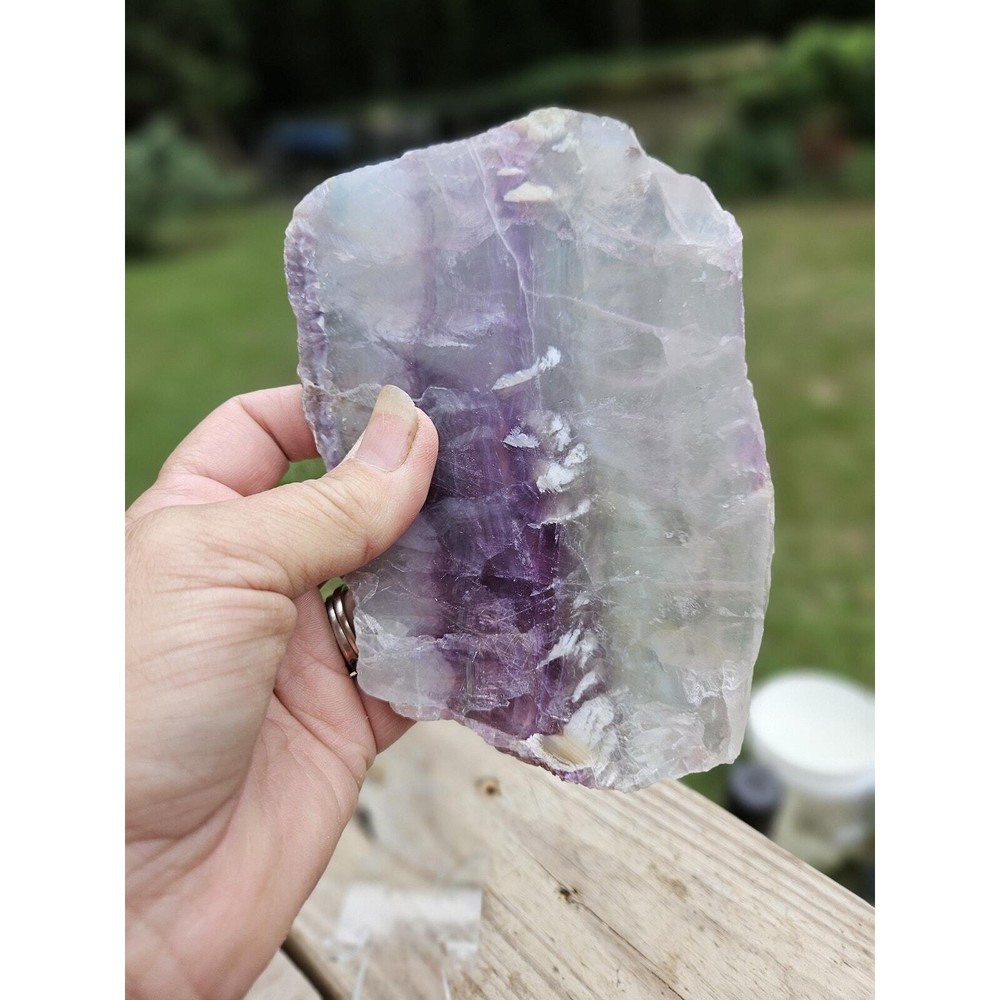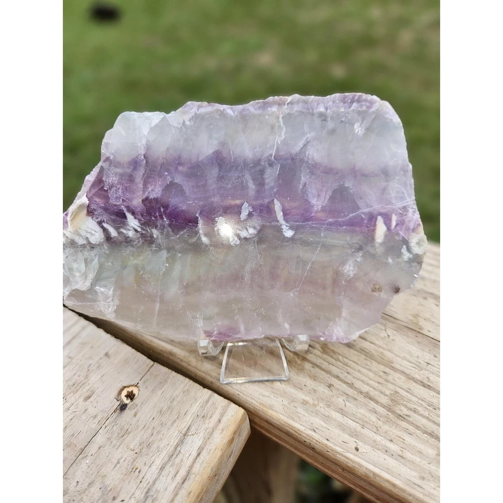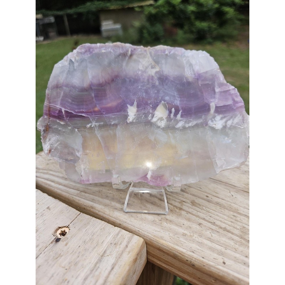 This is a thick beautifully polished AAA slice of fabulous feather fluorite. This is a very stable piece that's 14 millimeters thick, 5 1/2" inches long, 4 " inches tall. This beautiful slice weighs 1 pound 1 ounces, or 462 grams and full fluorite rainbow in one piece. Healing and Well-being: Some believe feather fluorite possesses metaphysical properties that can promote mental clarity, emotional balance, and creativity. It's associated with the crown chakra, believed to be the energy center for spiritual connection and higher consciousness. Fluorite is a highly protective and stabilizing stone, useful for grounding and harmonizing spiritual energy. When working with the upper Chakras, Fluorite increases intuitive abilities, links the human mind to universal consciousness, and develops connection to Spirit. Rainbow fluorite is a colorful mineral that is thought to have many metaphysical and healing properties: Calming: Can help calm the mind and promote inner harmony Brain function: Can stimulate brain cells, improve focus, and clear mental fog Productivity: Can boost productivity, creativity, and problem-solving skills Emotional balance: Can promote emotional balance and protect against negative energies Chakras: Can cleanse all chakras