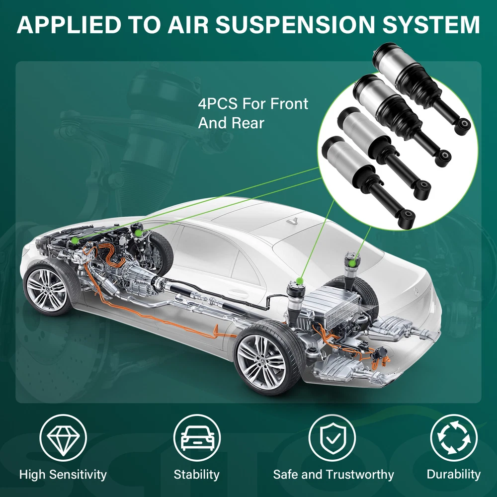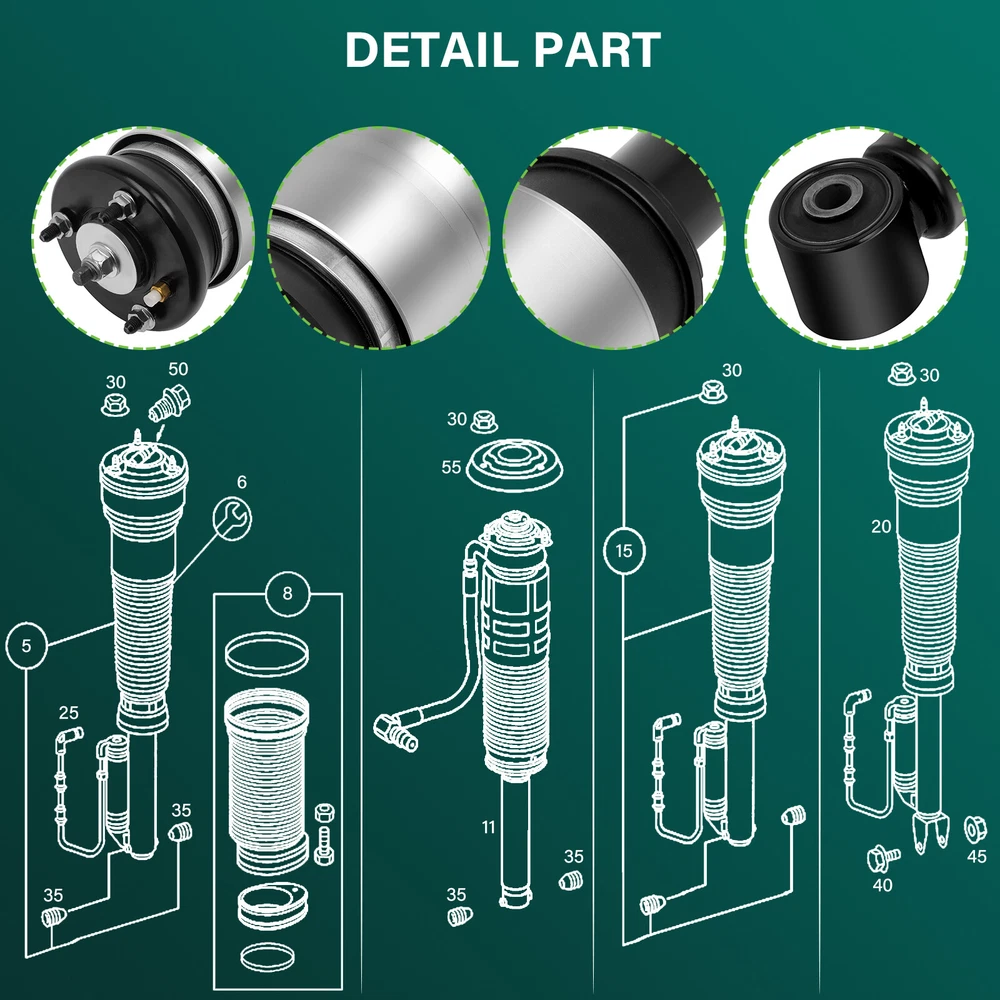 *Compatibility Chart 1, You can distinguish specific model of an automobile by VIN(Vehicle Identification Number). 2, VIN(Vehicle Identification Number) consists of total 17 English letters and arabic digits. 3, VIN does not include the letters I (i), O (o), and Q (q) (to avoid confusion with numerals 1 and 0). Range Rover Sport Excludes VDS Model With Electrical Plug on Mounting Base 2010-2014 Complete Suspension Shock Strut Air Compressor Fits Land Rover Range Rover Sport *Compatibility Chart 1, You can distinguish specific model of an automobile by VIN(Vehicle Identification Number). 2, VIN(Vehicle Identification Number) consists of total 17 English letters and arabic digits. 3, VIN does not include the letters I (i), O (o), and Q (q) (to avoid confusion with numerals 1 and 0). Range Rover Sport Excludes VDS Model With Electrical Plug on Mounting Base 2010-2014 GT Limited Edition 3 Sport Utility 4-Door 5.0L 2012 GT Limited Edition Sport Utility 4-Door 5.0L 2011 2013 HSE Lux Sport Utility 4-Door 5.0L 2012-2013 HSE Sport Utility 4-Door 4.4L 2006-2009 HSE Sport Utility 4-Door 5.0L 2010-2013 LE Sport Utility 4-Door 4.2L 2008 Supercharged Sport Utility 4-Door 4.2L 2006-2009 Land Rover LR4 Base Sport Utility 4-Door 3.0L 2014-2016 Base Sport Utility 4-Door 5.0L 2011-2013 HSE Lux Sport Utility 4-Door 3.0L 2014-2016 HSE Lux Sport Utility 4-Door 5.0L 2012-2013 HSE Sport Utility 4-Door 3.0L 2014-2016 HSE Sport Utility 4-Door 5.0L 2010-2013 SE Sport Utility 4-Door 5.0L 2010-2013 V8 Sport Utility 4-Door 5.0L 2010 Land Rover LR3 Base Sport Utility 4-Door 4.0L 2006 HSE Lux Sport Utility 4-Door 4.4L 2009 HSE Sport Utility 4-Door 4.4L 2005-2009 SE Sport Utility 4-Door 4.0L 2005-2009 SE Sport Utility 4-Door 4.4L 2005-2009 *Air Suspension Structure: 1 Front Rh Air Spring Damper Module 2 Front Rh Height Sensor 3 Air Suspension Control Module 4 Air Suspension Control Switch 5 Rear Rh Height Sensor 6 Rear Rh Air Spring Damper Module 7 Air Supply Unit Silencer 8 Rear Lh Air Spring Damper Module 9 Air Fitter 10 Rear Valve Block 11 Rear Lh Height Sensor 12 Upper Acoustic Cover 13 Lower Acoustic Cover 14 Air Supply Unit 15 Reservoir Valve Block 16 Air Reservoir 17 Front Lh Height Sensor 18 Front Lh Air Spring Damper Module 19 Front Valve Wock * Generation & Evolution: Land Rover Discovery First generation (Project Jay; 1989-1998) Second generation (LR2/L318; 1998-2004) Third generation (LR3/L319; 2004-2009) Fourth generation (LR4/L319; 2009-2016) Fifth generation (L462; 2017-present) Range Rover Sport First generation (L320; 2005-2013) Second generation (L494; 2013-present ) SVR (2015 Pre-Facelift) SVR (2018 Facelift) *Platform Drive Layout : Front Engine-Four Wheel Drive Layout *Air Suspension System: The Discovery LR3 LR4 own fully independent air suspension with cross-linking when off-road and the twin-range transfer gearbox with an electronic infinitely variable locking centre differential. As before, a similar locking rear differential is available. The Terrain Response system remains but with two new features – the 'Sand' mode incorporates a new traction control mode to prevent loss of traction when starting off and stopping in soft sand, and the 'Rock Crawl' mode gains a feature that applies gentle brake pressure at low (less than walking pace) speeds to improve grip and stability on slick rock. Range Rover Sport air suspension system gives the driver the option of three ride height settings including a standard ride height of 172 mm (6.8 in), an off-road height of 227 mm (8.9 in) and a lowered access mode. There is also an extra height available which is accessed by holding the respective button for when the off-road ride height is not enough. When the vehicle bellies out, its control system will sense weight being lessened on the air springs and the ride height is automatically raised to the suspensions greatest articulation. The cross-link aspect of the suspension system, which debuted on the L322 Range Rover in 2002, results in better off-road performance by electronically operating valves in pneumatic lines which link adjacent air springs. In the event of a wheel on one side being raised when travelling off-road, the pneumatic valves are opened and the adjacent wheel is forced down, simulating the action of a live axle setup. *Removal Guideline: Caution: Damage to the vehicle and air suspension system can be incurred if work is carried out in a manner other than specified in the instructions or in a different sequence. 1.To avoid the possibility of short circuits while working with electric components consult your owner's manual on how to disconnect your battery. 2.Consult your vehicle owner's manual, service manual, or car dealer for the correct jacking points on your vehicle and for additional care, safety and maintenance instructions. Under no circumstances should any work be completed underneath the vehicle if it is not adequately supported, as serious injuries and death can occur. 1.Remove front wheel to expose the front air strut.(picture 1,2) 2.Loosen and remove the three(3)top mounting nuts.(picture 3) 3.Loosen and remove the lower mount nut. Support the air strut and remove the lower mount bolt.(picture 4,5) 4.Carefully lower the air strut to gain access to the air line. Unthread the fitting, remove the strut from the vehicle.(picture 6) 5.Remove the air strut from the vehicle.(picture 7) 6.Remove the air line fitting from the air hose and discard. To remove the air line fitting, remove the collet and the remaining fitting will slide off of air hose.(picture 8) *Installation Guideline: Installation is in reverse order of air strut removal. * Frequently Asked Questions : How to prevent the damage of air springs/How to extend the service life of air springs/struts etc.? An air strut with separable air springs If your vehicle offers a separable air suspension (Audi Allroad A6 C5, Mercedes-Benz W164, BMW X5, etc.), you should regularly (about once a week) lift the car to the maximum position