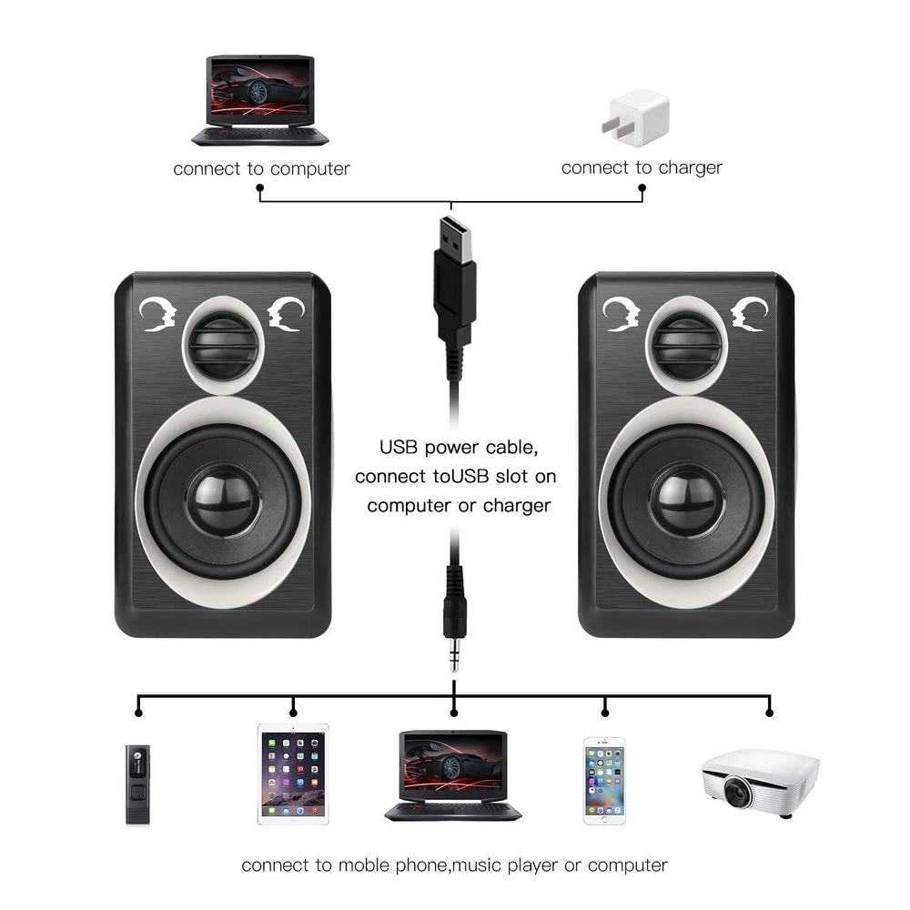 【SIMPLE SQUARE STRUCTURE】ABS high quality plastics make it shiny without murky grey. Black color with the grey oval ring, make speakers show the beauty of stereo. Adopted the low-voltage digital power, the maximum power can be 5W, ensure the sound clear, bright, rounded and thick. Small Body(5.4x3.2x.3.6inch) with powerful audio. 【RICH AND STRONG STEREO SOUND PROVIDE SUPPER SOUND QUALITY】Built-in 4 x bass diaphragm, closed Cavity and Low Frequency Aid design, compared to other small speakers. The unique acoustic resonator structure using the enclosed low-frequency aid design makes the sound more penetrating and powerful, to make up for the lack of bass of the Mini 2.0 speakers. 【COMPATIBLE WITH MULTIPLE DEVICES】MP2000 2.0 stereo speaker which is with 3.5mm audio interface and USB powered,compatible with most music players, , iPad, Galaxy phone or tablet, MP3 player or other device, just plug into your device to listen to your music at full volume. USB power supply, can be directly plugged into the computer USB port to take power, can also connect most of the 5V charger power supply. 【NOTE】Restricted to the small volume, bass effect still can’t compare with big speakers and professional subwoofer. To enjoy the best stereo effect need to separate 2 speakers, for example, the two speakers are separated from the distance of 1 meter, the two speakers and people should be 1 meters distance, then the two speakers and people is an equilateral triangle, such a position, you will hear the best stereo effect. 【12 MONTHS 】computer speakers provides 12 months manufacturer's and unconditional 30 days money-back .