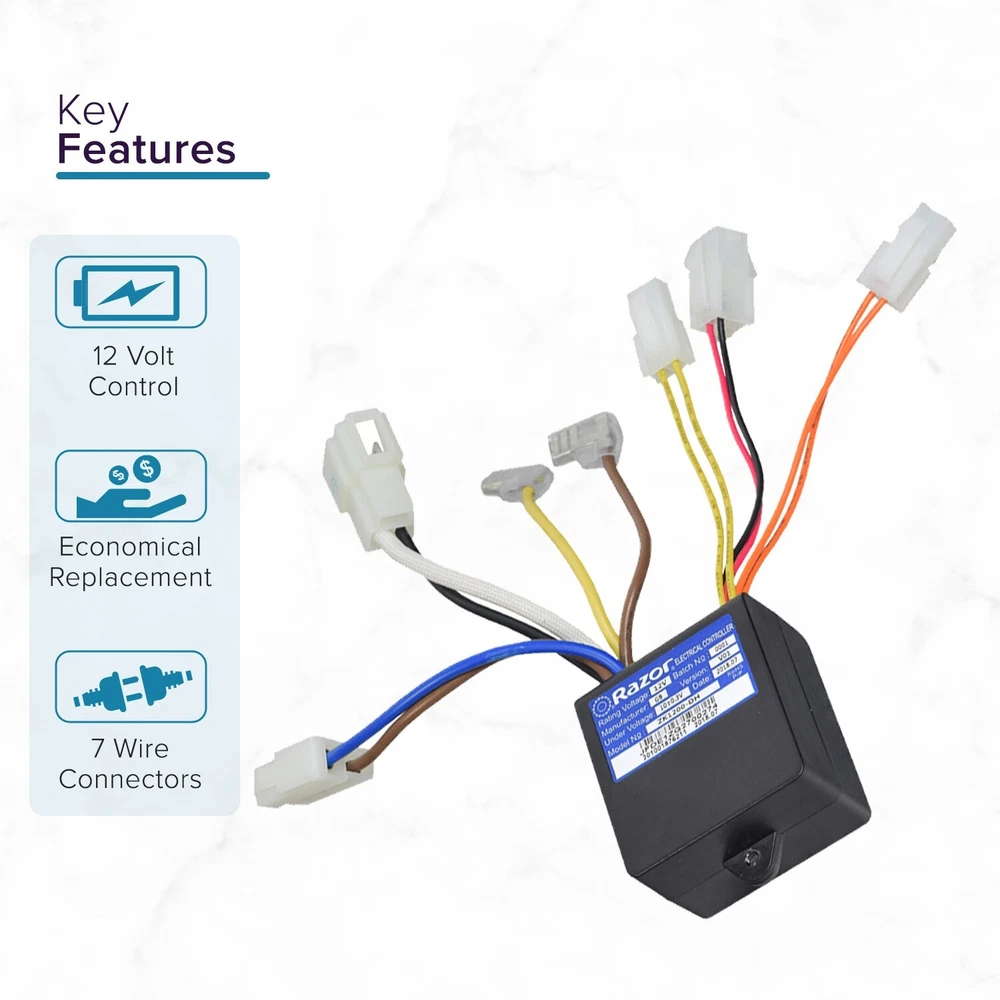 The control module for the Razor Power Core 90 (Version 1 ) and Power Core E90 (Versions1 - 2 ) features seven connectors and is a drop-in replacement for a faulty ower Core E90 ccontroller. Note: Although this 12 volt ZK1200-DH control module for the Power Core 90 and E90 is similar to other Razor controllers, it is not interchangeable with those models.