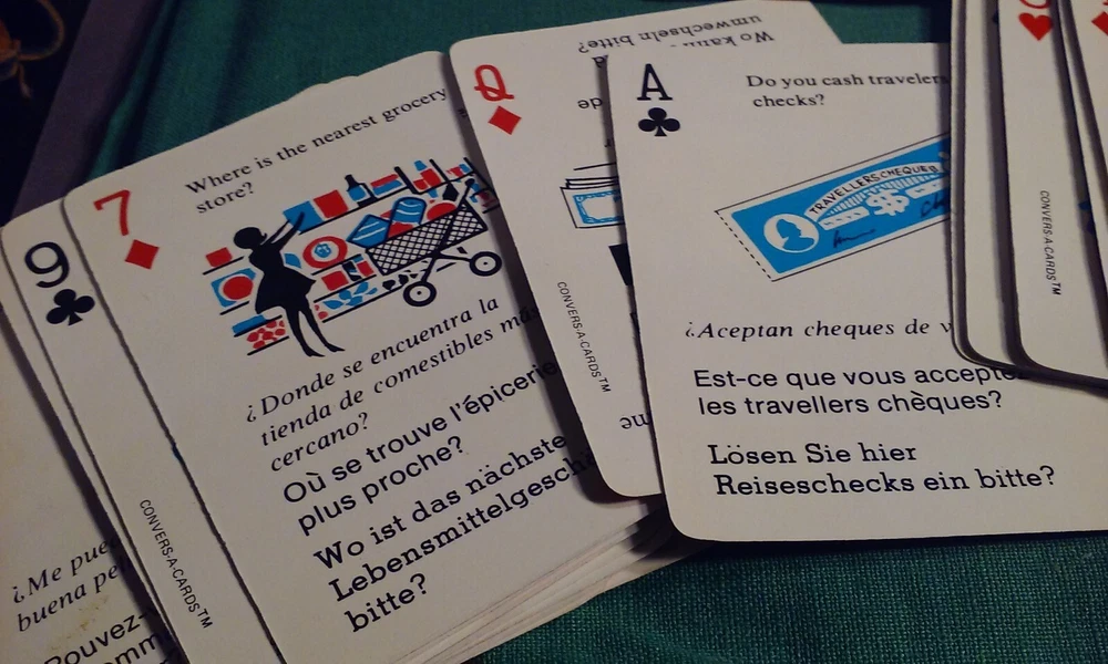 Vintage Convers-A-Cards - Learn French German and Spanish while playing cards & Case, scarce. Language Translations on 52 Playing Card Deck. Full deck -- 52 cards plus Jokers -- with common phrases in German, French and Spanish. Made in Hong Kong expressly for: Bonny, Flushing N.Y.