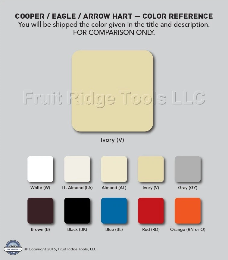 Fruit Ridge Tools, LLC Our eBay Store Contact Us Add to Favorite Sellers Cooper Standard 2G Ivory Dryer Range Welder 2.156" Outlet Cover Wallplate 2168V Product Details Quantity in Lot: 1 Brand: Cooper Wiring Devices Part Number: 2168V Color: Ivory Material: Plastic Gangs: 2-Gang Size: Standard Type: 30 & 50 Amp Power Outlet 2.15in. Hole Wallplate Openings: 30 & 50 Amp Power Outlet 2.15in. Hole Grade: Standard Grade Cooper 2168V ivory 2-gang single outlet cover. Standard grade with 2.156" diameter receptacle opening. Standard size, measuring 4.5"h x 4.563"w. Typical use would be for straight blade power outlets. Features include: Non-flammable thermoset phenolic or urea Flush-fitting, warp-resistant design Designed for high dielectric strength and arc resistance Resistant to fading, discoloration, grease, oils, organic solvents, moisture, and scratches Easy to clean, smooth finish Noncombustible Each is individually packaged with matching mounting screws This is New Old Stock and is returnable for any reason. (SKU # CWD2168V-EA; Weight: 0.1500 lbs.)