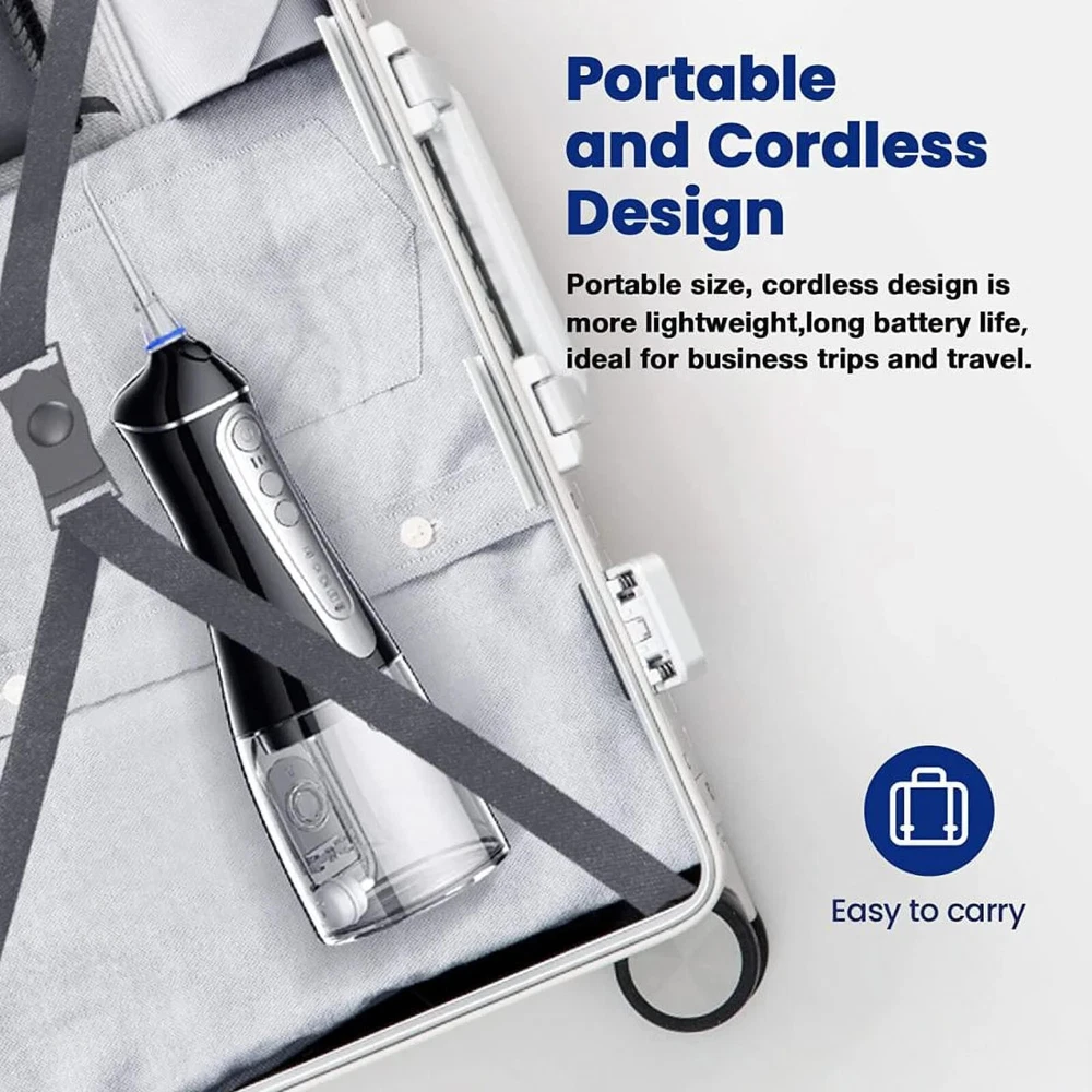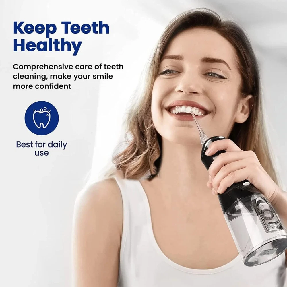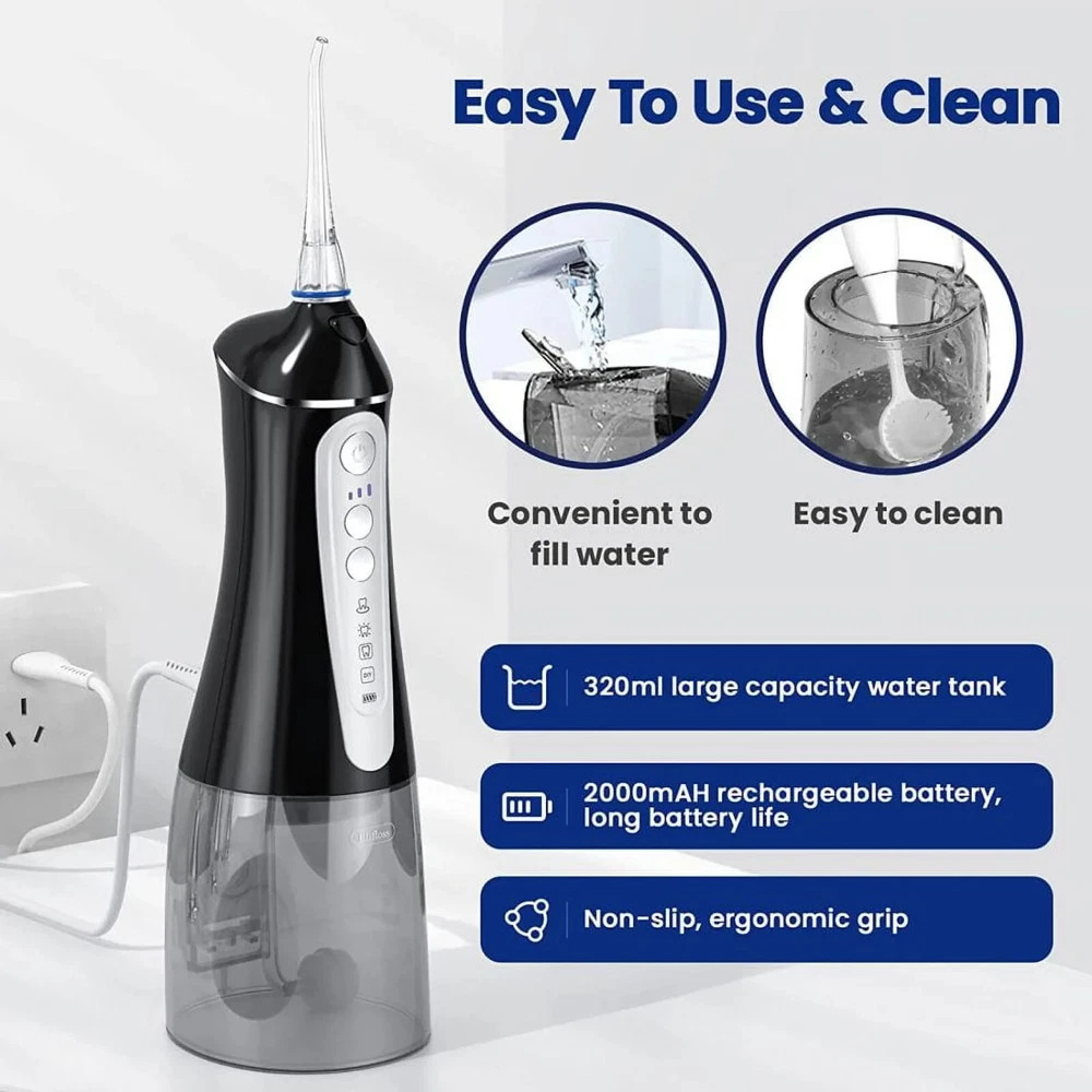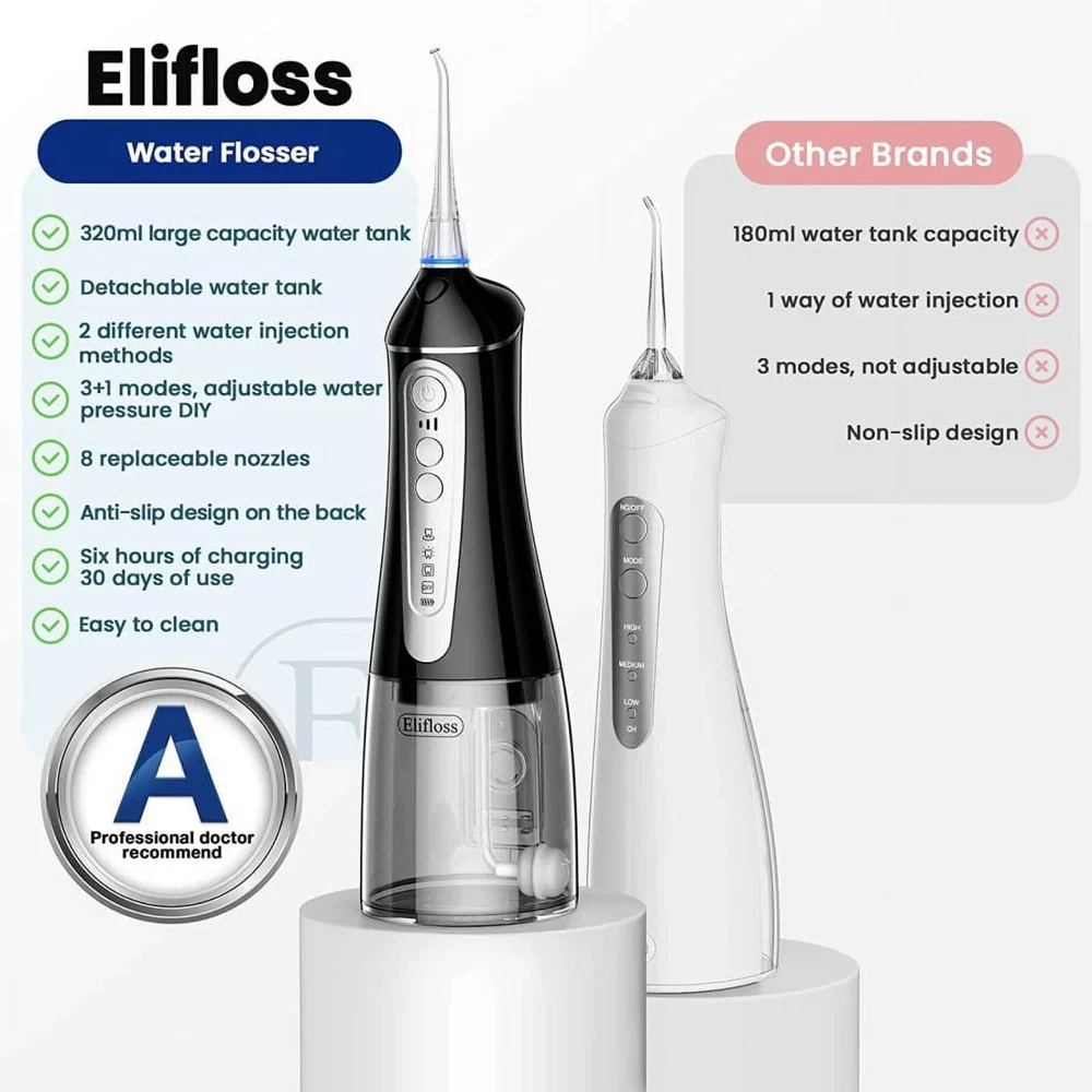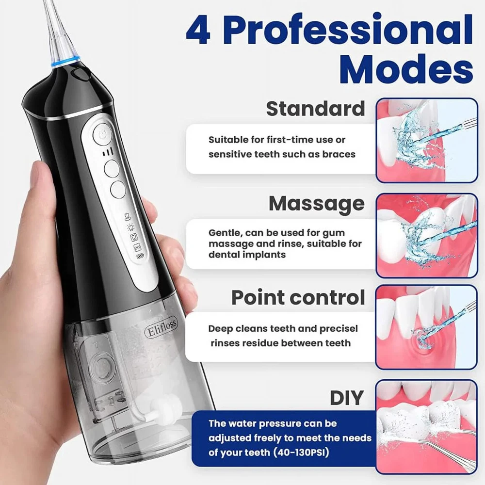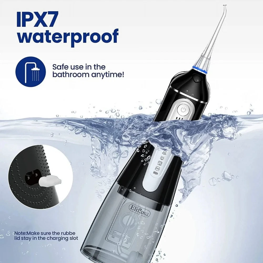 About this item Comprehensive Care for Strong Oral Health Portable Oral Irrigator. The easy-to-use, 360-degree rotating spray set thoroughly cleans residual stains in all areas of the mouth. 7 replaceable tips to fulfilled variety of needs from standard clean to gum massage. The back is non-slip and ergonomically designed for better grip and use. Portable and rechargeable, the Elifloss Cordless Teeth is easy to store for business and travel use. Full body washable and IPX7 waterproof design inside and outside for double protection. You can use the water dental flosser in the shower for a safer and more comfortable flossing experience. 320ML large capacity tank with 2 different water injection methods. The water tank is easily removed for cleaning. 4 Professional Smart Modes - Standard mode: Suitable for daily cleaning - Massage mode: Massage gum - Point control mode: Deeper cleaning - Diy mode: Customize your perfect water pressure. Newest portable water flosser upgraded to 4 +1 modes setting of water pressure (from 30-120 psi). Allows you to customize your teeth cleaning process. Easily remove plaque for the ultimate stay home dental clinic like experience Elifloss’s cordless water dental flosser is IPX7 waterproof, it allows you to use it anywhere, even when you are taking a shower(the rubber lid should stay in the charging slot during the using). Detachable tank makes the refilling water much easier, there is also a window at the back of the tank allows you to refill it without detaching the tank. 360 rotatable nozzle allows you to use it from any angle, and helps you reach the difficult to access areas in your mouth. Helps prevent the tooth decay, dental plaque, dental calculus, bleeding gums and dental hypersensitivity. Our dental water dental flosser includes a powerful 2500Mah lithium battery, it can provide continuous use for up to 3 weeks after 6 hours fully charged. The USB interface is capable charging by power bank, phone charger and outlet. 7 replaceable tips to fulfill variety of needs from standard clean to gum massage