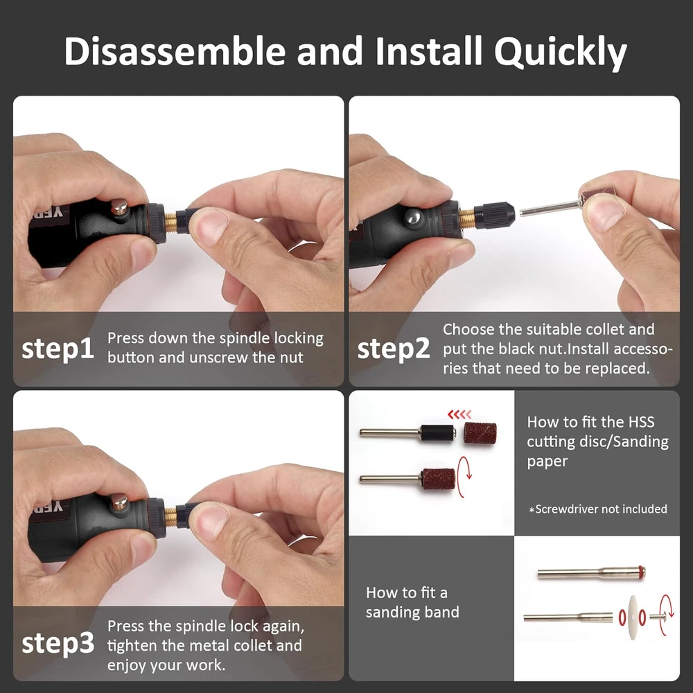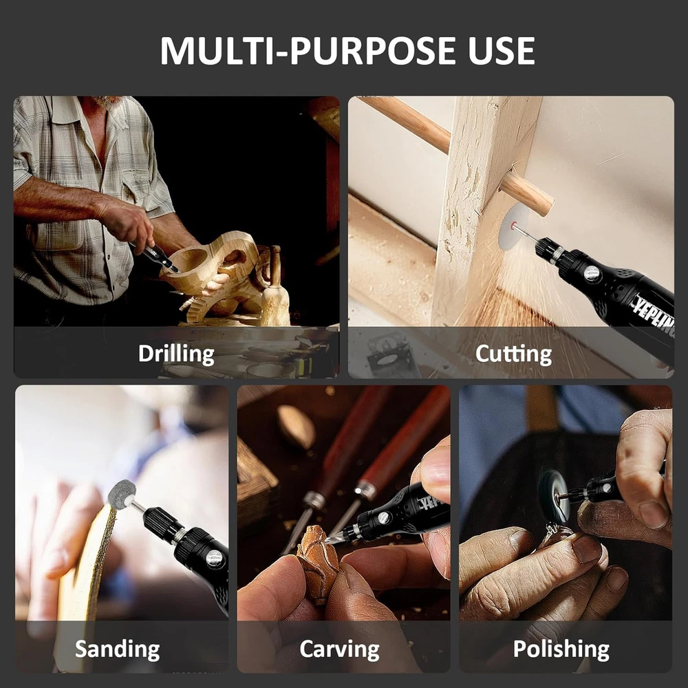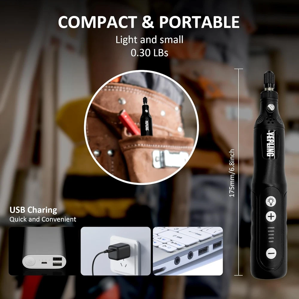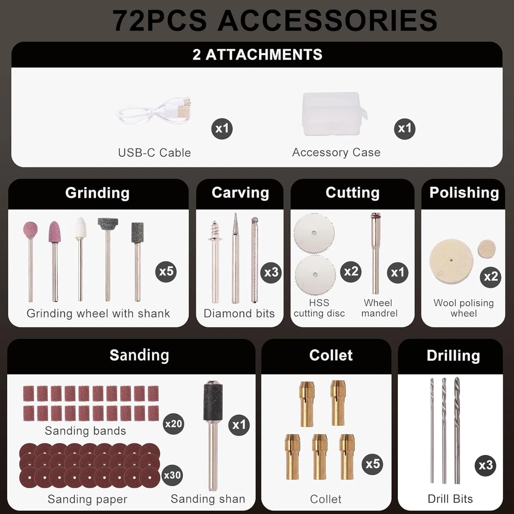 【FRONT LED WORK LIGHTS】Brand new design LED work lights illuminates dark working spaces, allows to easily see whatever you are working on. Help you work better and comfortable. 【5 SPEEDS FOR VERSATILE PROJECTS】There are 5 speeds adjustable (3,000rpm, 6,000rpm, 9,000rmp, 12,000rmp and 15,000rpm) to meet different operational needs, allowing you to easily complete light work such as buffing, cleaning, carving, and nail grooming. 【USB CONNECTOR FOR CONVENIENT CHARGE】2000mAh large-capacity power battery. Charging 2 hours for continuous work 120 minutes, 3.7 V rechargeable lithium battery for safe operation and long using life.(Fully charge the tool before first use) 【DIVERSITY ROTARY TOOL ACCESSORIES】This rotary tool kit includes a high-performance, low-noise rotary tool, as well as 72 of the most popular electric rotary tool accessories, such as sanding belts, grinding wheels, diamond bits, and more. 【ATTENTION】Different tool accessories fit different collets. If the tool accessories come off easily from the head of rotary tool, please replace a new collet to fit it. Product Description