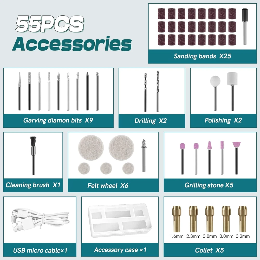 🛒【MULTIPURPOSE ROTARY TOOL SET】- Compared with most rotary tools , NEU MASTER cordless rotary tool provides 55 practical power rotary tool accessories, suitable for wide applications, such as polishing, sanding, engraving, grinding, carving and drilling work. Easily meet your need for Halloween DIY projects at home or events,NOT for heavy duty projects. A great idea for craft creation in wood, plastic, ceramic tile, glass, stone, metal. 🛒【EASY OPERATION & COMPACT】- Easy operation. Ultra compact, ultimate precision, comfortable control operation, lightweight, small but powerful.No wrench needed, it is easy to change bits and collets tool free with NEU MASTER rotary tool. Easy to maintain accurate concentricity while using the chuck to fix accessories. 🛒【3 POWERFUL SPEED & GREAT VENTILATION】- One button to switch rotation speed among 5,000, 10,000 and 15,000rpm, which allows to easily control speed and adapt to power needs in most of working application. Allow you did your projects safely and precisely. The ventilation holes on housing effectively dissipate the heat of running motor, keep consistent performance,extend battery and tool's life. 🛒【QUICK USB CHARGING & LONG WORKING TIME】-NEU MASTER 3.7V rotary tool cordless with built-in rechargeable battery only takes two hours to fully charge. It can continuou work for a long time and support for multiple working times on a single charge. Most commonly MICRO USB port alllows rotary tool charge anytime, anywhere. Standard charge cable Avoid the trouble of finding missing charger. 🛒【CONVENIENCE & LIGHTWEIGHT】- Cordless design makes operation simple and easier to carry in your pocket. Mini size rotary tool body just like holding a pen while in use, lightweight and comfortable, ultimate control, reduce user fatigue for long hours of operation.Not recommended for heavy duty projects. It will be NEU MASTER's pleasure to assist user to deal with any questions about tools. Product Description The NEU MASTER Rotary Tool is lightweight and compact, perfect for delicate and light DIY small projects. It is the best tool for your DIY projects. Product Features: USB Charging: Equipped with a USB power cord, making charging easier and more convenient. Lightweight and Small, portable to carry it to anywhere. Suitable for different DIY working situation Variable Speed Tool: With 3 different levels of RPM, which can be adjusted among 5000 to 15000 RPM. 3.7 Volts of Cord-free Power :3.7 volts of high power with cordless performance allows for greater versatility of use – charge anytime. Easy-to-use: The tool with 4 different sizes compatible collet and spindle lock allows you to quickly and easily change accessories on Rotary tools. Application: Perfect for Arts and crafts projects and small home repairs working like sanding, polishing, carving. Specification list: Rate voltage: 3.7 V Battery type: 3.7 Li-on / 0.6Ah Charging voltage: 5V DC (USB) Charging time: 2hr 3-speed: 5000/10000/15000 rpm Charging cord: Micro USB Collet diameter: 1.6/2.3/3.0/3.2mm 55 multi-functional accessories NEU MASTER Cordless Rotary Tool with 55 pcs Accessories What you will get : 1 x Cordless Rotary Tool 1 x USB charging cable 1 x Accessories Case 1 x User Manual 55 multi-functional accessories : 2 x Drilling 2 x Polishing 5 x Collet 5 x Grilling stone 6 x Felt wheel 1 x Cleaning brush 25 x Sanding bands 9 x Garving diamon bits Special Design and Features of Rotary Cordless Rotary Tool 4 Collet Sizes The rotary tool comes with 4 collet sizes(1.6mm,2.3mm,3.0mm,3.2mm) to fits different suitable accessories and it is easily changed .Please make sure the bits are fixed in the rotary tool every time. 3 Rotation Speed 3 Rotation Speed controled by one button - 5000/10000/15000 rpm, shows clearly with three red light on the tool body. you can make the speed control finely by adjust the tool to better complete the job. Ergonomics Design The front end of the machine adopts the soft curve design in line with ergonomics, which is more suitable for work, and can reduce the fatigue caused by long time use, so as to better put into work. USB Charging Rechargeable via supplied compatible USB connector at any place, more conveniente for your charging. Full charging time is about 2 hours and can be used about 90 minutes. Carving Sanding Polishing Drilling Grinding Cleaning
