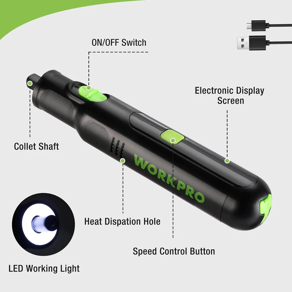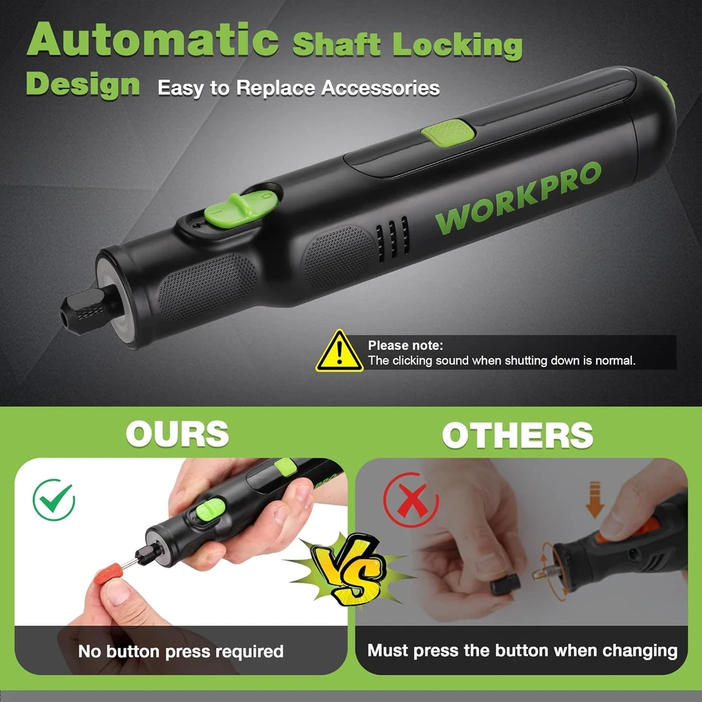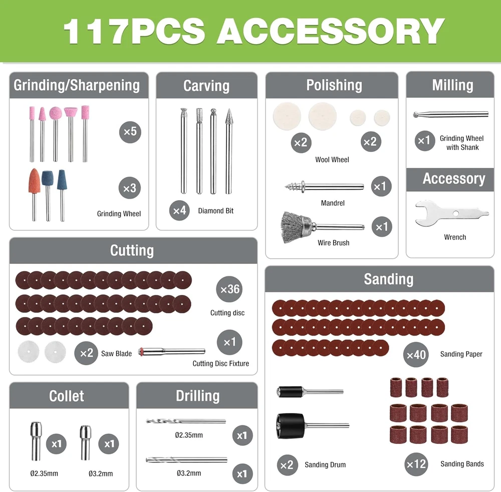 Versatile mini rotary tool: This high-performance, low-noise rotary tool comes with 117 accessories and LED light, making it ideal for home projects and crafts such as grinding, engraving, cutting, drilling, sanding, and polishing. LED Light design helps you enjoy enhanced visibility for precise work, ensuring impeccable results every time Variable Speed Adjustment: The multi-purpose rotary tool, featuring 6-speed settings for 5000/10000/15000/20000/25000/30000 RPM, is strong and steady. Whether it's delicate engraving or robust cutting, its adjustable speed range guarantees for project's demands Quick Type-C Charging: This cordless rotary tool kit is easy to use and powerful, equipped with Type-C charging and 2 rechargeable build-in batteries. Bid farewell to long down times - It charges quickly in just 1.5 - 2 hours, indicated by five lights turning white, and can last up to 200 minutes Compact & Lightweight: Compared to 4 V rotary tools, 8 V wireless rotary tool kit provides sufficient power to handle tasks of various intensities. Compared to the weight of 12 V rotary tools, our tool weighs only 0.5 pounds and measures 7.48 inches in length, making it your best choice. It also comes with a tool bag for easy carrying and convenient storage Auto-Locking Protection: Our mini cordless rotary tool improves greatly the efficiency of accessory replacement by the automatic locking design, only need to screw the shaft lock to replace accessories. This design enhances safety by securing the spindle during tool use, preventing accidental slipping or rotation Attention: 1. When turned off, the product automatically locks the shaft, causing a locking sound. This is normal and nothing to worry about. 2. Recharging per 3-6 months will prolong the life of the cordless rotary tool if it is not used often. 3. For safety, it is not supposed to use while charging Product Description AUTOMATIC SHAFT LOCKING DESGIN Compare with other mini rotary tool, the automatic shaft lock enables you effortless accessory replacement. UNIVERSAL USB-C CHARGING PORT It can be convenient to charge anywhere with the USB plot, like laptop, powerbank, car charger, etc. It's supported to charge with C-C cable. 1 Engraving 2 Cutting 3 Sanding 4 Polishing 5 Drilling 2 COLLET SIZES It includes 2.35mm and 3.2mm collet sizes, providing versatility and compatibility with various accessories for precise carving and grinding tasks. LED HEADLIGHT The LED light can provide bright illumination for precise work, even in dark or tight spaces. 6 SPEED SETTING It spins up to 30,000 RPM to give you plenty of power and control. EASY CARRY A portable carrying bag makes both the rotary tool and accessories convenient and easy to carry anywhere. Is it normal to hear an emergency shutdown sound when the power is turned off? Yes, it is normal and completely safe to hear that sound when the power is turned off. It’s the sound of the automatic spindle lock engaging. Can it cut metal? Yes, it can cut softer metal wires. It can also cut copper pipes with a 4mm wall thickness, and it needs to be done slowly.