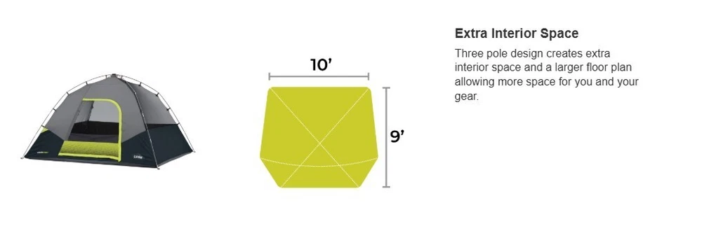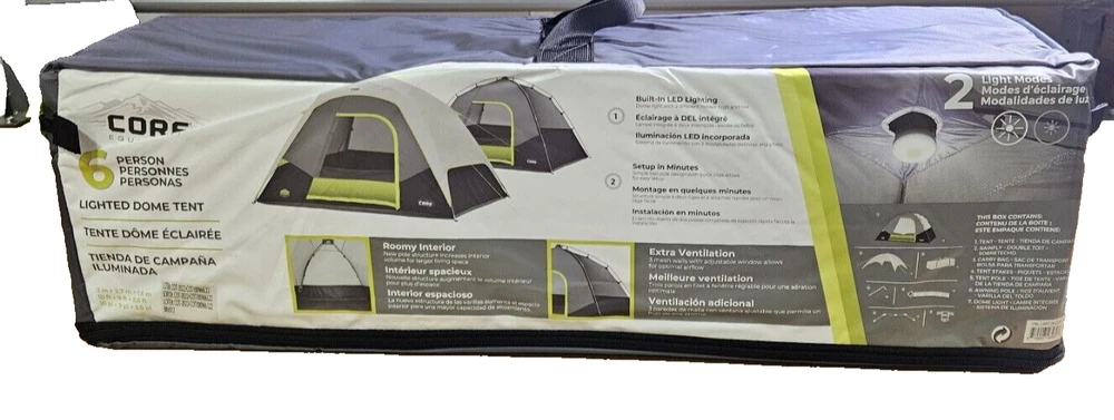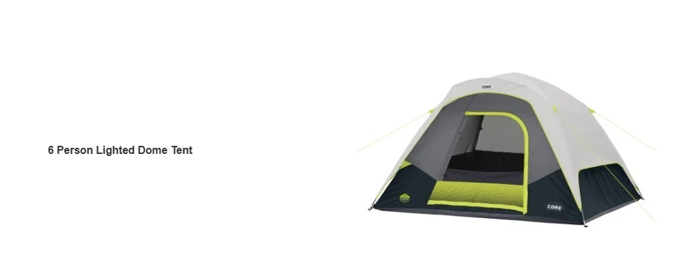 Get ready for an exciting camping adventure with the Core Equipment 6-Person Lighted Dome Tent. This spacious and durable tent is perfect for groups who want to stay comfortable and dry during their outdoor travels. The tent features a waterproof and lightweight design, making it easy to transport and set up. With a capacity of 6 people, this double skin tent is ideal for larger groups who want to stay protected from the elements. The tent's gray color and dome shape add a touch of elegance to your camping gear. The tent also comes with a carrying case, making it easy to transport to your next camping destination. Get ready for a comfortable and fun camping experience with the Core Equipment 6-Person Lighted Dome Tent. Features: Dimensions: 10 ft x 9 ft Sleeps 6 People Built-In LED Lighting Sleeps 6 or Fits 2 Queen Air Mattresses Specifications Brand: CORE Color: Gray Dimensions: W x L x H9 ft. x 10 ft. x 66 in. Model40223 Sleeping Capacity6 Person Tent Material Polyester Type Dome