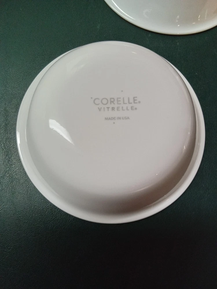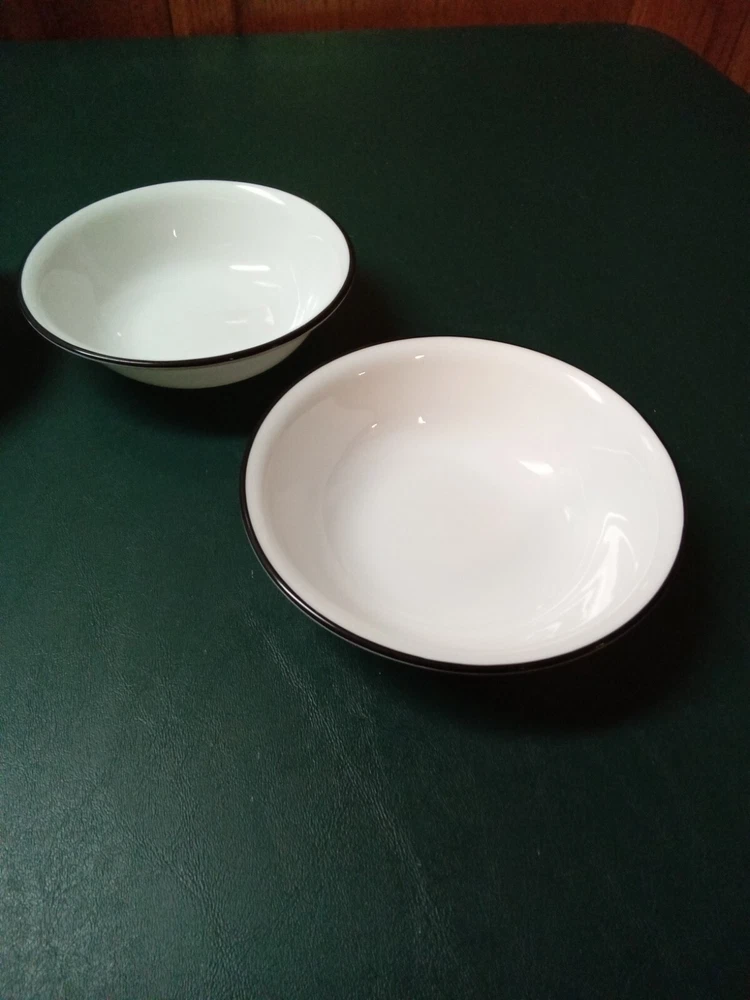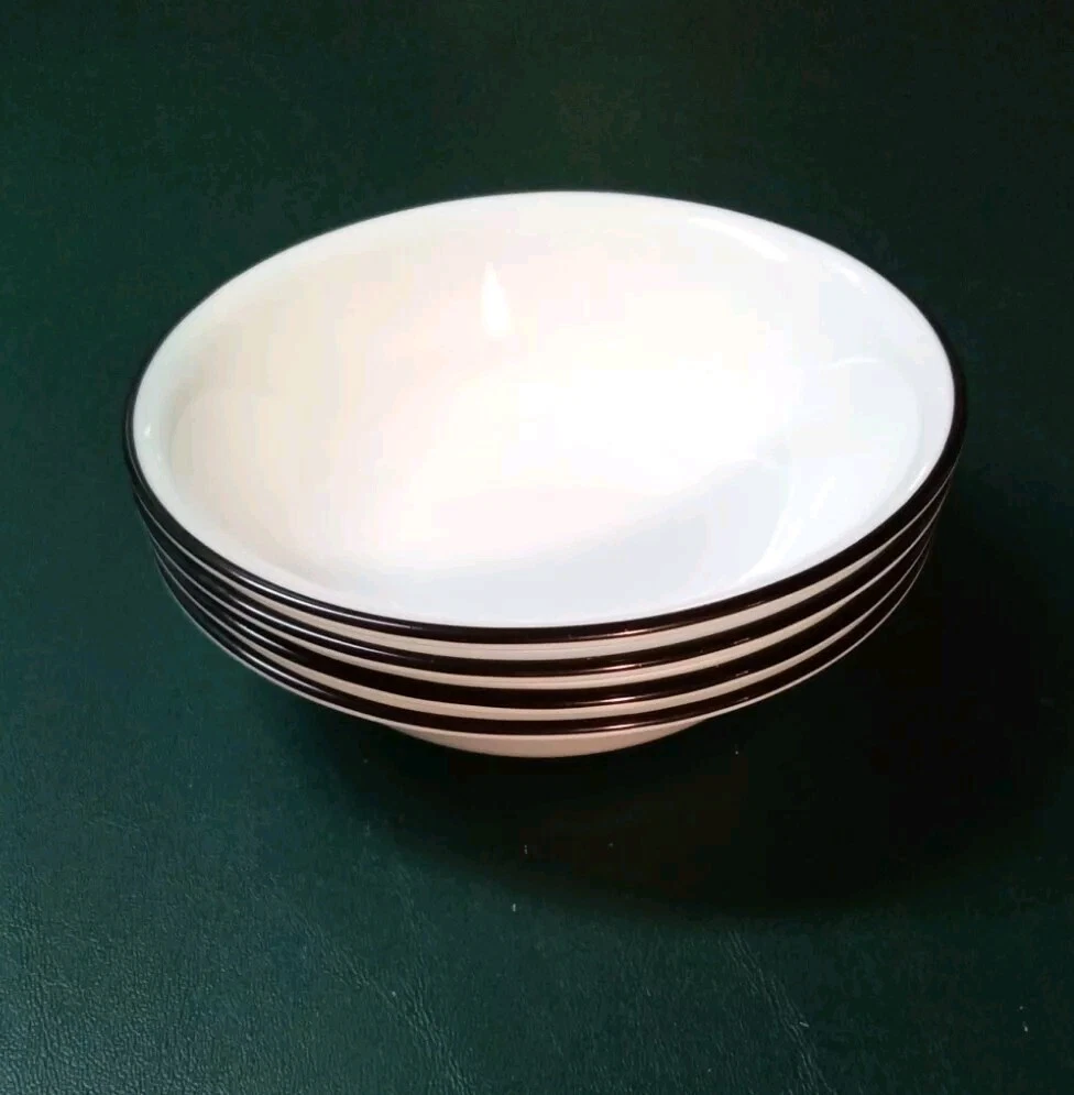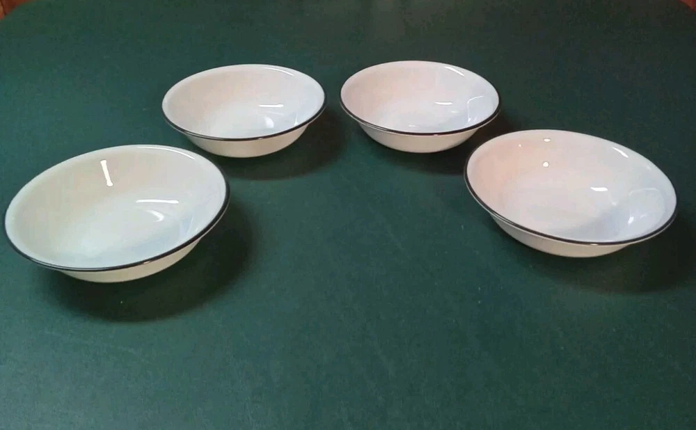 Enhance your dining experience with this set of four Corelle Garden Get Away fruit/dessert bowls. The round glass bowls feature a shiny finish and black trim, making them perfect for all occasions. Measuring 5-1/4 inches in diameter, these bowls are ideal for serving fruits, desserts, and other dishes. Crafted in the United States, these original Corelle bowls are made of high-quality glass Vitrelle material that ensures long durability. The set includes four bowls, making it perfect for family dinners or large gatherings. These bowls are in good used condition with no chips or cracks. See photos.