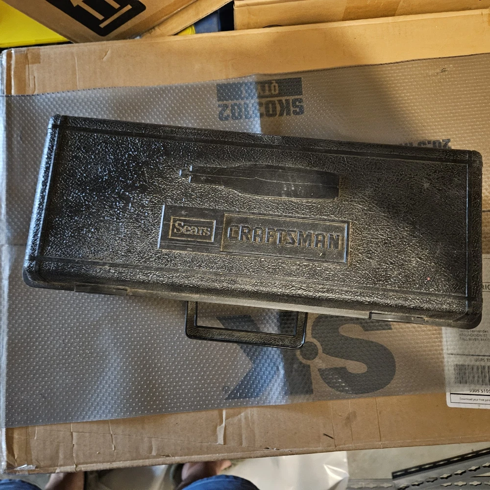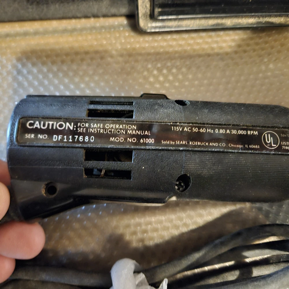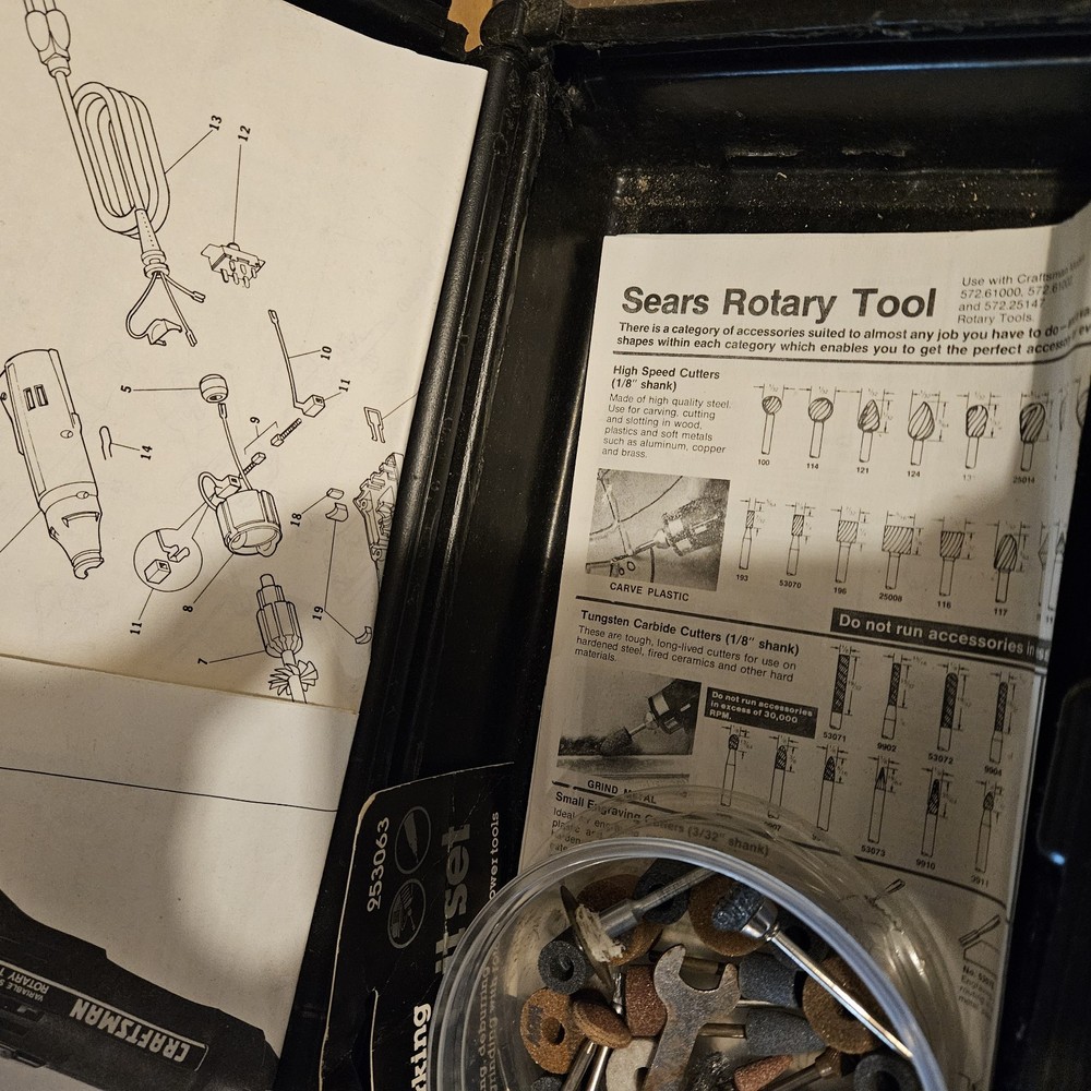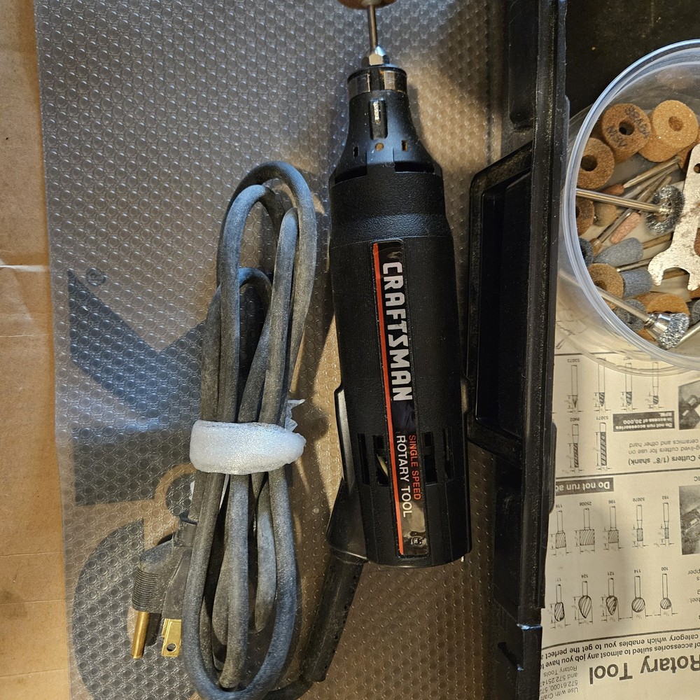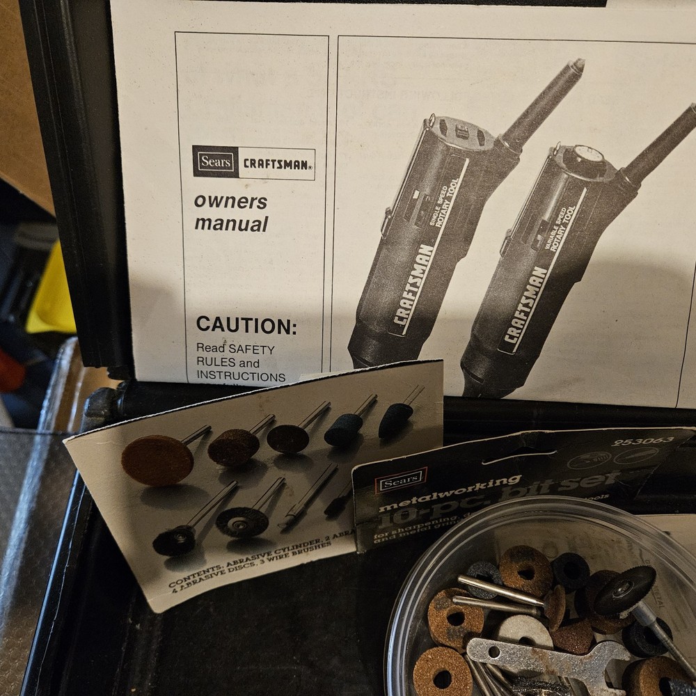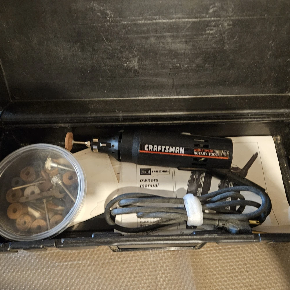 Craftsman Single Speed Rotary Tool (Model 61000) is a corded electric tool kit. It comes with a Craftsman box, accessories, and manual. The tool features variable speed control and a keyed chuck. Made in the United States, this black rotary tool operates at 120V. Tool has been tested and works.