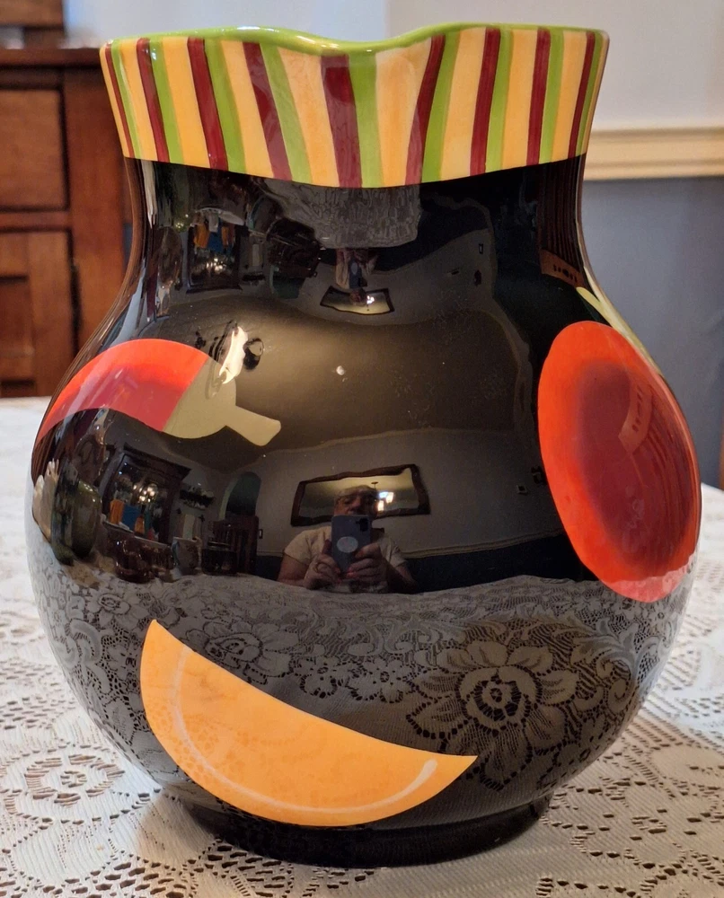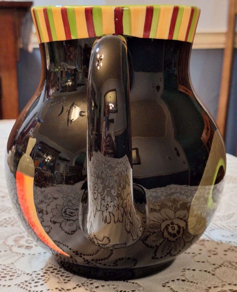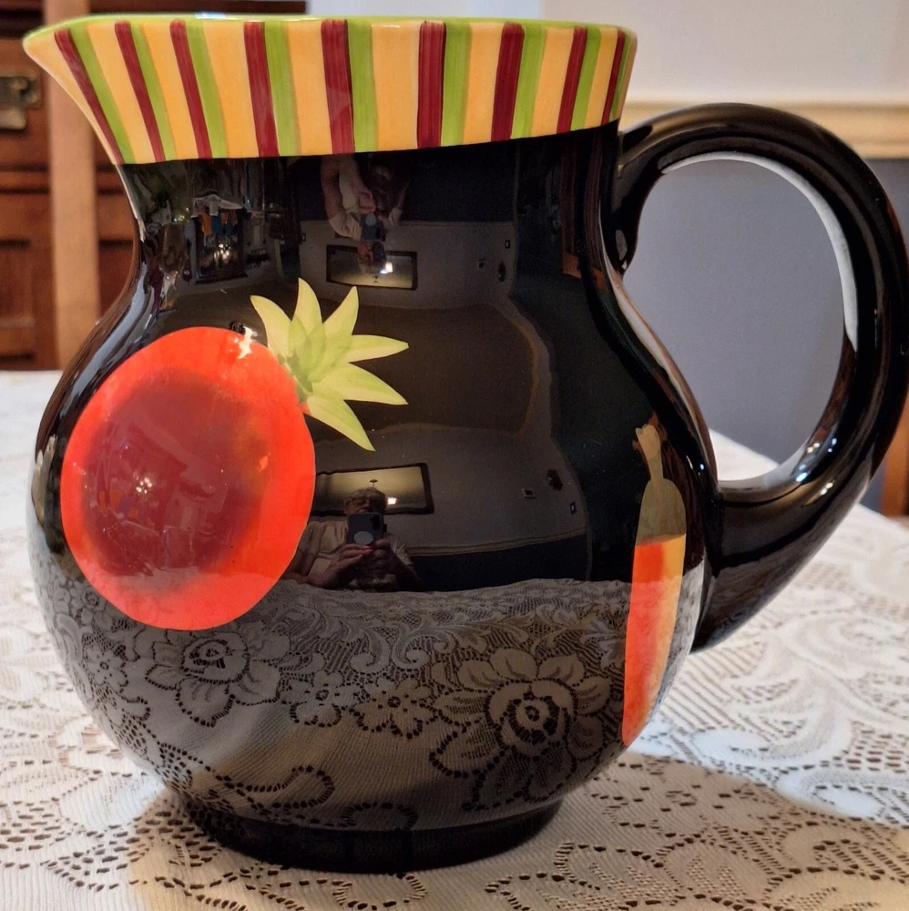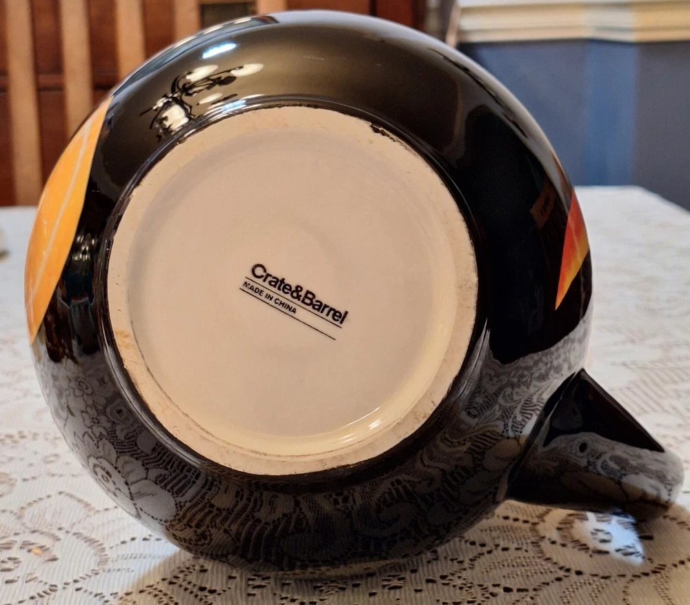 Add a splash of color to your kitchen with this black ceramic pitcher from Crate and Barrel. The all-over pattern features bright fruits and handles that give it a contemporary style that is perfect for all occasions. With a 2 qt capacity, this pitcher is perfect for serving your favorite beverages. The glossy finish and spout to handle width of approximately 9 inches makes it a great addition to any dinnerware and serveware collection. This item is not personalized and is made in China. In Excellent condition. No chips or cracks. Preowned. Please see photos. Disclaimer : Many of the items I sell are vintage, antique or used, and may not be in perfect condition. They may have age-related wear, imperfections or a minor chip here and there. You may also see air bubbles in crystal items, which are naturally occurring. I will point out any and all of these to the best of my ability. Please review the photos provided carefully, read the description, and judge accordingly. All items are insured for the purchase price in case of damage due to shipping, so please do not throw away any of the original packing materials, the shipping box, or the broken item as these will have to be returned to Memory Lane Treasure in order to file an insurance claim for reimbursement of the item. The buyer is responsible for return shipping costs and reimbursement to the Buyer will not take place until the Seller has received all of the above. Please feel free to contact me with any and all questions you may have before purchasing an item—I am happy to assist. Thank you for visiting Memory Lane Treasure! Shipping and Handling : The misnomer regarding Shipping is that the amount charged only covers what it costs to ship an item by its weight. Shipping covers more than just the weight of an item, it also includes logistics costs such as packing supplies, inventory storage, transportation, and delivery. Due to the rising costs in our economy, Memory Lane Treasure has had to start charging for shipping; however, to keep the total cost as low as possible for our customers, Memory Lane Treasure has not yet started to charge a Handling fee, which is the cost of labor. Also note, that depending on the destination of the purchased item, eBay may calculate a different Shipping from what was listed by Memory Lane Treasure. Should that occur, it is not something done by our facility and Memory Lane Treasure should not be held responsible. 100% Customer Satisfaction is Memory Lane Treasure’s ultimate standard. Should a customer have any questions or concerns, they are always encouraged to contact Memory Lane Treasure before purchasing an item—I am happy to assist.