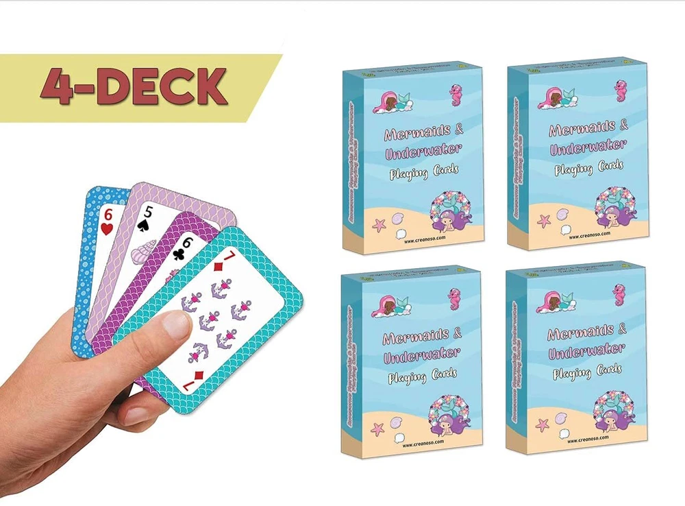 Creanoso Mermaids & Underwater Playing Cards (4-Deck) - Group Activity Game Cards Corporate Gifts for Girls - Women School Token Incentives - Fun Recreational Entertainment Tool for Friends Captivating Playing Cards Collection (4 Decks - 54 Cards Set): This collection includes four decks, offering a total of 216 double-sided, poker-sized cards. Featuring unique designs with colorful and vibrant images, these cards engage and captivate players of all ages. Each card is thoughtfully crafted with visually appealing graphics and vivid hues, designed to stimulate and enhance the enjoyment of card play. Ideal for Group Fun and Recreation: Whether you're at home, in the living room, kitchen, or at the office, these playing cards make an excellent recreational tool for enjoying quality time with family and friends. Our cards bring fun to life with their ease of use, vibrant designs, and lively colors, sparking a passion for card games. Thoughtful Rewards Token and Handing Out Presents: This offers a great way to share fun with family and friends, and make thoughtful presents for any occasion. Whether celebrating during a family celebration, graduation day, corporate anniversary, work promotions, or simply want to share and gift to friends. Share the joy of fun and thoughtful gifting with our playing cards that ignite curiosity and enjoyment among friends and loved ones. Durable and Water-Resistant Construction: Each card, sized at 2.2x3.4 inches with rounded corners, is printed on matte cardstock and coated with a water-resistant finish. This ensures that the vibrant designs remain intact and durable through daily use. Cost-Effective Bulk Options for Leisure Activities: Ideal for home and office activities, group handing out presents, or adding variety to your personal card collections, our bulk packs offer significant low-cost options without compromise. Whether you need a few or a few hundred, our bulk pack options are designed to meet your needs and budget. Captivating Playing Cards Collection (4 Decks - 54 Cards Set): This collection includes four decks, offering a total of 216 double-sided, poker-sized cards. Featuring unique designs with colorful and vibrant images, these cards engage and captivate players of all ages. Each card is thoughtfully crafted with visually appealing graphics and vivid hues, designed to stimulate and enhance the enjoyment of card play. Ideal for Group Fun and Recreation: Whether you're at home, in the living room, kitchen, or at the office, these playing cards make an excellent recreational tool for enjoying quality time with family and friends. Our cards bring fun to life with their ease of use, vibrant designs, and lively colors, sparking a passion for card games. Thoughtful Rewards Token and Handing Out Presents: This offers a great way to share fun with family and friends, and make thoughtful presents for any occasion. Whether celebrating during a family celebration, graduation day, corporate anniversary, work promotions, or simply want to share and gift to friends. Share the joy of fun and thoughtful gifting with our playing cards that ignite curiosity and enjoyment among friends and loved ones. Durable and Water-Resistant Construction: Each card, sized at 2.2x3.4 inches with rounded corners, is printed on matte cardstock and coated with a water-resistant finish. This ensures that the vibrant designs remain intact and durable through daily use. Cost-Effective Bulk Options for Leisure Activities: Ideal for home and office activities, group handing out presents, or adding variety to your personal card collections, our bulk packs offer significant low-cost options without compromise. Whether you need a few or a few hundred, our bulk pack options are designed to meet your needs and budget. Shipping from the USA All of our products are shipped from the USA, ensuring quick delivery to your destination. Payment We offer the following payment methods: PayPal, credit card, bank transfer, and eBay's secure payment system. Free Shipping & Free Returns Shipping within the USA is FREE. Additionally, any return is absolutely free for you. Risk-Free Purchase You have the option to return an item within 30 days without any justification. We cover the return shipping costs! Fast Shipping We ship immediately upon receipt of payment. Generally, the package is delivered within 2-3 days in the USA. If it takes longer, we will contact you. Quality and Costs Made in Europe, USA, China No customs fees or additional charges Total satisfaction guarantee Invoice with declared VAT available upon request in .pdf format Feedback Your feedback is very important to us. After you pay for your purchase, you will automatically receive positive feedback from us.