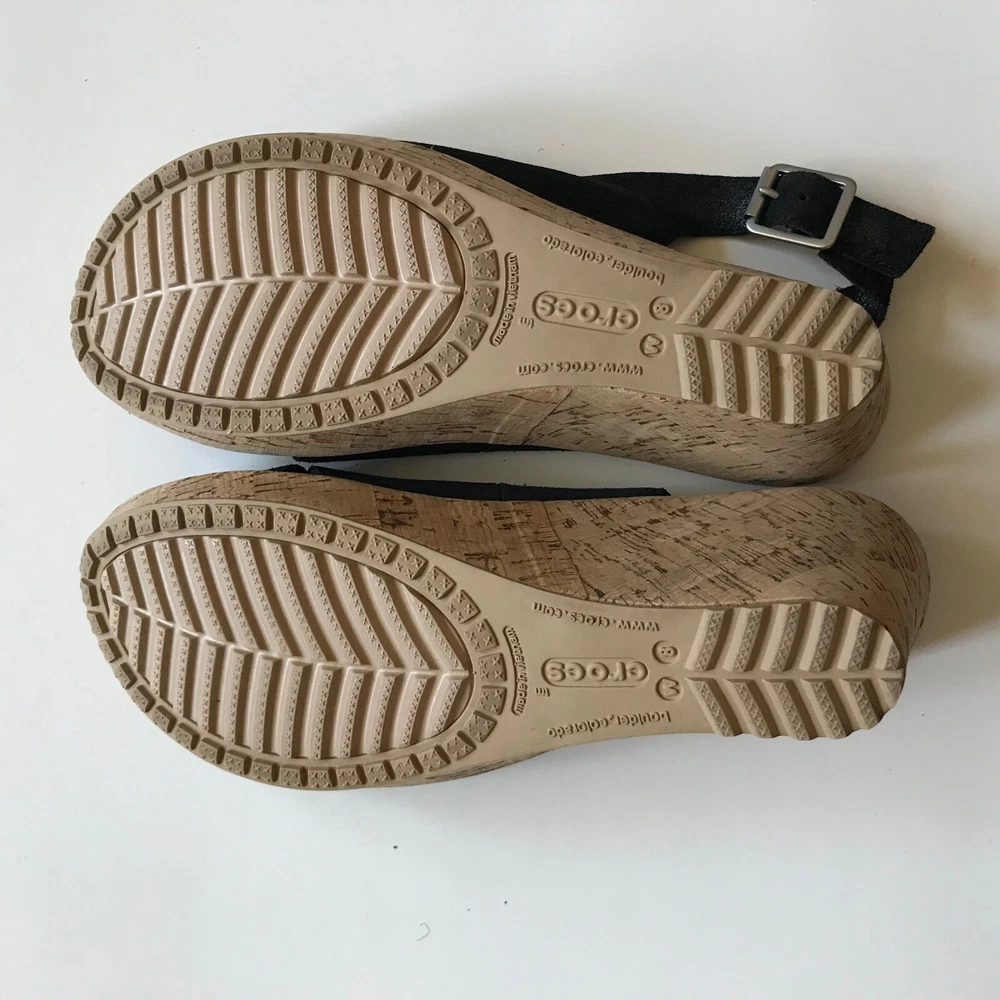 Crocs A-Leigh Womens 8 Leather Cork Wedge Heel Slingback Peep Toe Sandal Black