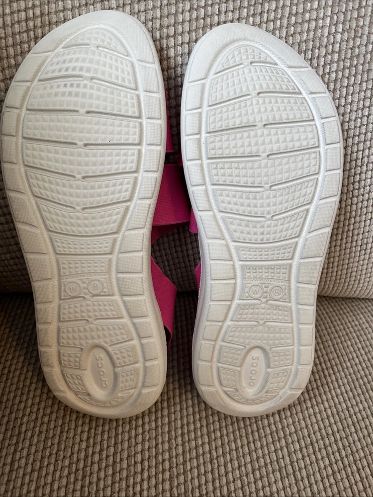 These Crocs LiteRide Stretch sandals are the perfect addition to your summer footwear collection. With a slip-on closure and flat heel style, they provide both comfort and convenience. The solid pink color and Crocs logo accents make them a stylish choice for any casual occasion. These sandals are designed with a comfort strap and stretch features, making them perfect for women's size 8. Whether you're running errands or going to the beach, these Crocs LiteRide Stretch sandals are a must-have. Add them to your cart now and experience the ultimate comfort and style.