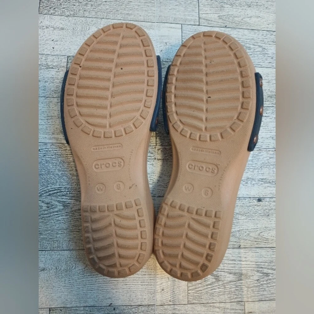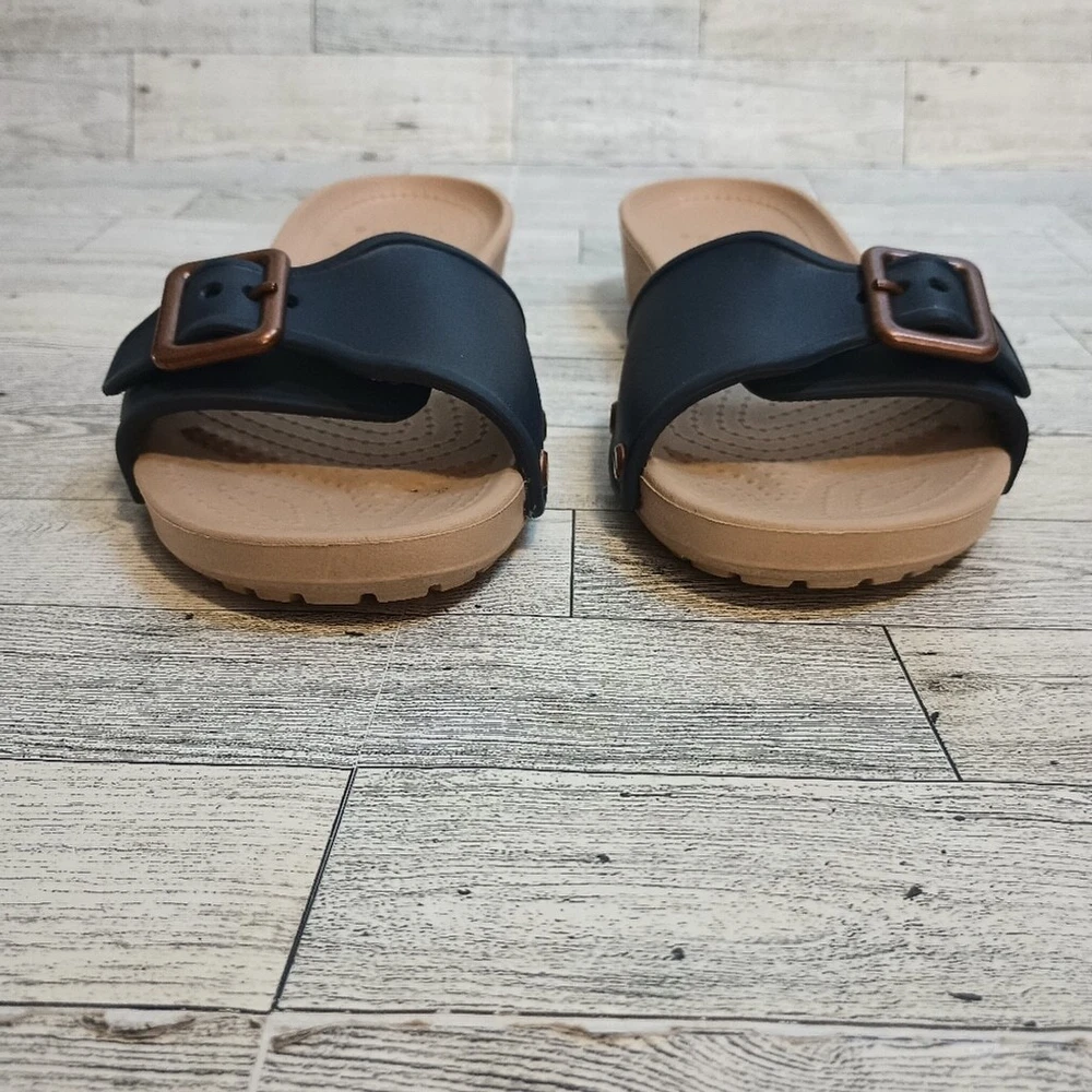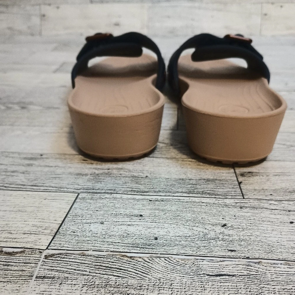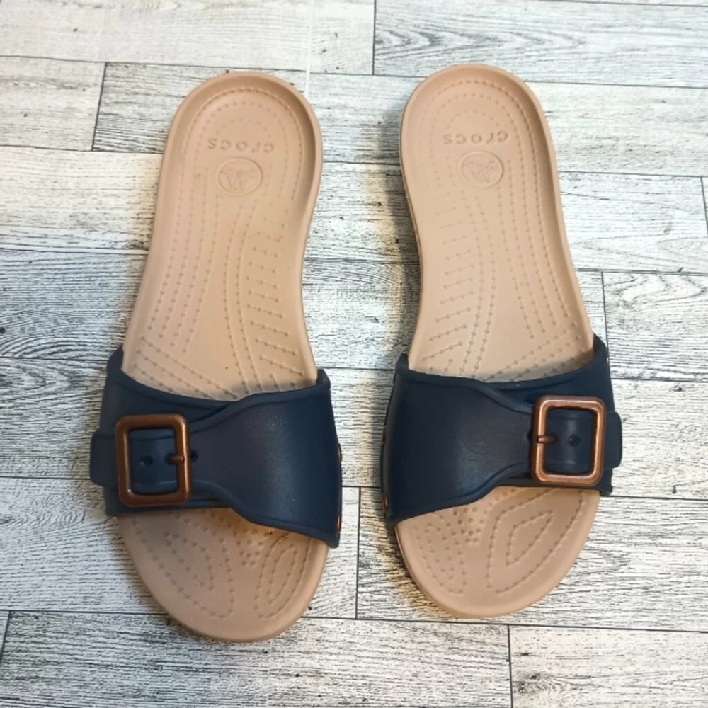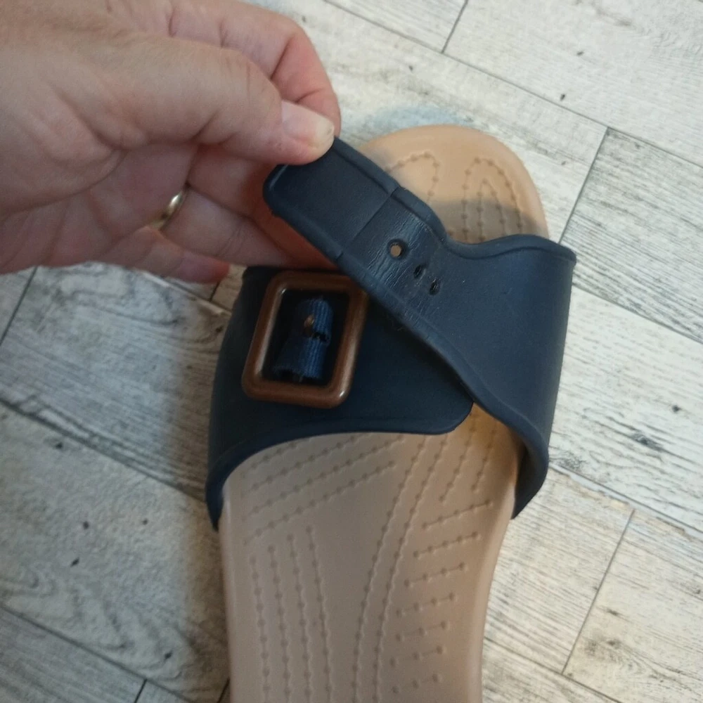 Crocs Women's Size 8 Sarah Buckle Slip On Comfort Sandals Blue Copper adjustable buckle for comfort cushioned comfort fit Great Used Condition ( see photos for details)Flaws: no holes, stains, or tears Please see photos for measurements in inches Washing instructions: see photos if instructions are available Non smoking home Vintage clothing comes with a history and I do my best to inspect for all flaws but I might miss tiny snags or holes. see photos of any flaws if found. Fast shipping! We are happy to answer your questions summer, casual everyday boho bohemian beach, vacation resort waterproof