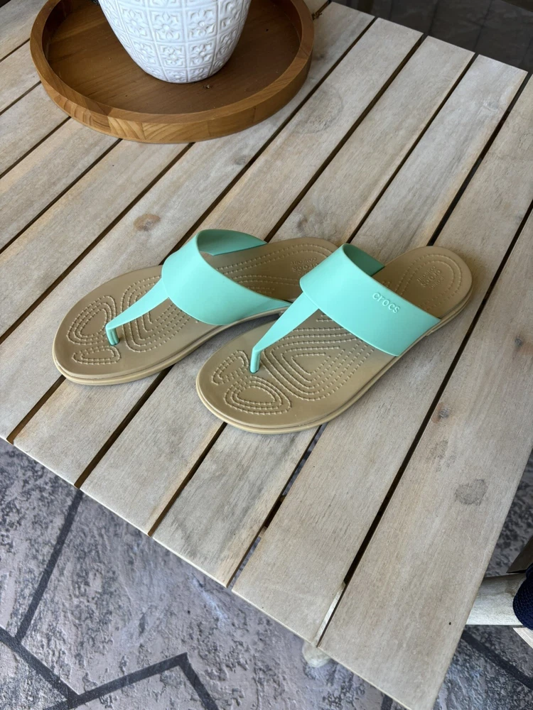 LIKE NEW/ NEVER WORN Step into comfort with the Crocs Women’s Tulum Thong Flip Flops. These sandals feature a solid teal blue and beige color scheme, with a jade stone hue that adds a touch of sophistication to your casual look. The slip-on style ensures easy wearability, perfect for those on-the-go moments or relaxed sunny days. Crafted with a durable rubber upper and designed for all-day comfort, these flip flops boast a flat heel style that's less than an inch high, making them ideal for everyday wear. The standard shoe width accommodates most foot sizes, ensuring a snug and comfortable fit for a size 6. Whether you're heading to school or enjoying a leisurely stroll, these Crocs sandals are a versatile addition to any wardrobe.