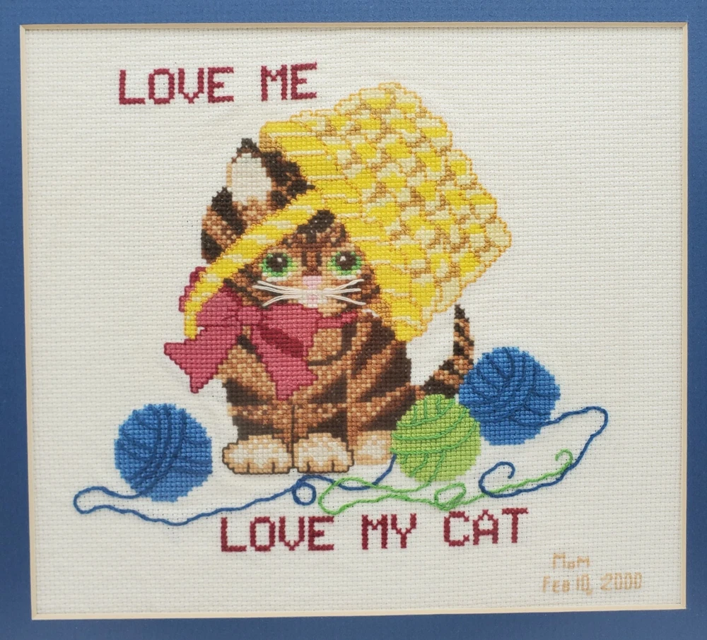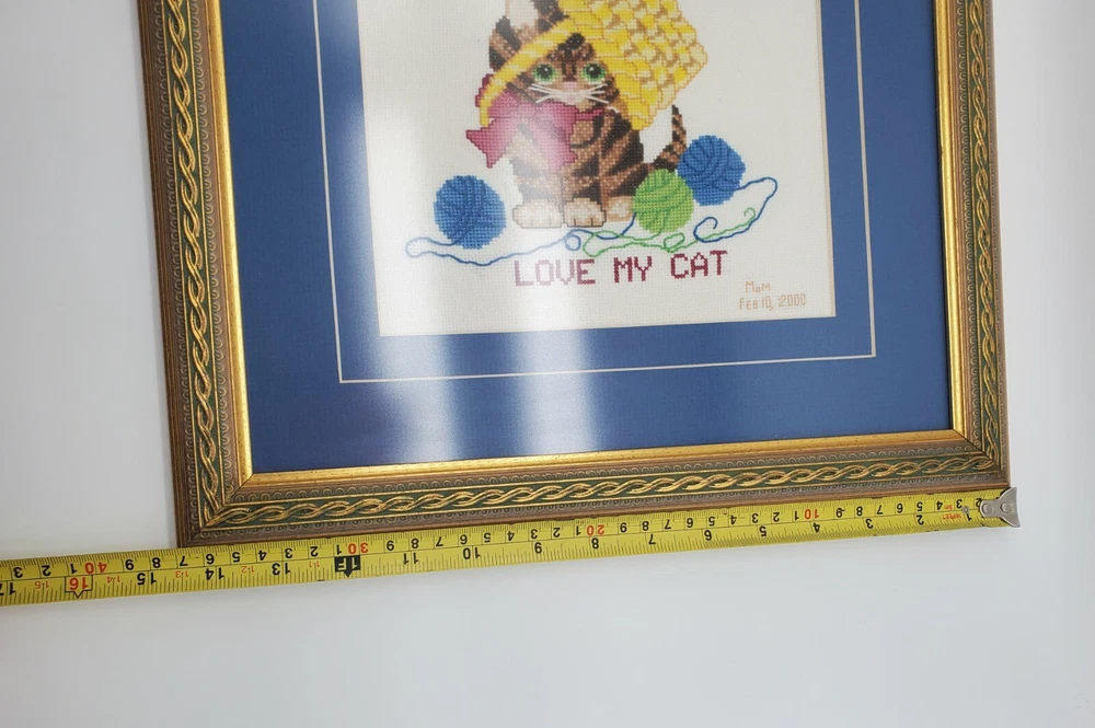 This is a Custom Framed Picture of a handmade Cross stitched, Love Me Love My Cat, Kitty In the Yarn Basket. It is stitched signed on the bottom right corner, Mom Feb 10, 2000. It has a blue matting, a gold wood frame with hints of green on it and has a paper backing that remains in tact. The custom framing info sticker also remains in tact on the back. It measures approximately 13 3/4" x 14 1/2". There is an area on the bottom, edge of the frame that has some scuffing. **See all photos of details ** This is on Good, Pre-owned condition. Shipped with USPS Priority Mail.