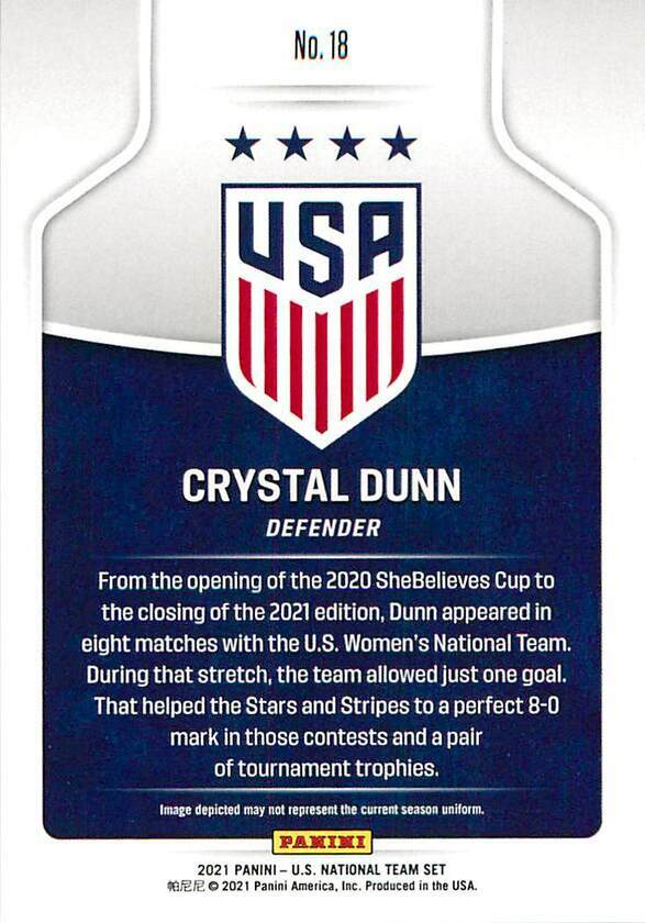 Welcome to my store listings. Listings all have the team name in the Description of the listing. For help with web or mobile app searches see my Search Tips page. Crystal Dunn 18 2021 Panini (Instant) U.S. National Team USWNT Description: See listing title and scan. NOTE: Full team sets, Men's and Women's combined, still available on the Panini Instant site. ($30 for 30 cards) Team Name: USWNT Condition: NrMt/Mt+ or better. Pack to sleeve. Related Store Items: Searching within the nearby major store categories by name, team, or card brand is the easiest way to find related items. SHIPPING I try and ship every day, but when sales are slow I miss a day. My central US location still provides a very fast shipping time to most of the country. For my most current shipping procedures and discounts visit my Shipping Procedures page. CONDITION/GRADING I grade cards using the Beckett Grading standards. Most people expect cards to come out of packs Mint and that is not the case. Cardboard cards often come out Near Mint, or Near Mint to Mint (NrMt/Mt). Finest and Chrome cards are usually Mint. Many new limited edition inserts and autographs are frequently not Mint. For singles from case listings I will use the lowest grade (NrMt/Mt+ or better) as my default. "Pack To Sleeve" means the condition is what you can expect from a pack. For higher value cards I will include specifics as part of the condition (white spot on corner, minor machine line on surface, rough edge). The scale I use is: NrMt/Mt, NrMt/Mt+, and Mint (Beckett 8.0, 8.5, 9.0. )