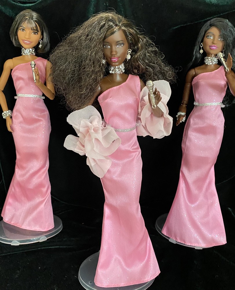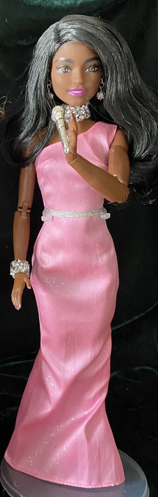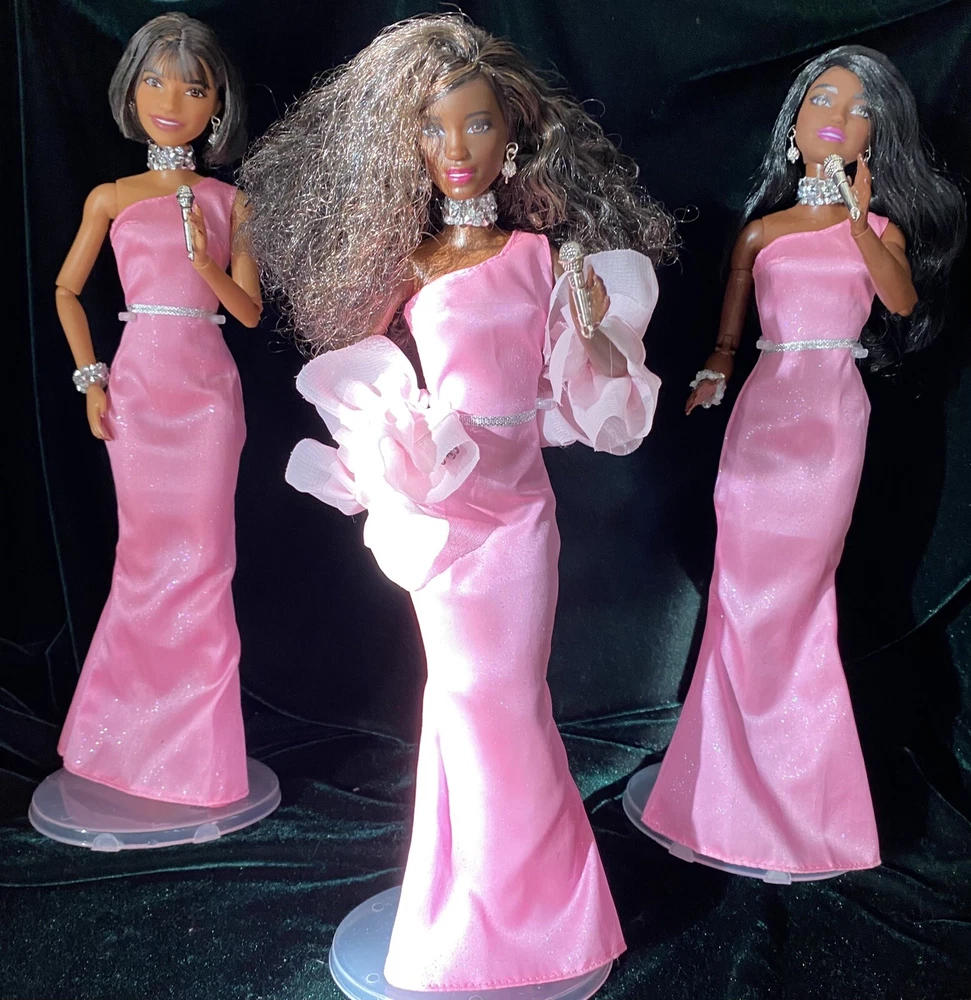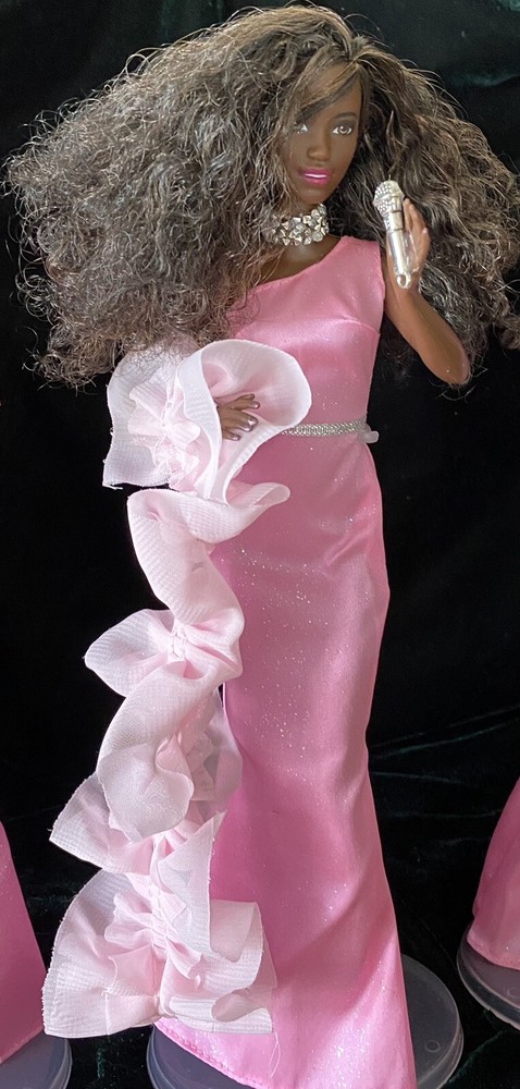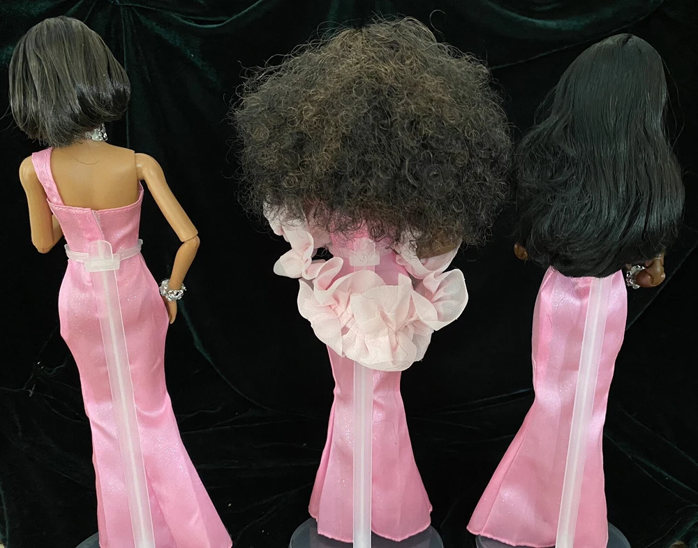 Whether you love the music of the Supremes or the movie Dreamgirls, this girl group is a lovely addition to any collection! These 3 beautiful dolls have been re-styled into an homage to the fashion and sound of Motown. The dolls are listed as a ‘used’ item only because they have been de-boxed, had their hair changed and are re-redressed. The lead-singer doll, wearing the pink shawl, has arms/legs that do not bend. The second doll, with her short bob hair-cut, has articulated elbows, wrists and knees. The third doll, with long, thick, silky black hair is a hybrid. She was made with a new head/new MadeToMove body. Each doll has had their hair re-styled in a nod to the girl groups of the 1960s. All our lovely ladies wear new, tailored pink taffeta style gowns, inspired by the real Supremes (see the original group pictured). And each wears different pink high-heel shoes that compliment their gown. Included in this One-Of-A-Kind ensemble are the following; 3 New African American Barbie Dolls 3 New Pink Gowns & shoes 1 Pink Ribbon Wrap Custom Sparkly Earrings Faux-diamond choker/bracelets New Silver-tone toy microphones 3 New Doll-stands (pictured) These are our most popular homage series - a unique collectible and a beautiful display set. This is also the last edition that will be sold. We don’t have any more pink gowns! ***************************** All ModelAgencyDolls are thoroughly cleaned and their hair is shampooed/conditioned with salon products. All ensembles/accessories are cleaned, laundered and packaged with care. Your purchase is shipped from a non-smoking, odor free home. Thank you for shopping with eBay ModelAgencyDolls today!