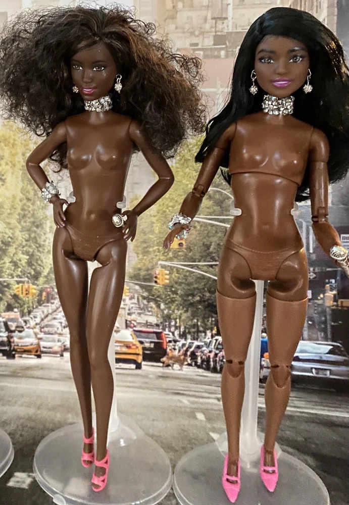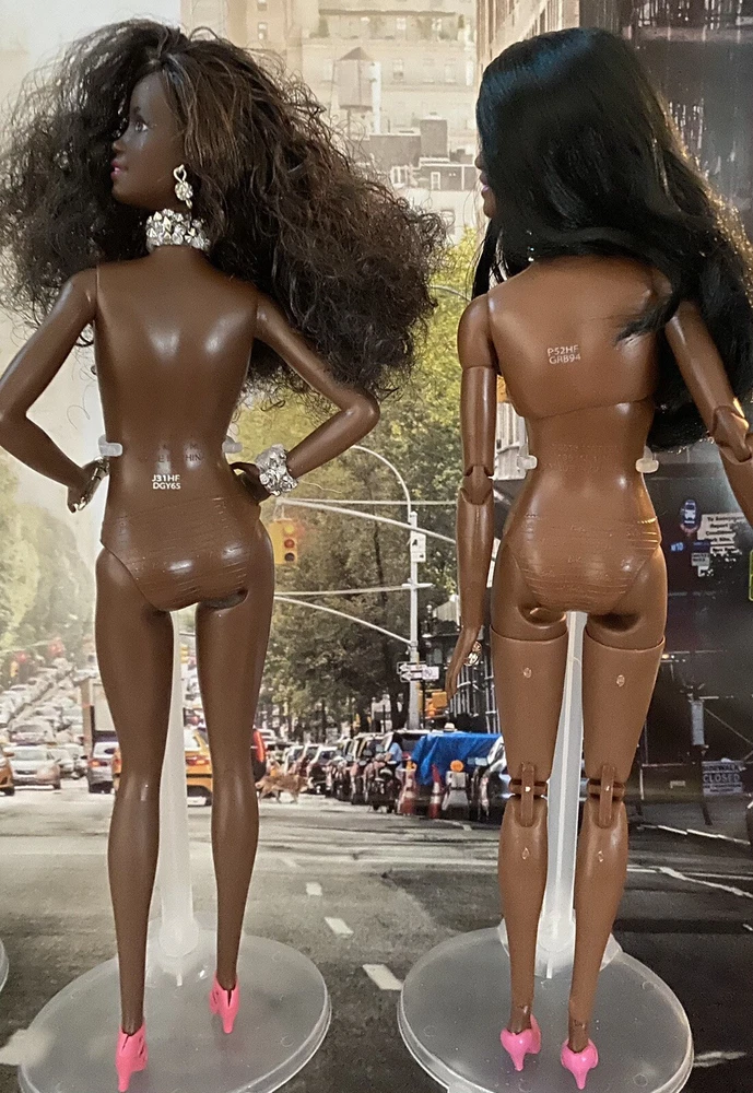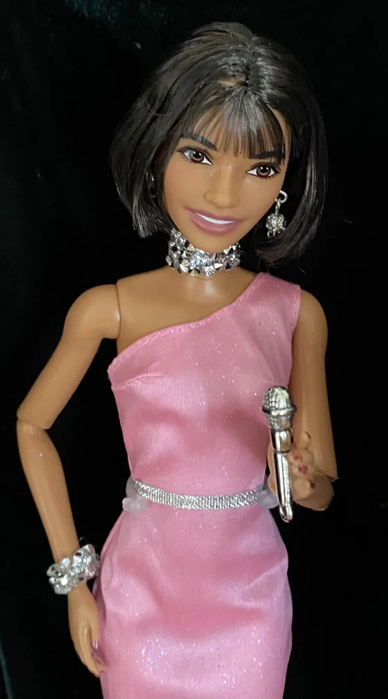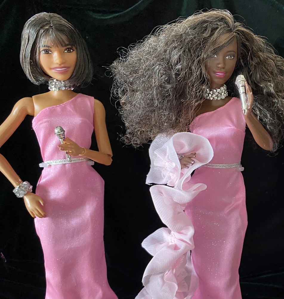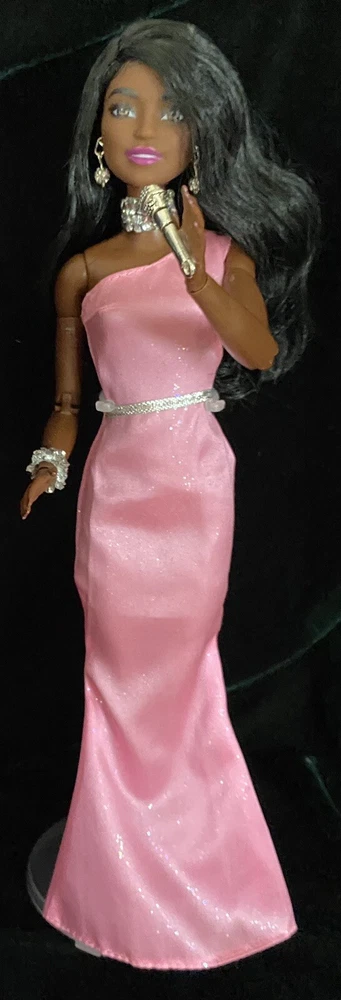 Whether you love the music of the Supremes or the movie Dreamgirls, this girl group is a lovely addition to any collection! These 3 beautiful dolls have been re-styled into an homage to the fashion and sound of Motown. The dolls are listed as a ‘used’ item only because they have been de-boxed, had their hair changed and are re-redressed. The lead-singer doll, wearing the pink shawl, has arms/legs that do not bend. The second doll, with her short bob hair-cut, has articulated elbows, wrists and knees. The third doll, with long, thick, silky black hair is a hybrid. She was made with a new head/new MadeToMove body. Each doll has had their hair re-styled in a nod to the girl groups of the 1960s. All our lovely ladies wear new, tailored pink taffeta style gowns, inspired by the real Supremes (see the original group pictured). And each wears different pink high-heel shoes that compliment their gown. Included in this One-Of-A-Kind ensemble are the following; 3 New African American Barbie Dolls 3 New Pink Gowns & shoes 1 Pink Ribbon Wrap Custom Sparkly Earrings Faux-diamond choker/bracelets New Silver-tone toy microphones 3 New Doll-stands (pictured) These are our most popular homage series - a unique collectible and a beautiful display set. This is also the last edition that will be sold. We don’t have any more pink gowns! ***************************** All ModelAgencyDolls are thoroughly cleaned and their hair is shampooed/conditioned with salon products. All ensembles/accessories are cleaned, laundered and packaged with care. Your purchase is shipped from a non-smoking, odor free home. Thank you for shopping with eBay ModelAgencyDolls today!