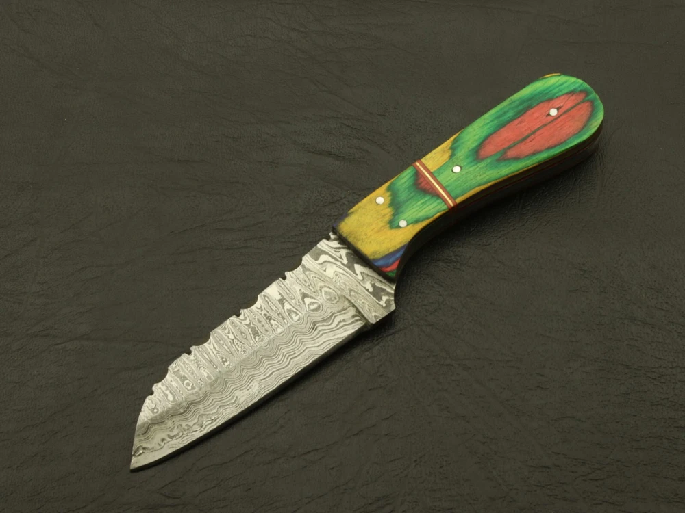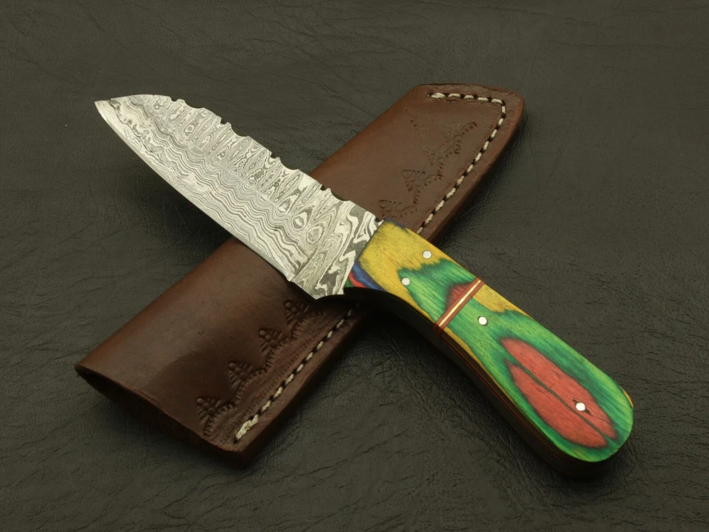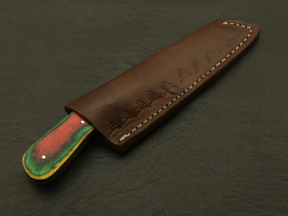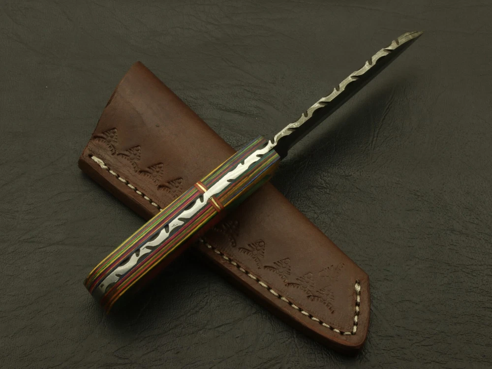 If you’re looking for a fixed blade knife that will be a reliable companion, look no further! This knife epitomizes the bold. The main qualities that make it great: sturdiness, sharpness, and looks. The ergonomic design is easy to hold and carry with the included leather sheath. Great for survivalists, tactical personnel, outdoors-men or anyone who appreciates fine craftsmanship and an amazing blade. The blade is Damascus steel, Cutting edged, and classical sharp. It's sturdy enough to last through even the harshest conditions. The handle is beautifully polished, with real rose wood & pakka wood . Designed to feel comfortable and natural in the hand. Even in different conditions, you'll feel confident that the knife will stay firmly within your grasp. Included with the knife is a genuine leather It's brand · Overall Length: 7” · Blade Length: 3.5” · Handle Length: 3.5” Handle is made of rose wood & pakka wood Care Instructions: Keep the blade dry after each cleaning. Warning: Take care when removing product from packaging. Keep fingers clear of blades. Store away from children Complimentary gift messages *Gift wrapping service available for minimal additional fee ADD ONS: *Custom orders for 10 or more pieces. You can choose & submit your own handle or design. LIFETIME WARRANTY No premium knife is complete without a lifetime warranty; our masterpiece knife is fully covered for life, We do sell wholesale, please contact us for special discounts on bulk orders. FEEDBACK POLICY: YOUR FEEDBACK IS VERY IMPORTANT FOR US, IF THEIR IS ANY KIND OF PROBLEM PLEASE GIVE US OPPORTUNITY TO SORT THE ISSUE