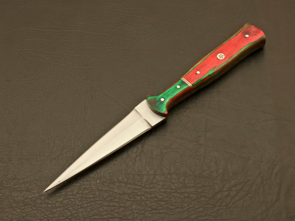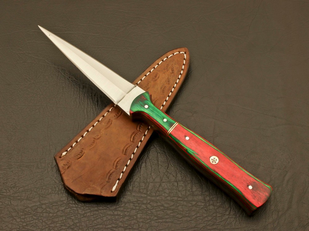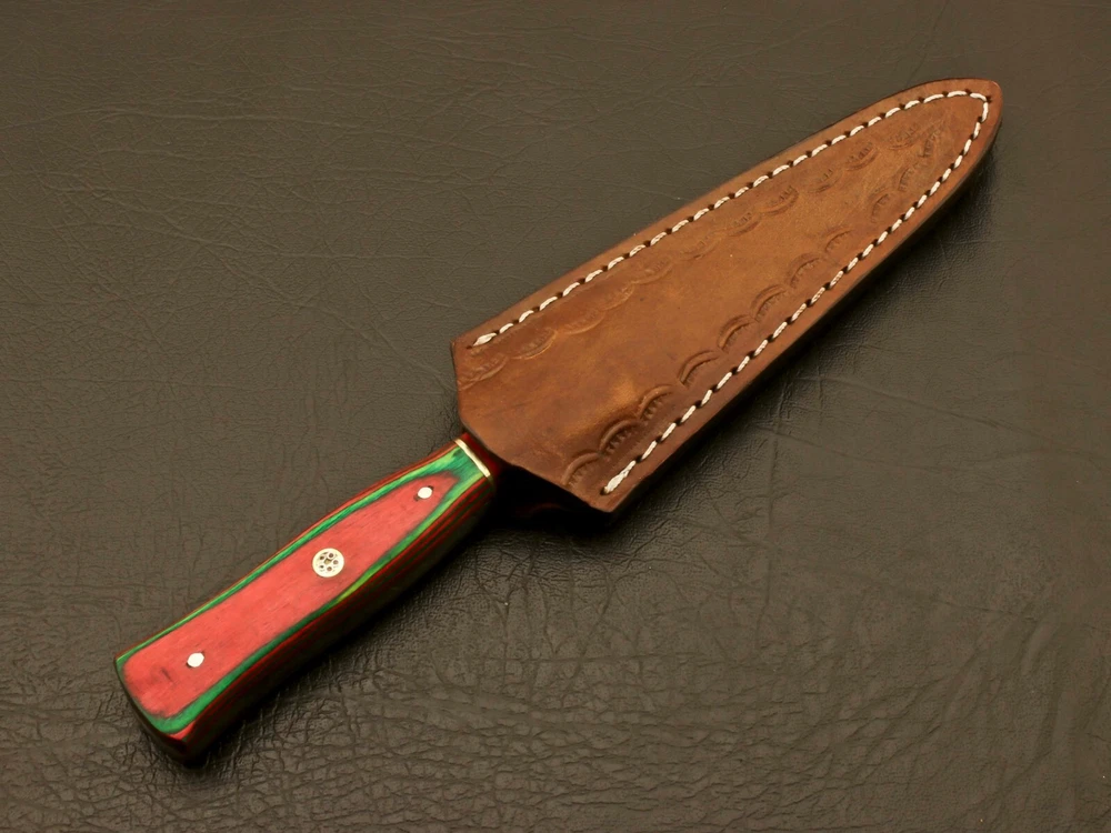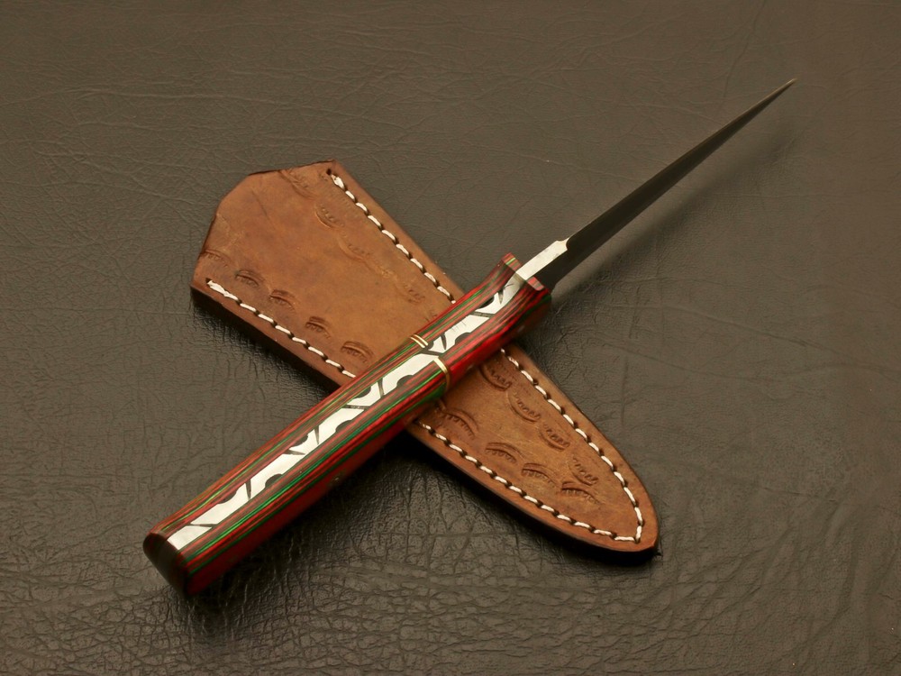 This superb design knife is hand forged. Blade of this knife has a nice file work and is made of 512 layers of stainless steel and high D2 steel with hardness 55-60 HRC . This robust knife is lab tested under intense conditions,; the balance and shape of this knife ensures perfect grip.Superb Looking Handle of this Unique Knife is made of Beautiful Hard Wood & Rose Wood Scales fastened with steel pins and strong epoxy for life time durability. Blade has given excellent heat treatment and rock well hardness of the blade along its edge is 50 to 54 and along the spine is 42-45. ''All of our knives are 100% hand crafted. True quality material used to form the blade. The handle materials, blade steels, and leather sheaths are made professionally with no expense spared. Great handle fitting, exception sharp edge, nicely balanced grasp Overall Length : 9" inch Handle Length : 4.5" inch Blade Length : 4.5" inch Damascus Design: Twist Pattern Layers: 512 Sheath: Leather Hand Forged Care Instructions: Keep the blade dry after each cleaning. Warning: Take care when removing product from packaging. Keep fingers clear of blades. Store away from children. Complimentary gift messages *Gift wrapping service available for minimal additional fee ADD ONS: *Custom orders for 10 or more pieces. You can choose & submit your own handle or design. LIFETIME WARRANTY No premium knife is complete without a lifetime warranty; our masterpiece knife is fully covered for life, We do sell wholesale, please contact us for special discounts on bulk orders. FEEDBACK POLICY: YOUR FEEDBACK IS VERY IMPORTANT FOR US, IF THEIR IS ANY KIND OF PROBLEM PLEASE GIVE US OPPORTUNITY TO SORT THE ISSUE