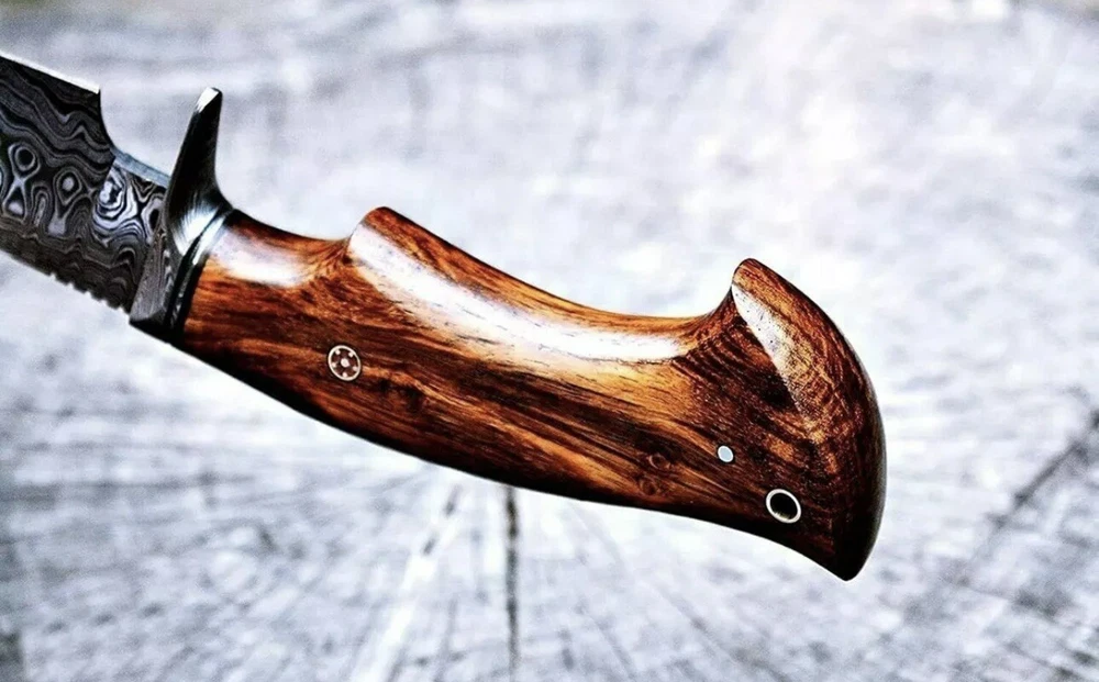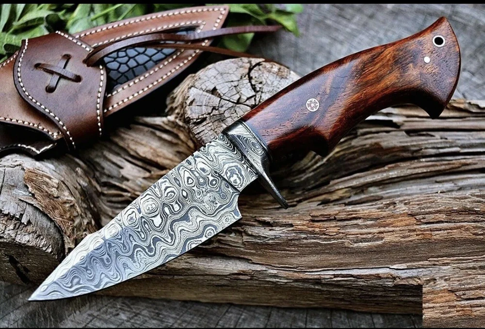 This custom handmade Damascus Steel Bowie Hunting Knife features a beautiful rose wood handle and a clip point blade made of high-quality Damascus Steel. The knife is over 5 inches in length and has a plain edge blade color. It is an original piece and was made in the United States. The knife comes with a sheath and features a hollow handle for added comfort and ease of use. This modern fixed blade knife is perfect for hunting and everyday use. The handle is made of wood and the knife is handmade, making it a unique and special addition to any collection.