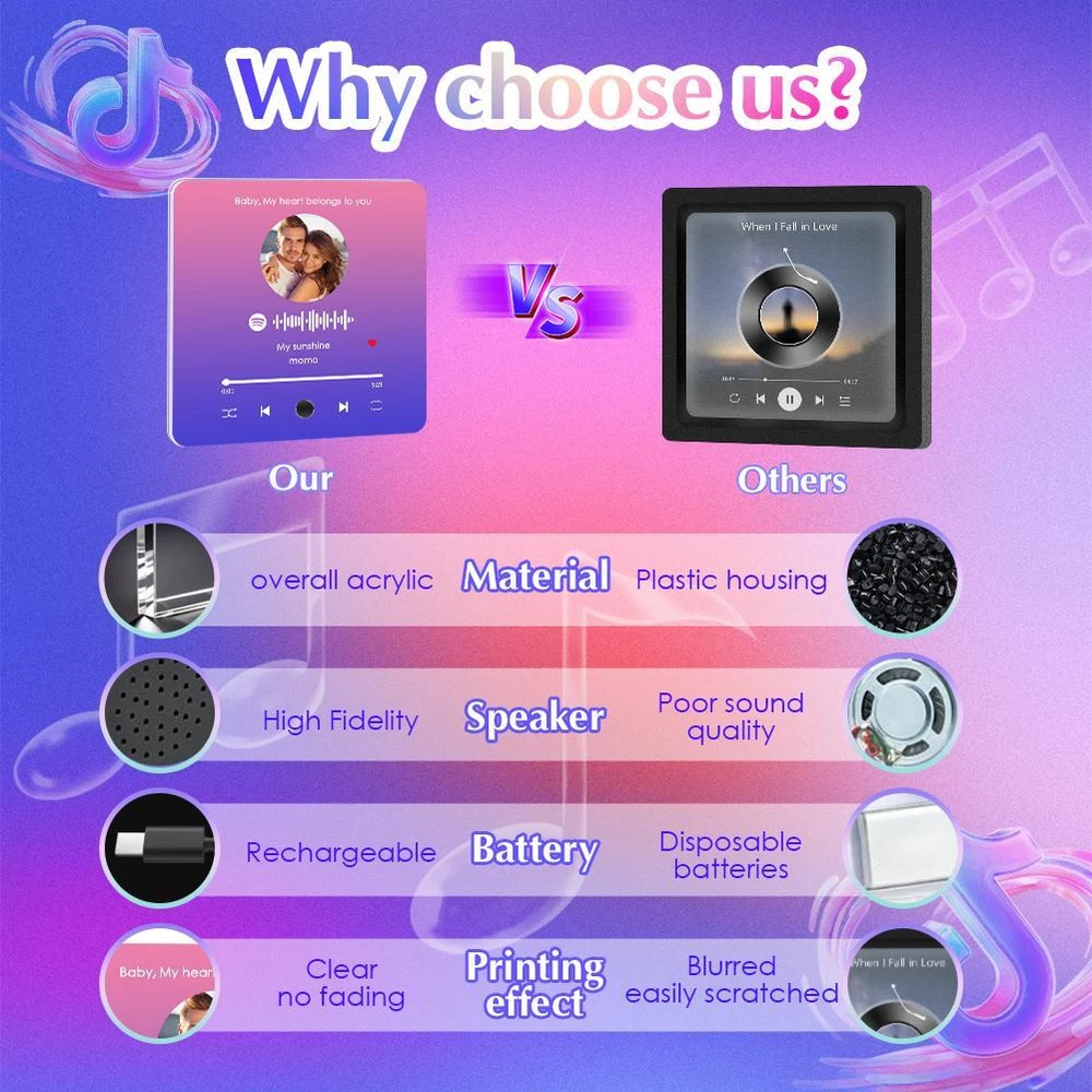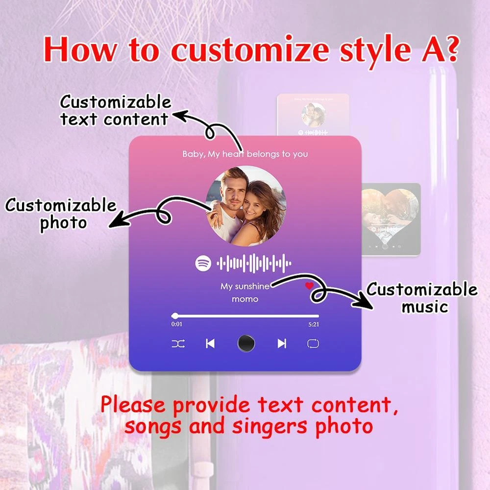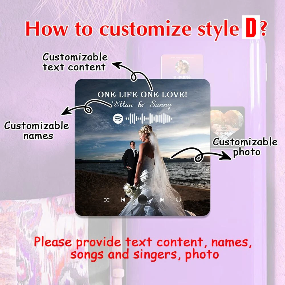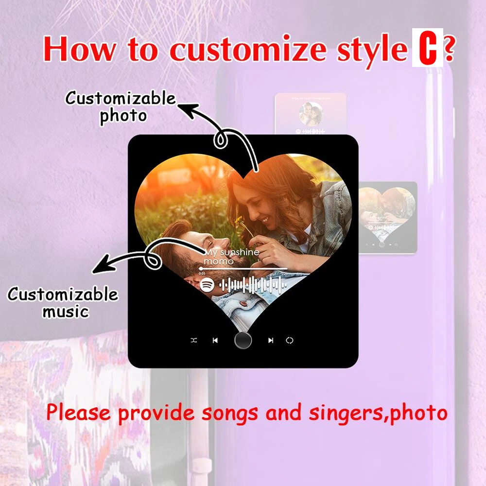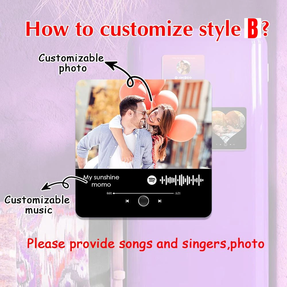 Description Description&Preview shipping&policy Description: Parameter: Material:Acrylic Shape: Rectangular Size: 10.8*10.8*2.2cm/4.25*4.25*0.86inch Custom Music Album Magnet: Personalize your fridge magnet with your favorite song, artist name, and a memorable photo. This magnet mimics a mini album cover and plays music, turning your fridge into a musical showcase. Personalized Photo & Album Cover: Create a unique display by adding your own photo and song details to the magnet. Its perfect for immortalizing special moments or creating a custom music album tribute for your loved ones. Built-In Music Player: This fridge magnet features an embedded music player that lets you play your chosen track with just a click. Control your music right from your kitchen or any magnetic surfaceeasy and convenient. Perfect Gift for Music Lovers: Surprise your friends, family, or partner with this custom music fridge magnet. Ideal for anniversaries, birthdays, weddings, or any occasion, its a one-of-a-kind gift that combines music, memories, and home decor. Quick Charging & Long Playtime: Recharge your custom music fridge magnet effortlessly using a Type-C charging cable. With just 15 minutes of charging, youll unlock up to 2 hours of continuous playback, making it perfect for spontaneous moments and extended listening sessions. Whether you're enjoying background music or setting the mood for gatherings, the quick charge ensures your music is always ready when you are. Package 1pcs Customized Music Fridge Magnet Preview: Thank you for your purchase Problems? You can follow below process to contact us. There is a time zone difference,but we will do our best to quickly response to your questions: Shipping ● We will arrange shipping for you within 24 Hours after payment cleared except the holidays. ● We always send the item to the address you give us on Payoneer to ensure the security of the item. If you have changed your address, or want us to ship to another address, please change to the new address when you pay us with Payoneer, otherwise we will not be responsible if the package is lost. Payments We accepts Payoneer only If you have any questions about the payment,please contact us through eBay message. Import Duties In case some duty is due Upon delivery, it is your responsibility to meet that expense and this may cause delays to delivery schedule and you may have to pickup goods at the customs office. Terms & Conditions By bidding on this item,the Buyer agrees to all of the terms and conditions as outlined in this listing .please ensure to read and agree to All eBay terms and Conditions before bidding. All pictures are for illustration purpose only and Colours may vary slightly. Our store obeys all eBay Rules and Policies. Returns Policy To Return an item you must contact us and take photos of your item to clearly show any damage or unusual aspects of it. Approved returns will be subject to inspection on arrival. Items must be returned in original condition with all original packaging. All shipping and handing charges are non-refundable Return delivery costs are the responsibility of the buyer. We will cover the cost if sending replacement/repaired items. Within 7 days after receiving your products, we offers a no-hassle 7 day exchange/replace only if your items are found to be defective by manufacturer.