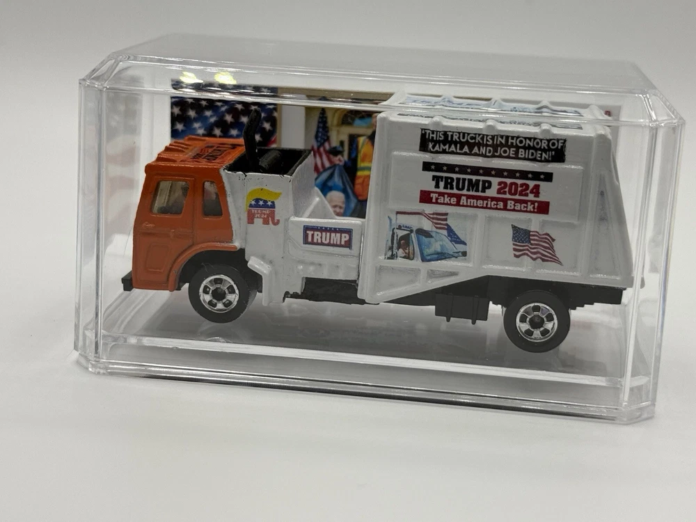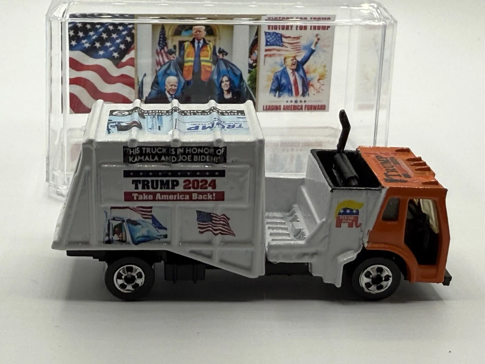 Celebrate the victory of President Donald Trump with this custom Hot Wheels 1982 Trash Truck. The orange diecast vehicle is a 1:64 scale model of the iconic Garbage Truck from the Hot Wheels Hot Trucks series. Comes in acrylic case. This collectible toy is perfect for fans of the President and Hot Wheels alike. Featuring the year of manufacture 1982, this Trash Truck is a must-have for any serious collector. The vehicle type is a classic trucks and vans category, and it is made of high-quality diecast material. Add this unique piece to your collection today and show off your love for both Hot Wheels and President Donald Trump.