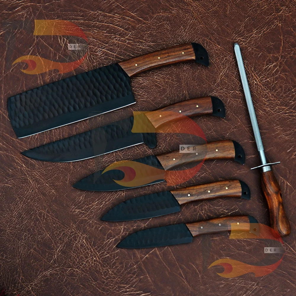 CUSTOM HAND FORGED STAINLESS STEEL BLACK COATED CHEF KITCHEN KNIFE SET Type: BBQ Knife/Chef's Knife Handle Material: Wood with Steel Bolsters with Mosaic pins Blade Material: Hand Forged Stainless Steel Black coated 15N20 and 1095 Carbon Steel Leather Sheath: Original leather Sheath made of Suede leather it is also called leather Roll Overall Length : 13.5"-12.5"-10.5"-10.5"-9.5" Inches Blade Length: 8"-8"-6"-6"-5" inches Handle Length: 4.5" Inches Knife Type: Kitchen / chef knife Note: This is a catalog picture. You will receive the knife as shown in the picture but the blade patterns and handle material may vary slightly due to natural material used. This item is hand forged! Tips to care the Knife Do Not put the knife in the pouch for very long time.It can take rust due to high Carbon. Use oil on the blade after use. Always clean your knife after use Complimentary gift messages *Gift wrapping service available for minimal additional fee ADD ONS: *Custom orders for 10 or more pieces. You can choose & submit your own handle or design. LIFETIME WARRANTY No premium knife is complete without a lifetime warranty; our masterpiece knife is fully covered for life, We do sell wholesale, please contact us for special discounts on bulk orders. FEEDBACK POLICY: YOUR FEEDBACK IS VERY IMPORTANT FOR US, IF THEIR IS ANY KIND OF PROBLEM PLEASE GIVE US OPPORTUNITY TO SORT THE ISSUE