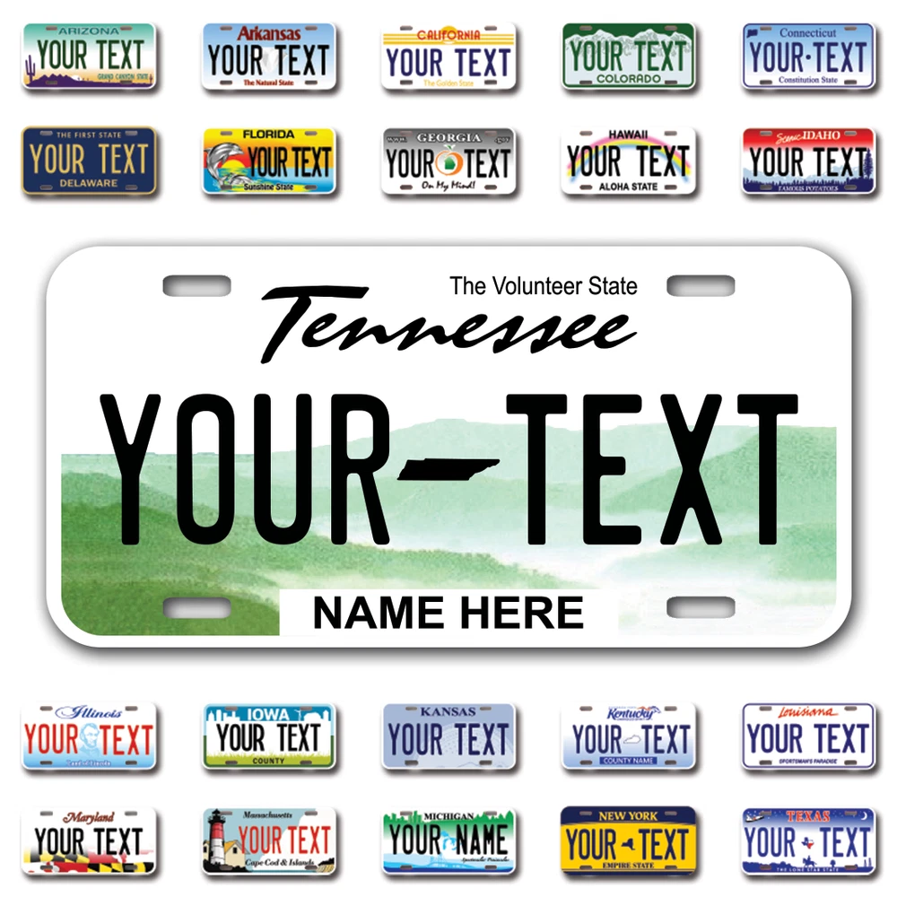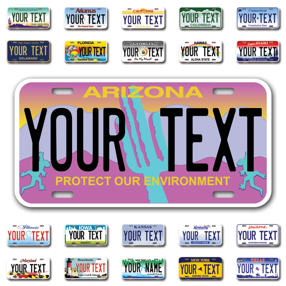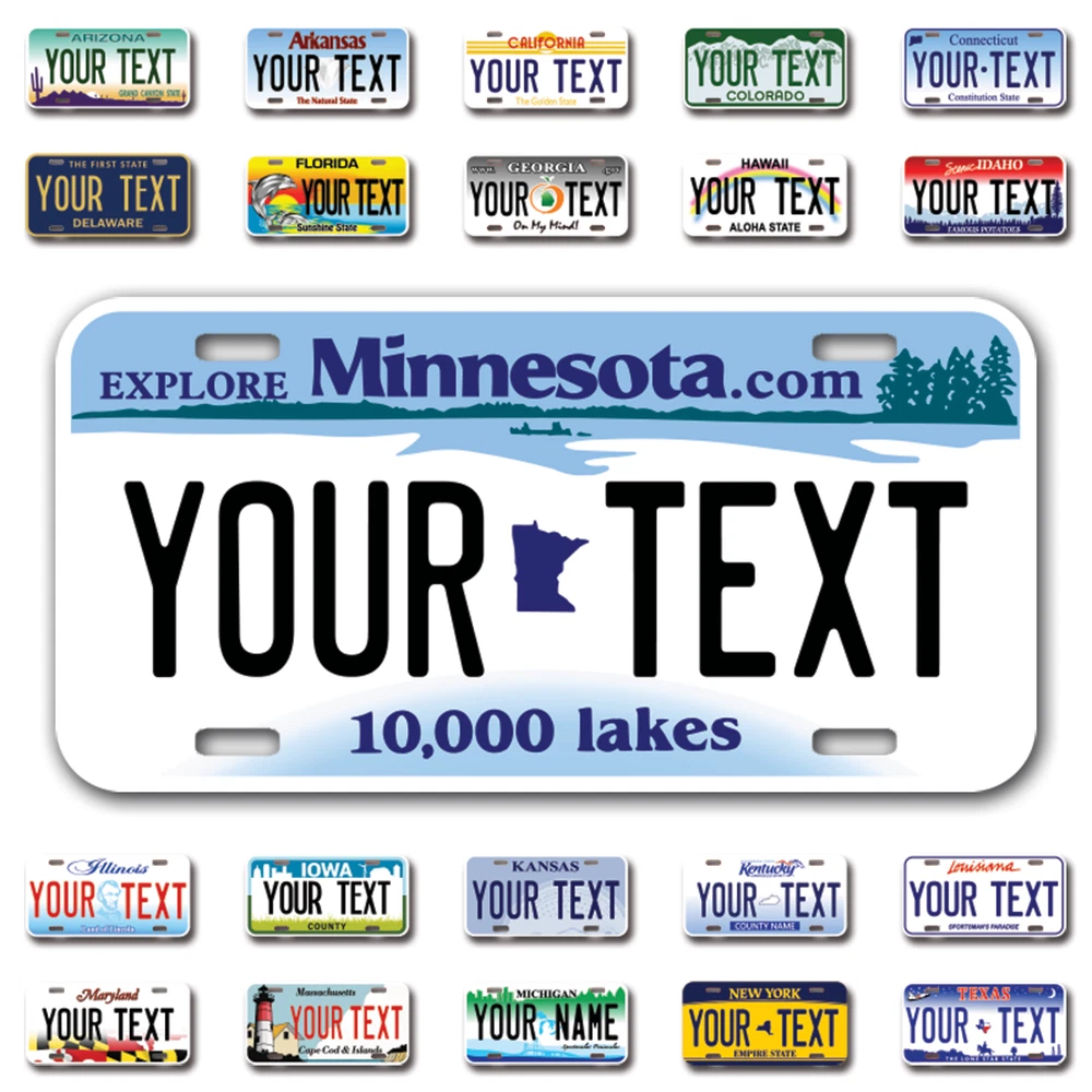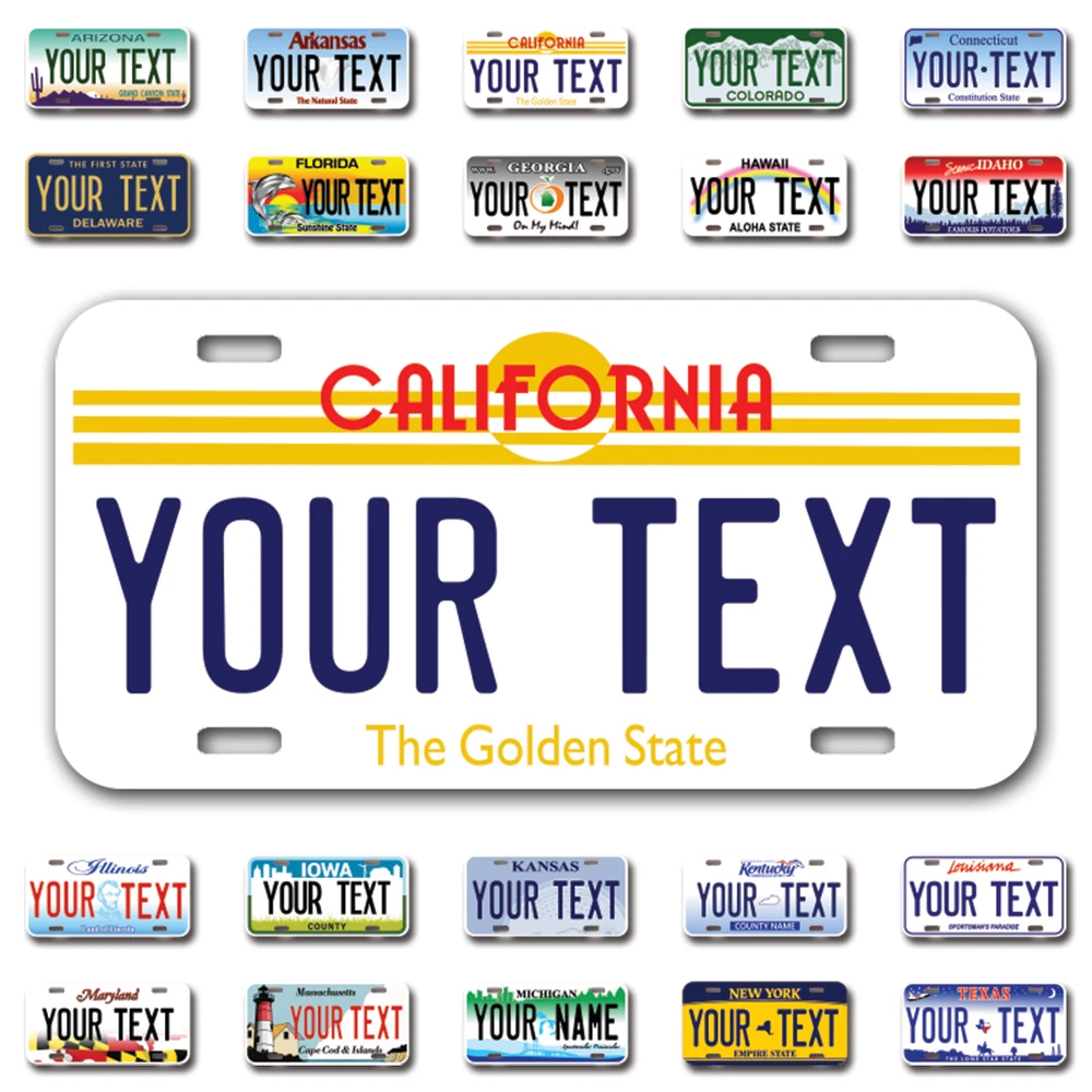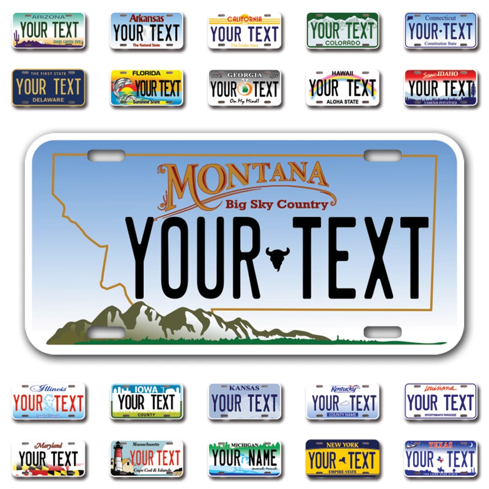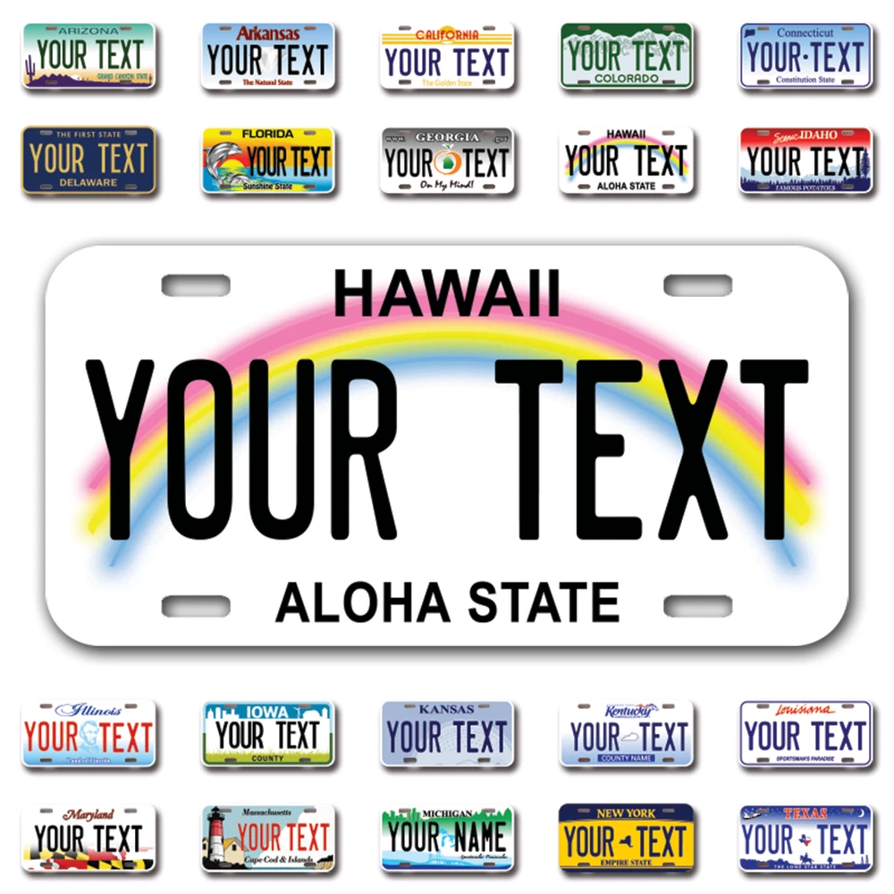 Our LICENSE plates are the most unique souvenirs from the United States, Choose between 50 states and 3 different sizes. Cannot be used in place of a state issued plate. IMPORTANT DESCRIPTION • Plates are made using High quality thick 040 rust free Aluminum. • Our plates are printed flat, not raised. The customizing is done using the latest UV Laser technique for weatherproof and high-quality finish. • 100% made in USA. • Standard car plate has four holes and can be used for trucks, motor homes, and more • M otorcycle plates have 2 holes on top for mounting and can be used on ATVS, Mopeds, Snowmobiles, wheelchairs and golf carts • B ike plates have two holes on top and can also be used for toy cars, wagons, electric toy cars, tricycles and more • Write your text in the personalization section. The text will be copied and pasted on the license plate as sent, so make sure of the spelling, punctuation, capitalization, etc. If you have any question regarding your text or you would like a preview, please let us know by adding a note or contacting Alabama | Alaska | Arizona | Arkansas | California | Colorado | Connecticut | Delaware | Florida | Georgia | Hawaii | Idaho | Illinois | Indiana | Iowa | Kansas | Kentucky | Louisiana | Maine | Maryland | Massachusetts | Michigan | Minnesota | Mississippi | Missouri | Montana | Nebraska | Nevada | New Hampshire | New Jersey | New Mexico | New York | North Carolina | North Dakota | Ohio | Oklahoma | Oregon | Pennsylvania | Puerto Rico | Rhode Island | South Carolina | South Dakota | Tennessee | Texas | Utah | Vermont | Virginia | Washington | West Virginia | Wisconsin | Wyoming