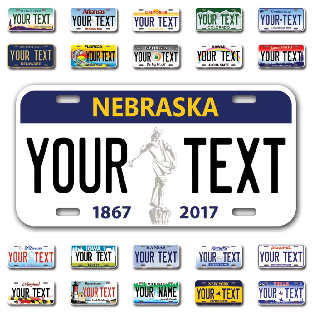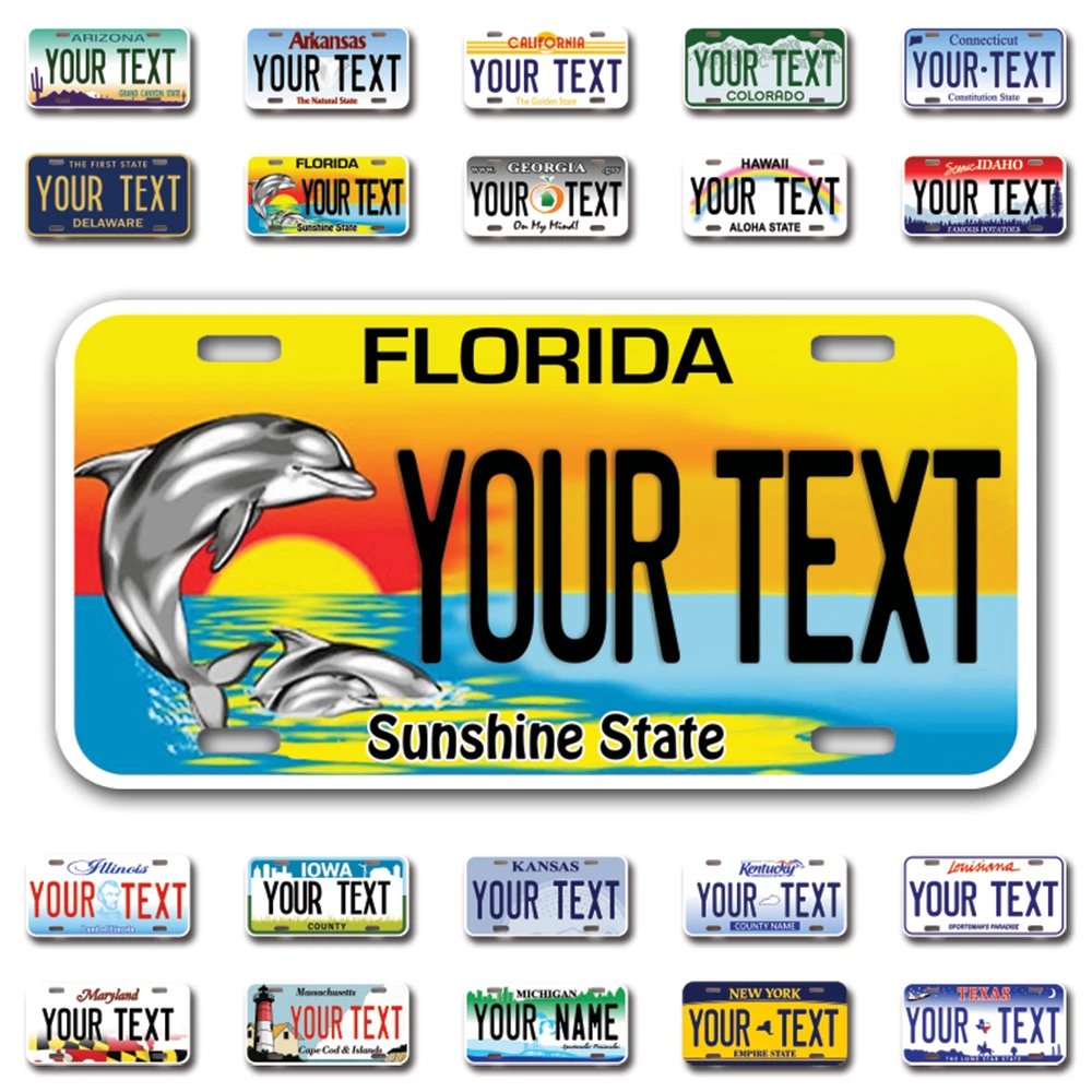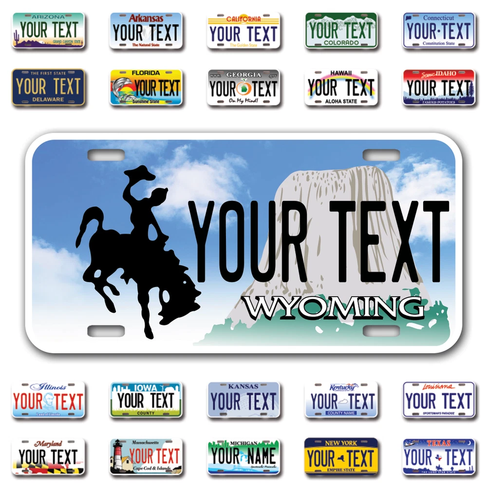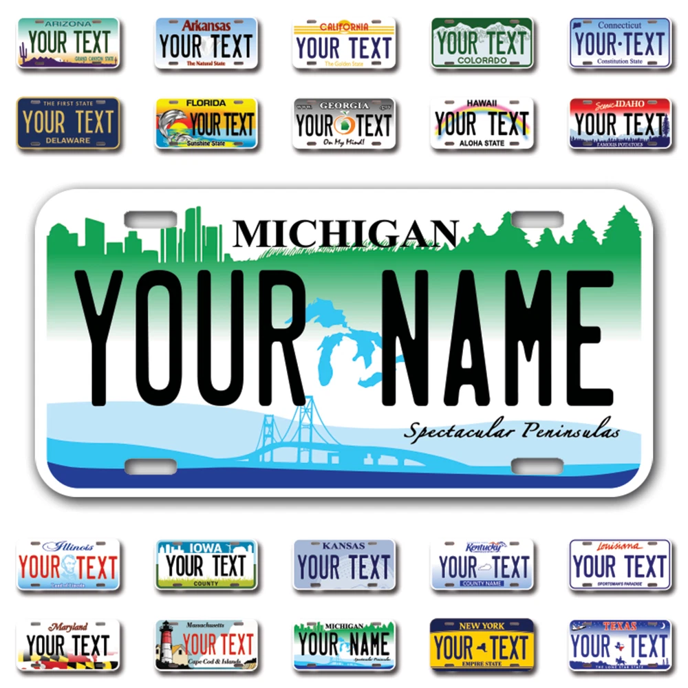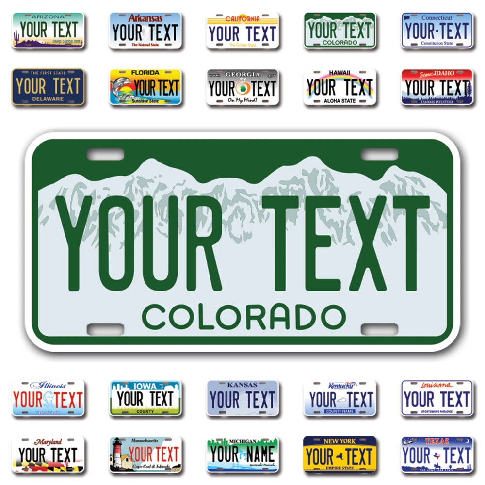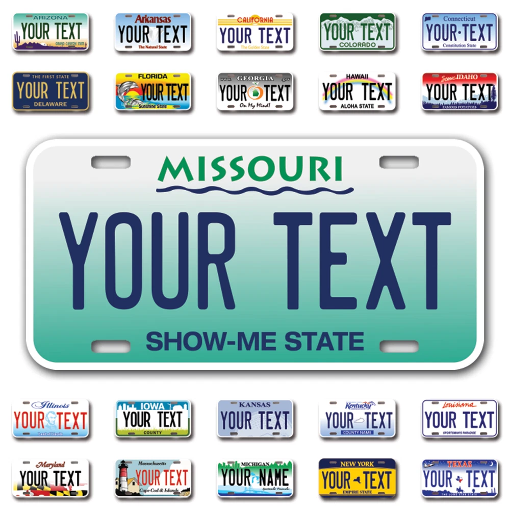 Our LICENSE plates are the most unique souvenirs from the United States, Choose between 50 states and 3 different sizes. Cannot be used in place of a state issued plate. IMPORTANT DESCRIPTION • Plates are made using High quality thick 040 rust free Aluminum. • Our plates are printed flat, not raised. The customizing is done using the latest UV Laser technique for weatherproof and high-quality finish. • 100% made in USA. • Standard car plate has four holes and can be used for trucks, motor homes, and more • M otorcycle plates have 2 holes on top for mounting and can be used on ATVS, Mopeds, Snowmobiles, wheelchairs and golf carts • B ike plates have two holes on top and can also be used for toy cars, wagons, electric toy cars, tricycles and more • Write your text in the personalization section. The text will be copied and pasted on the license plate as sent, so make sure of the spelling, punctuation, capitalization, etc. If you have any question regarding your text or you would like a preview, please let us know by adding a note or contacting Alabama | Alaska | Arizona | Arkansas | California | Colorado | Connecticut | Delaware | Florida | Georgia | Hawaii | Idaho | Illinois | Indiana | Iowa | Kansas | Kentucky | Louisiana | Maine | Maryland | Massachusetts | Michigan | Minnesota | Mississippi | Missouri | Montana | Nebraska | Nevada | New Hampshire | New Jersey | New Mexico | New York | North Carolina | North Dakota | Ohio | Oklahoma | Oregon | Pennsylvania | Puerto Rico | Rhode Island | South Carolina | South Dakota | Tennessee | Texas | Utah | Vermont | Virginia | Washington | West Virginia | Wisconsin | Wyoming
